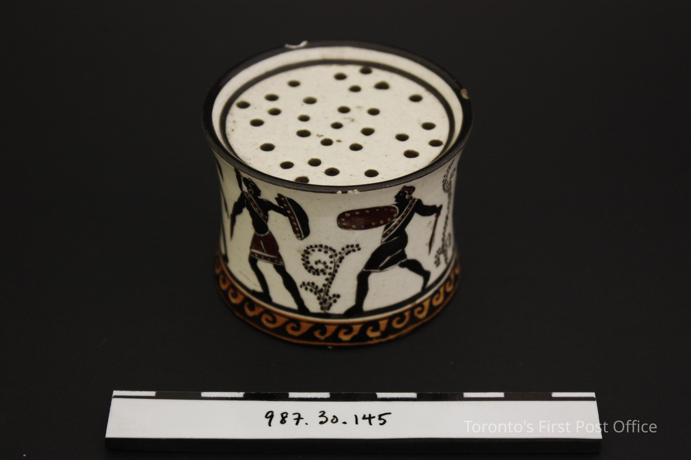 Sander; cylindrical shaped with pinched-in middle; off-white clay; medium brown wave design along bottom of base; black and brown classical motif figures; circa 1820; holes in top.Dimensions