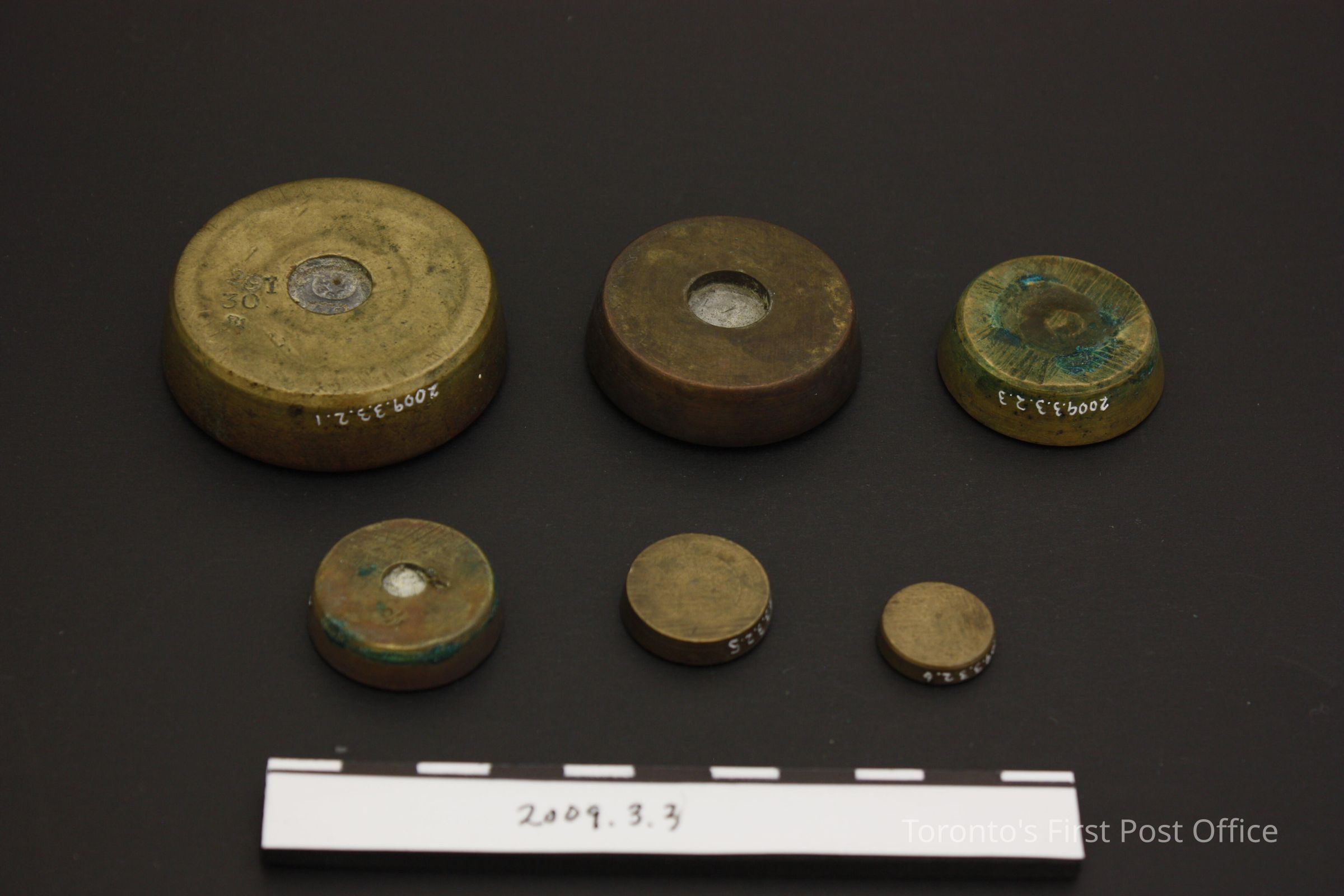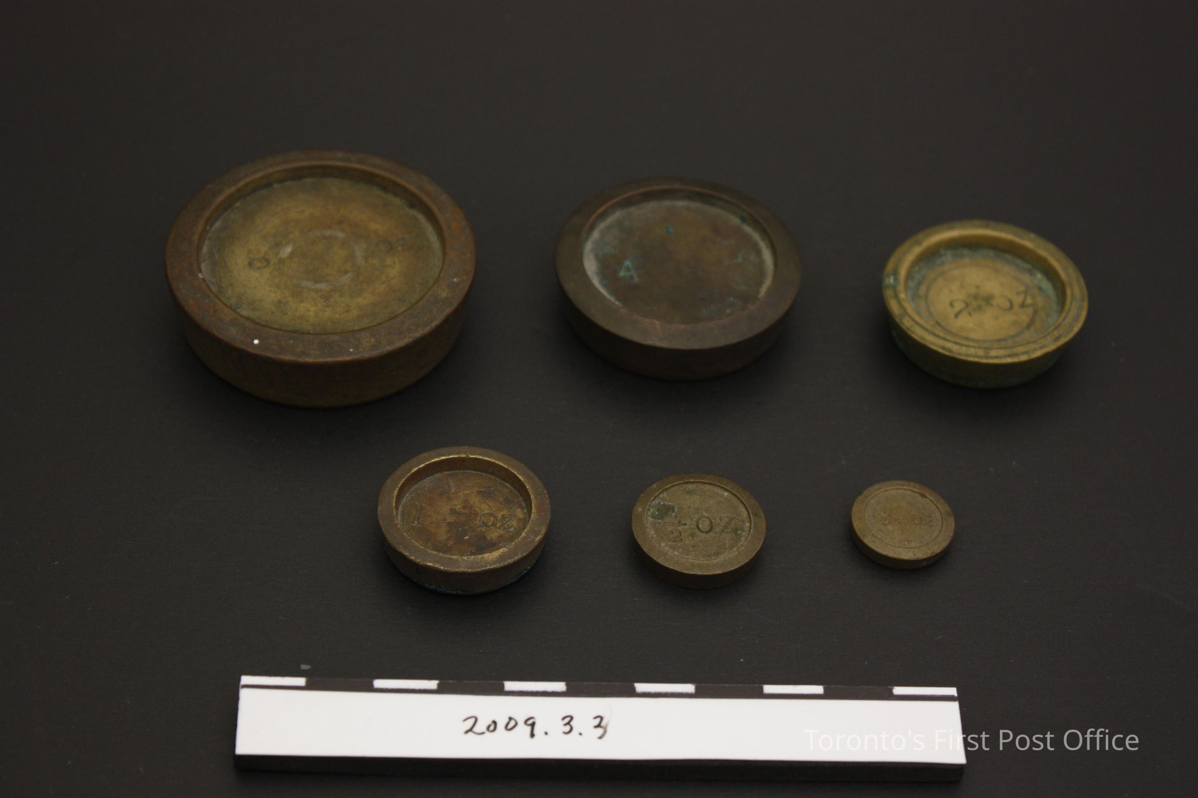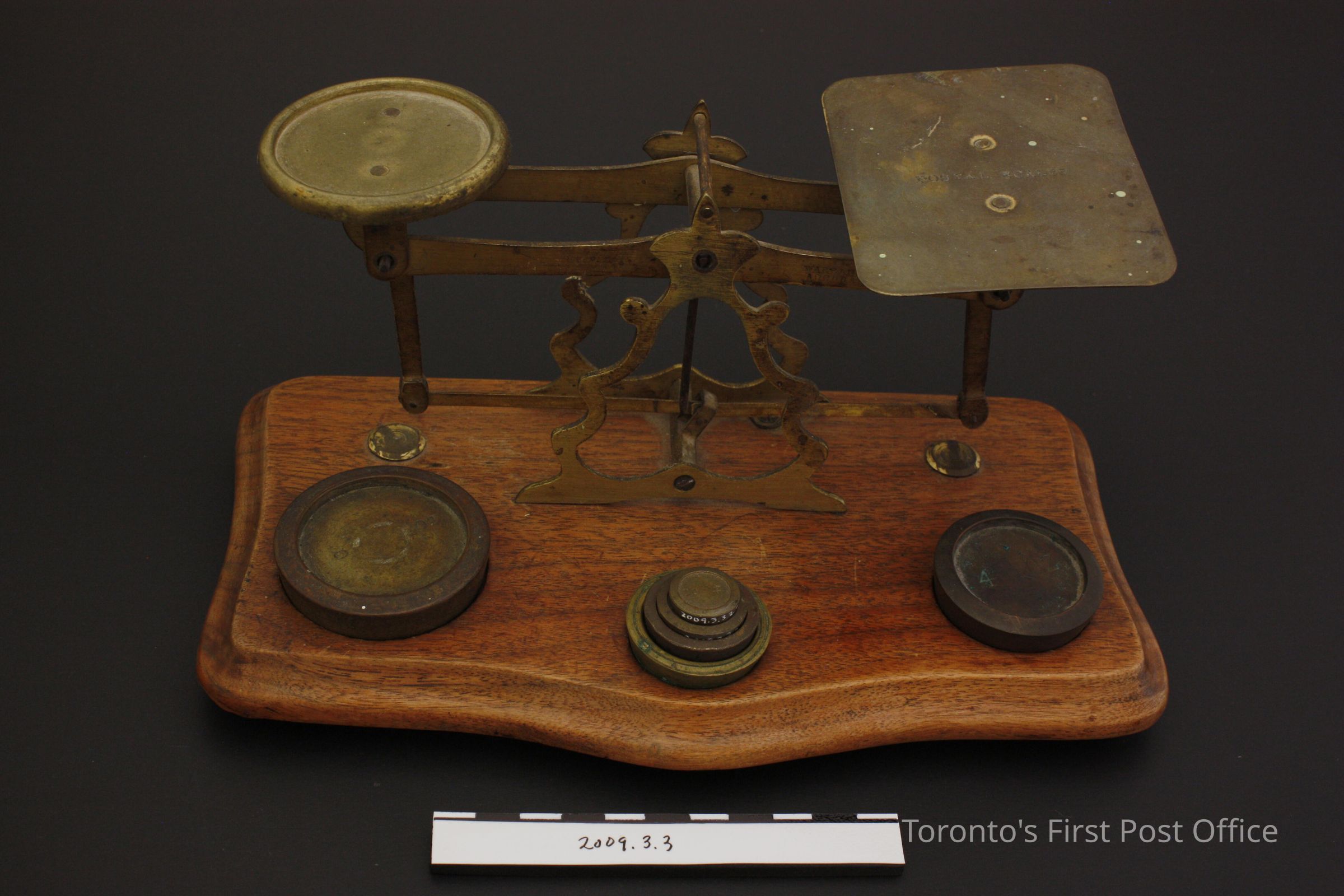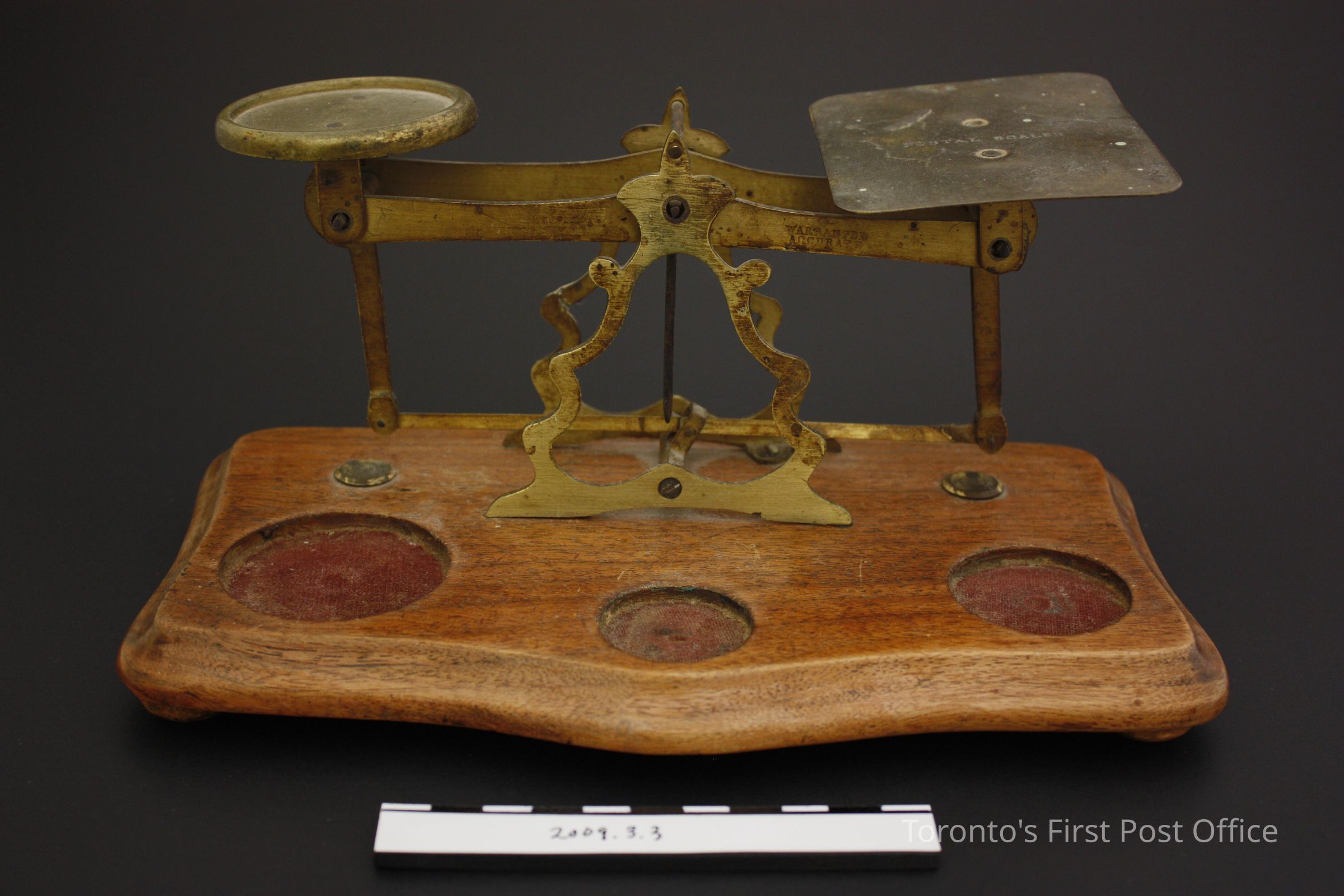 Postal scale on footed oak base with bevelled edges; two brass trays - one circular, one rectangular with rounded corners marked "POSTAL SCALES" - each supported by two brass arms; one arm on right marked "WARRANTED ACCURATE"; three insets in base for weights with worn red velvet-type material in each; wights included are as follows, all brass: 8 oz (.2.1); 4 oz (.2.2); 2 oz (.2.3); 1 oz (.2.4); 1/2 (.2.5); 1/4 oz (.2.6); c. 1850-1860.Dimensions