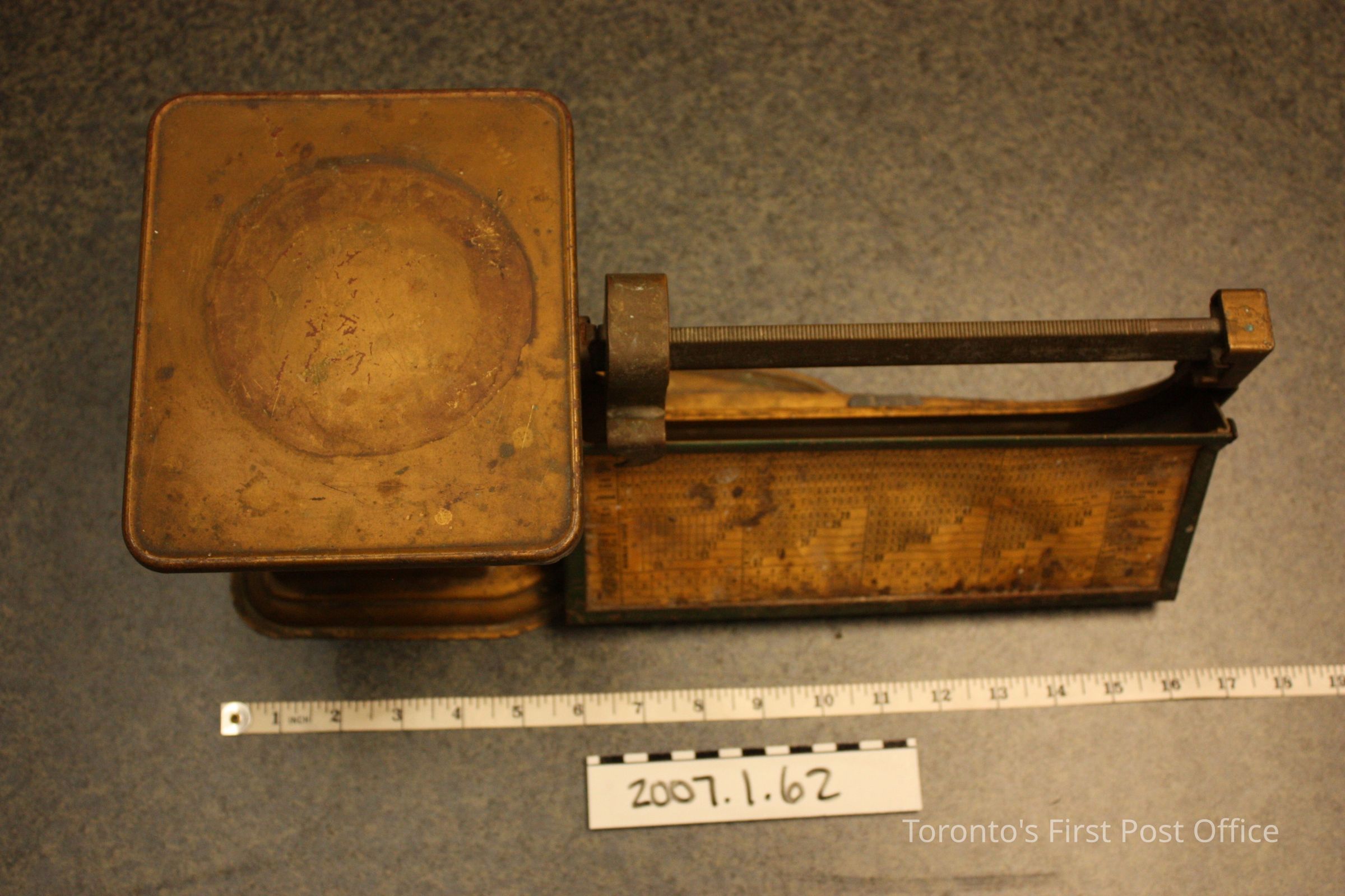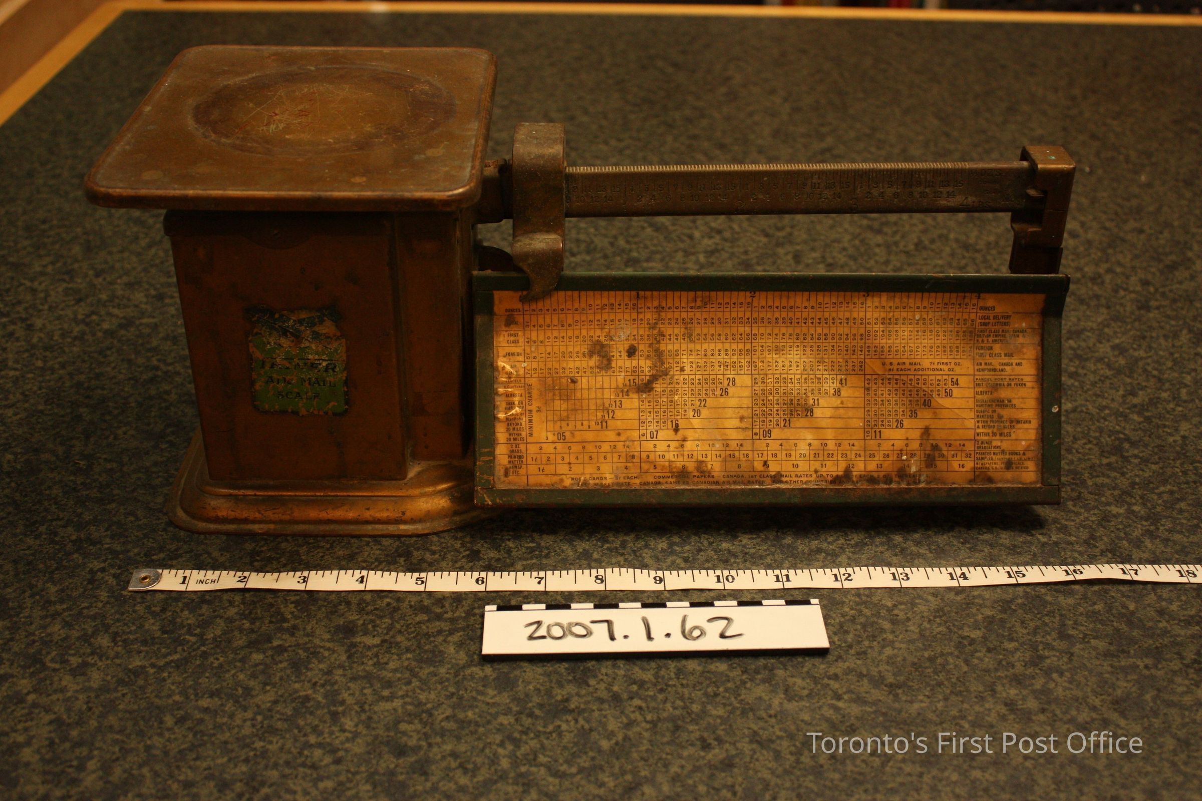 One air mail scale; brass body with copper tray and postage rate chart for ground and air mail to Canadian and U.S. destinations originating in Ontario; weighted arm balance with 4 lb. maximum weight; imprint on side: "TRINER SCALE & MFG. CO. CHICAGO. ILL."; c. 1945.Update Date