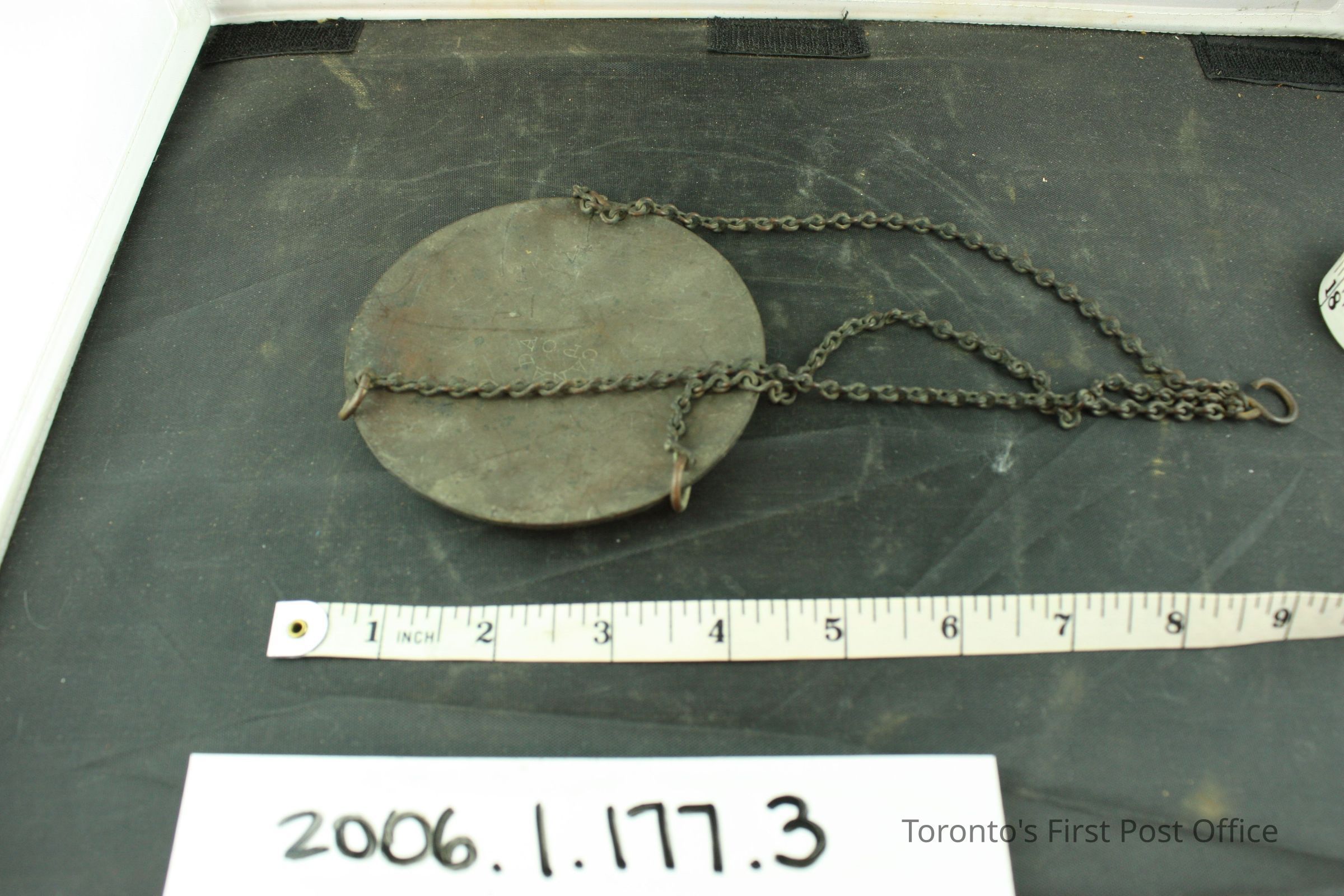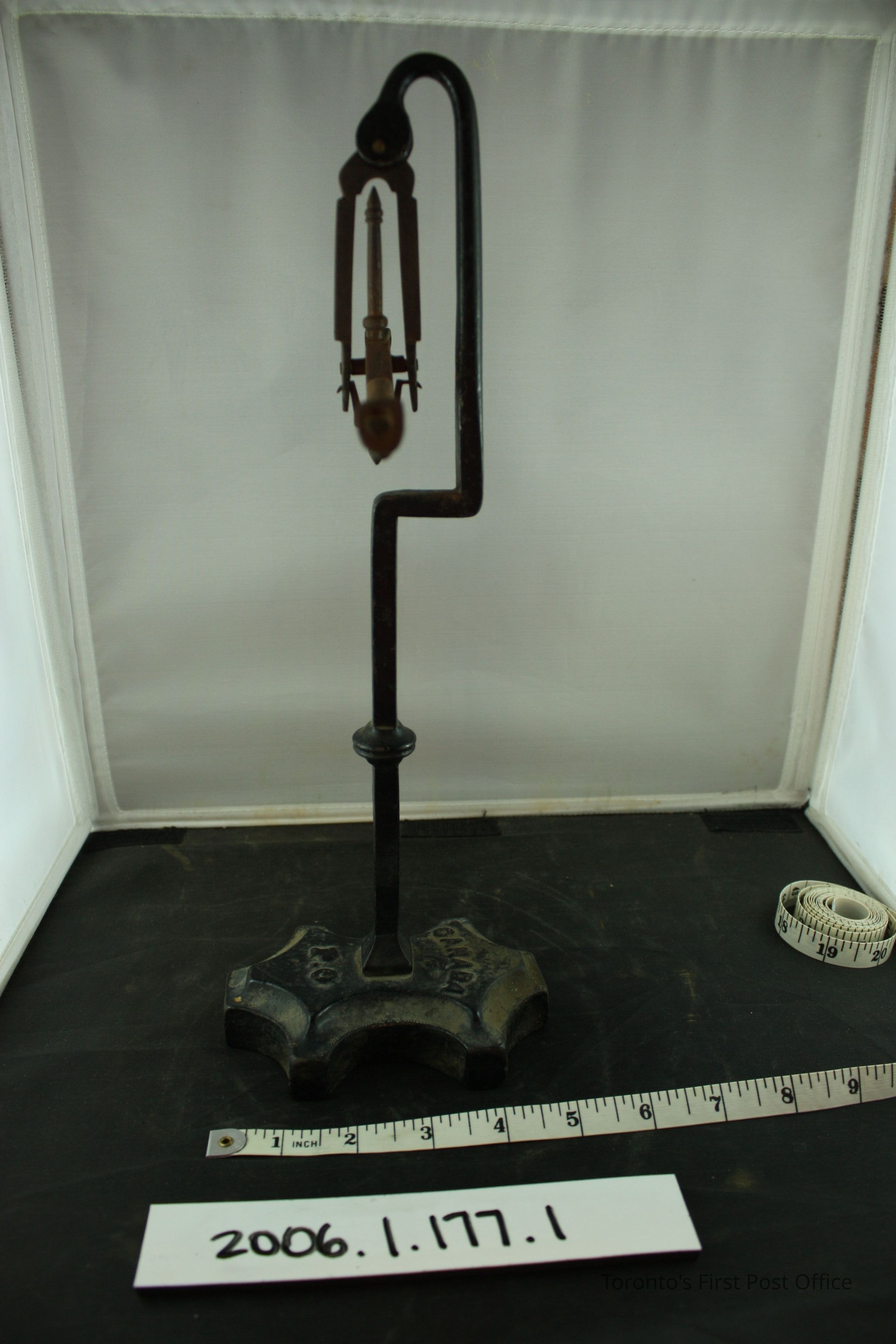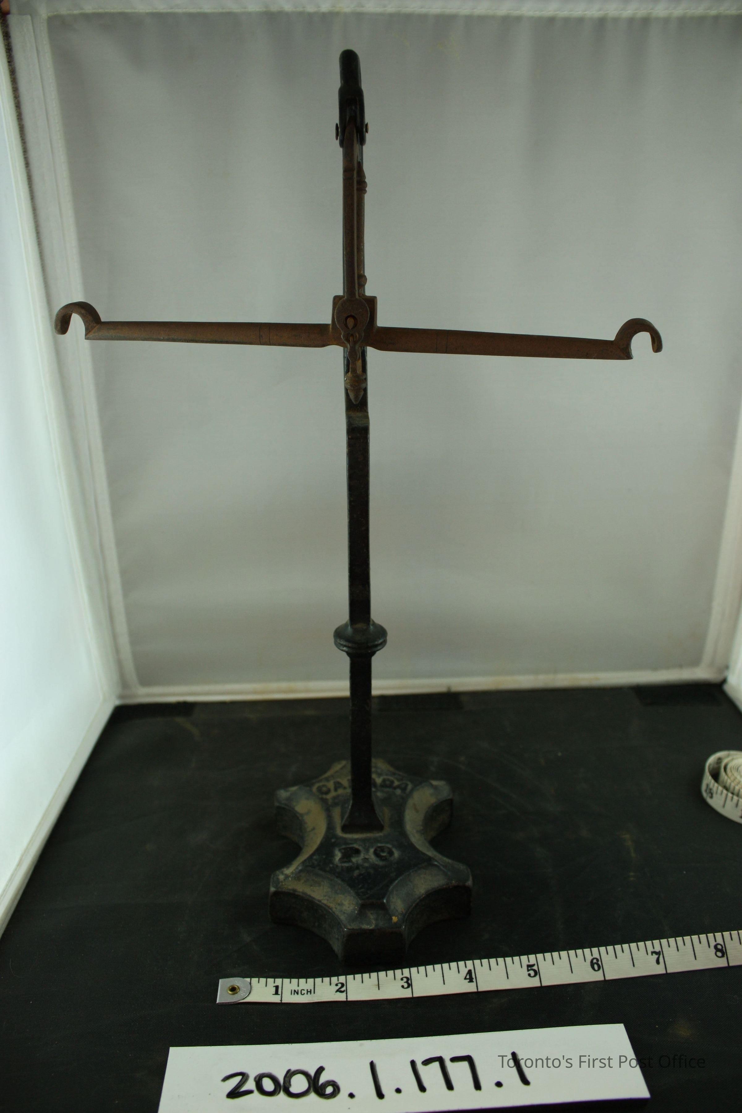 Postal scale; cast iron; stamped "CANADA P.O" on base; one arm has hooked cast iron unmarked weight; other arm has hooked brass flat pan hanging by three chains; pan stamped "CANADA P.O."; circa 1900.Dimensions