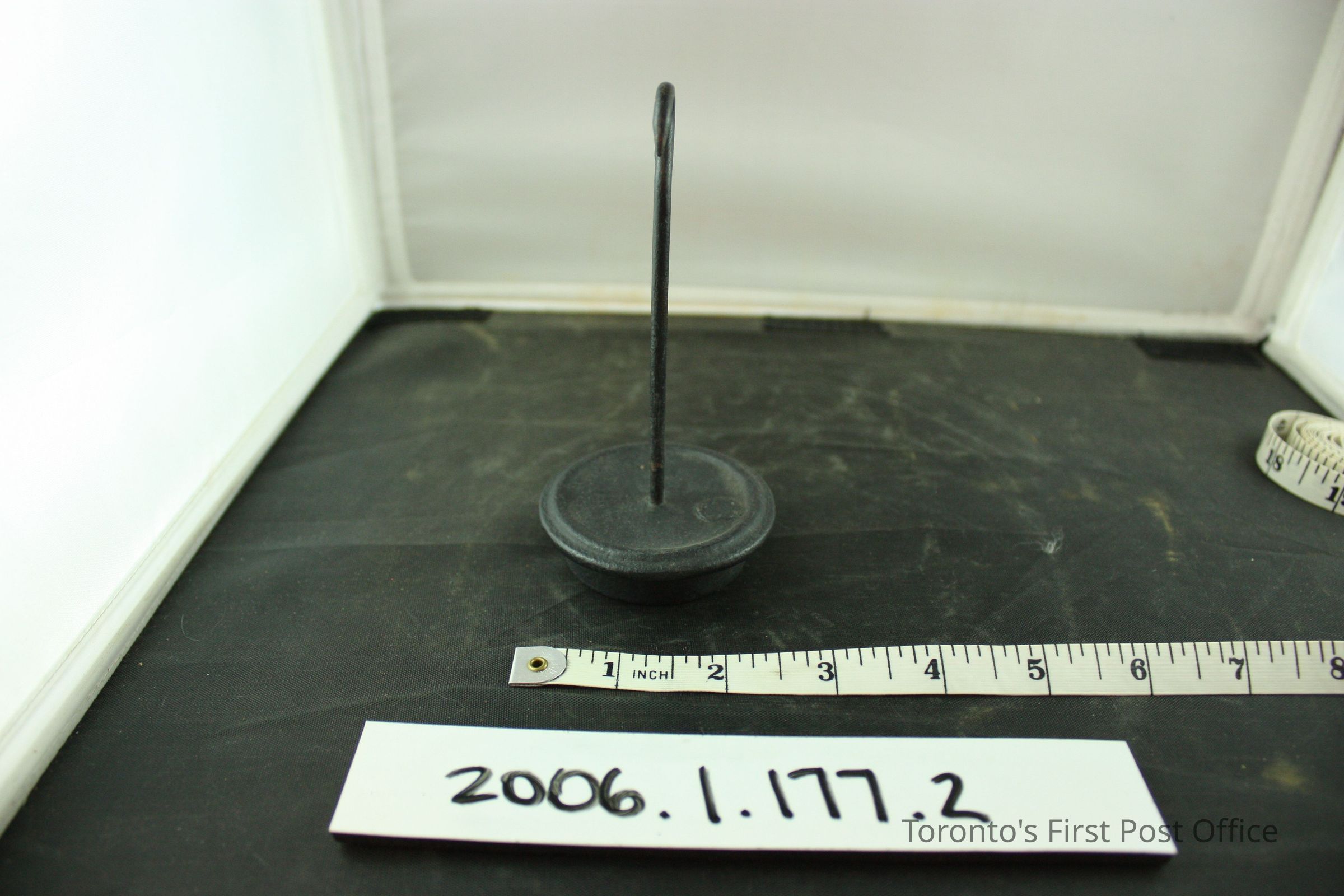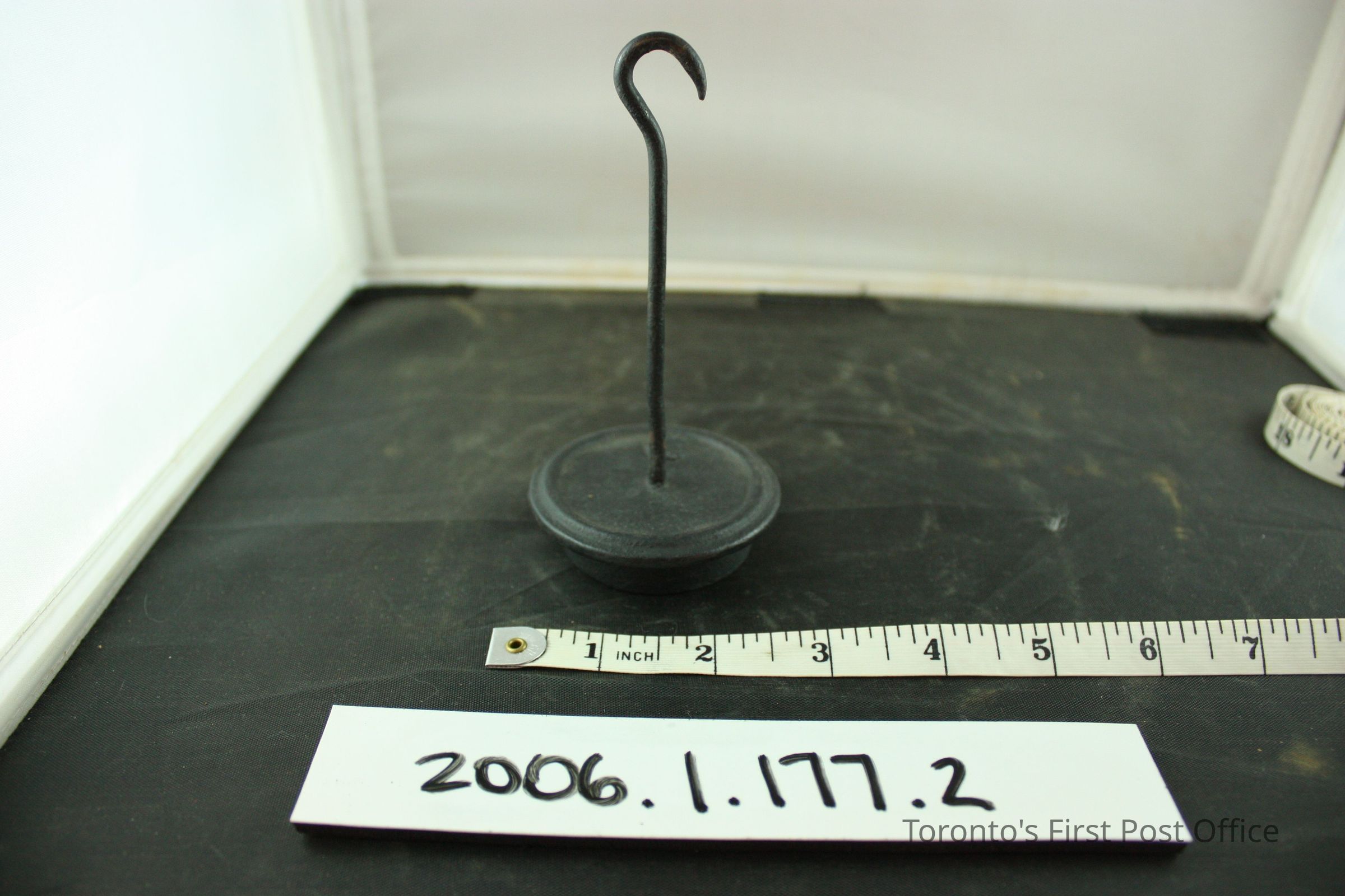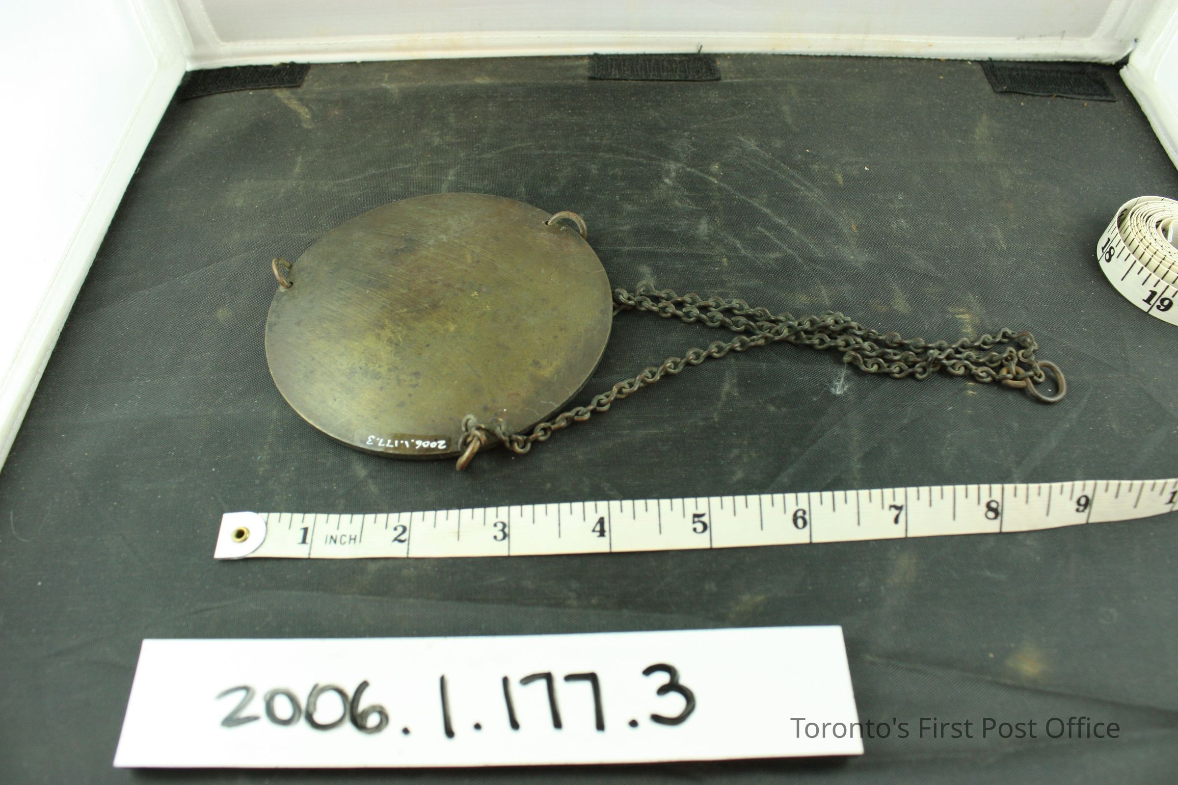 Postal scale; cast iron; stamped "CANADA P.O" on base; one arm has hooked cast iron unmarked weight; other arm has hooked brass flat pan hanging by three chains; pan stamped "CANADA P.O."; circa 1900.Dimensions
