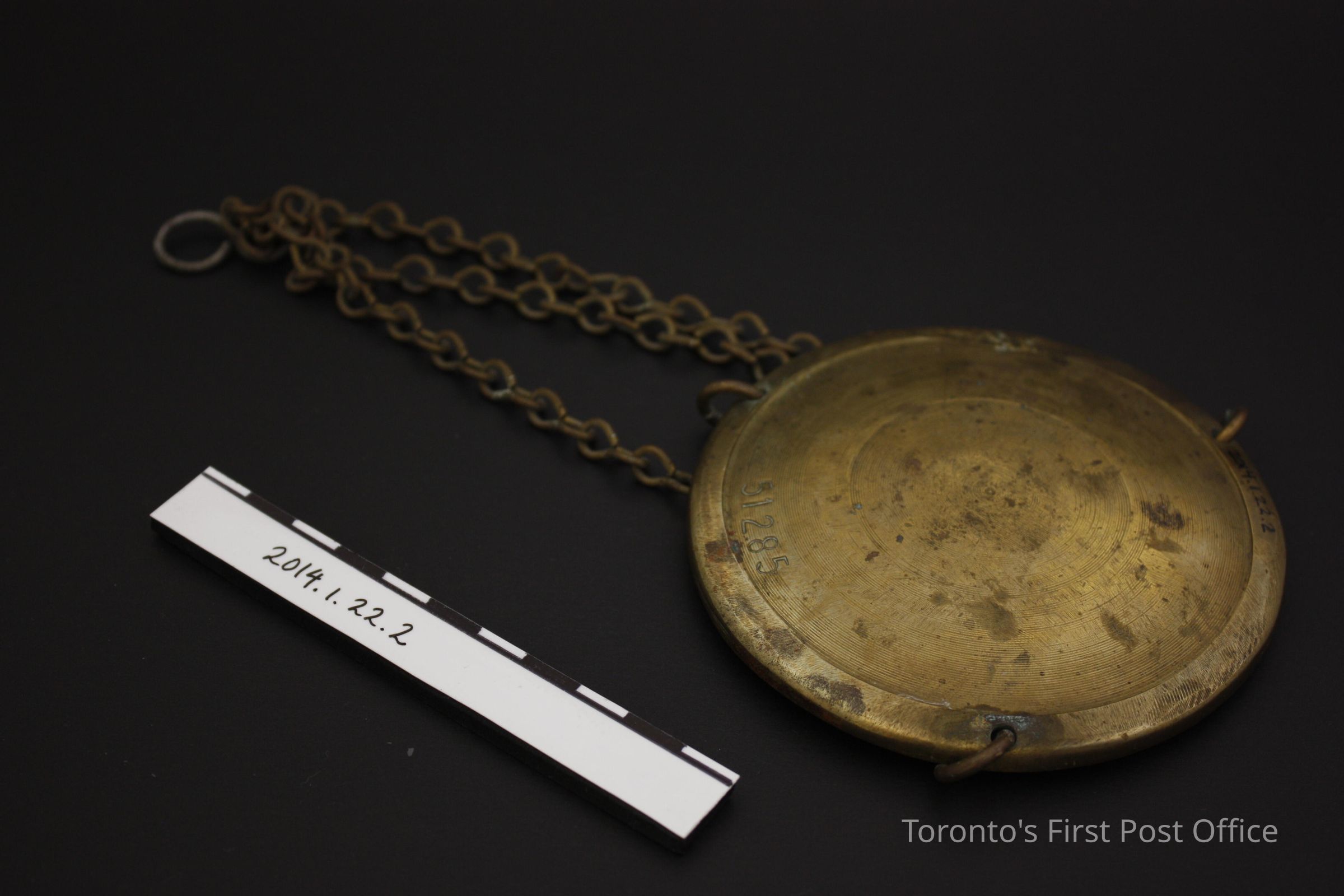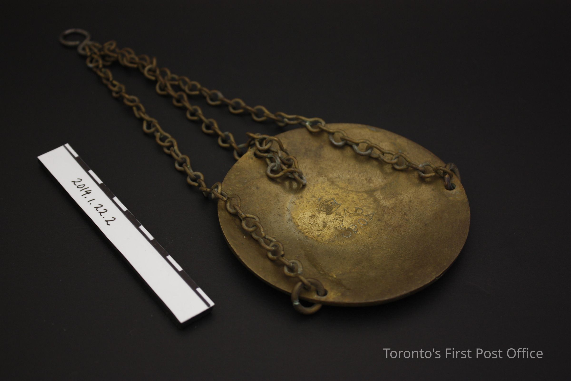 Brass postal scale pan. Circular pan with three (3) chains affixed to the outer edge; chains meet above pan, connected by a figure-eight metal ring. Marking on top of pan "Canada P.O." underneith Edwardian crown symbol. Marking on bottom of pan "51285".Update Date