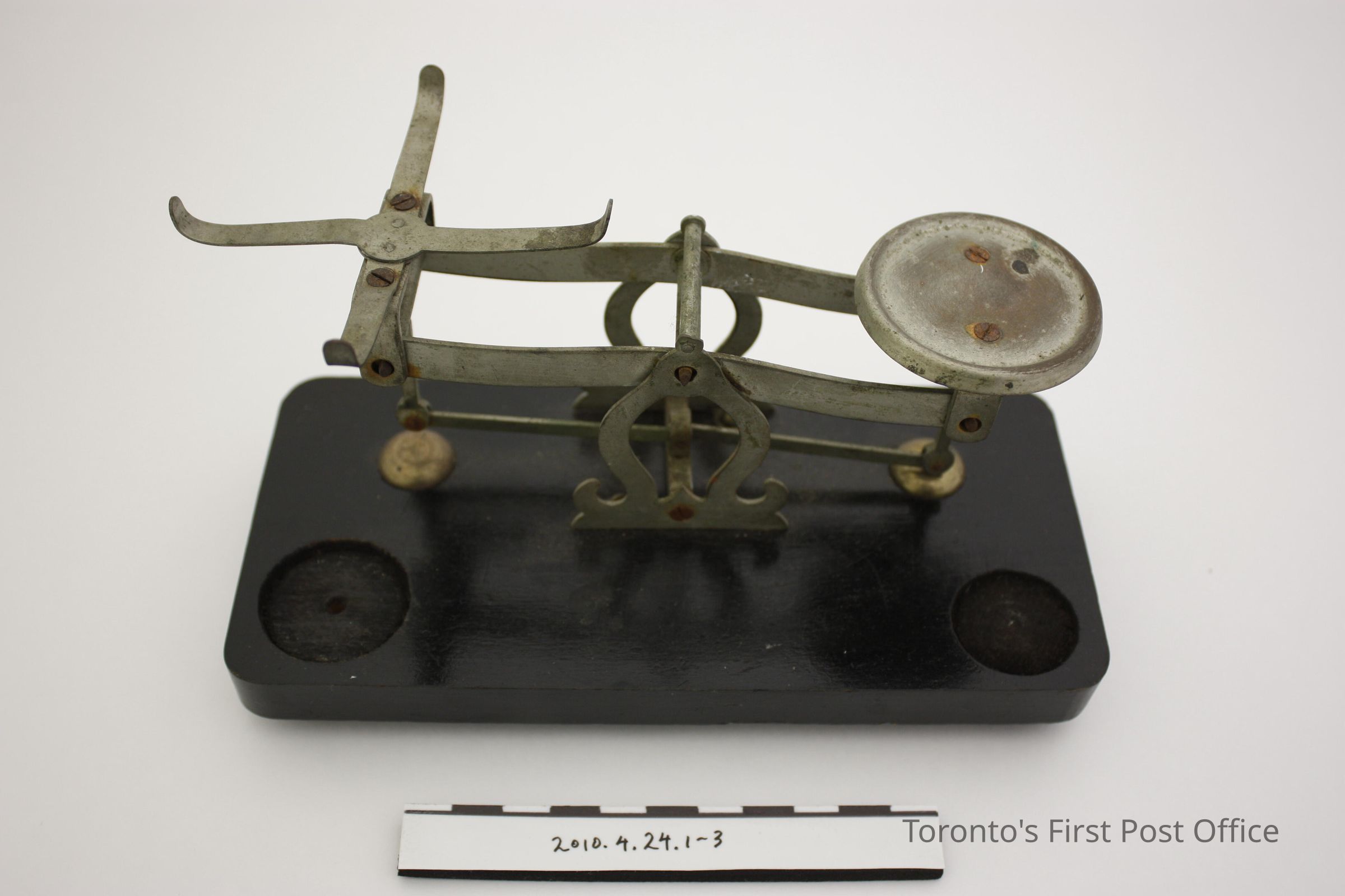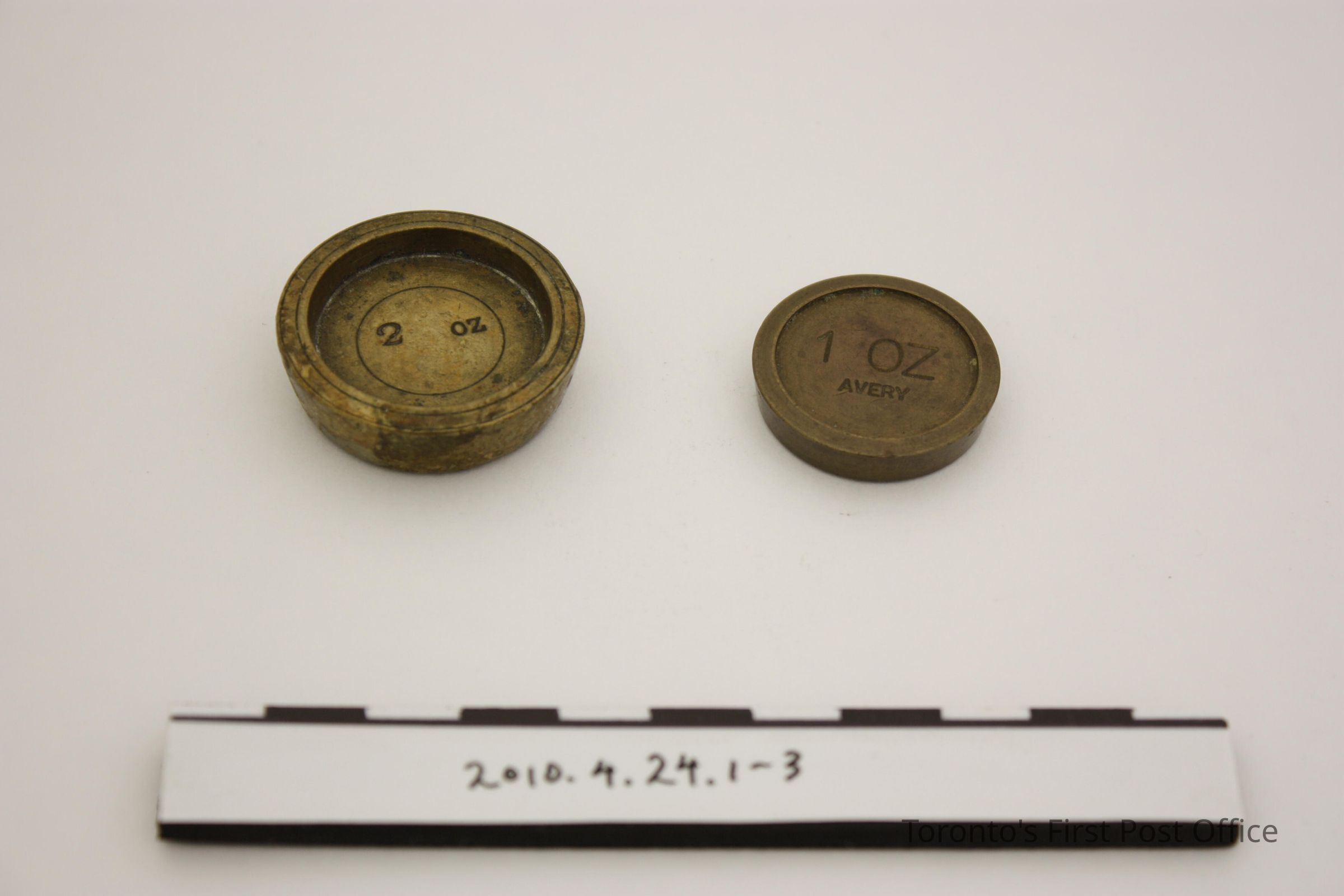Wooden footed platform with mismatched metal pans. Two ounce weight and one ounce weigth nested in base.Dimensions