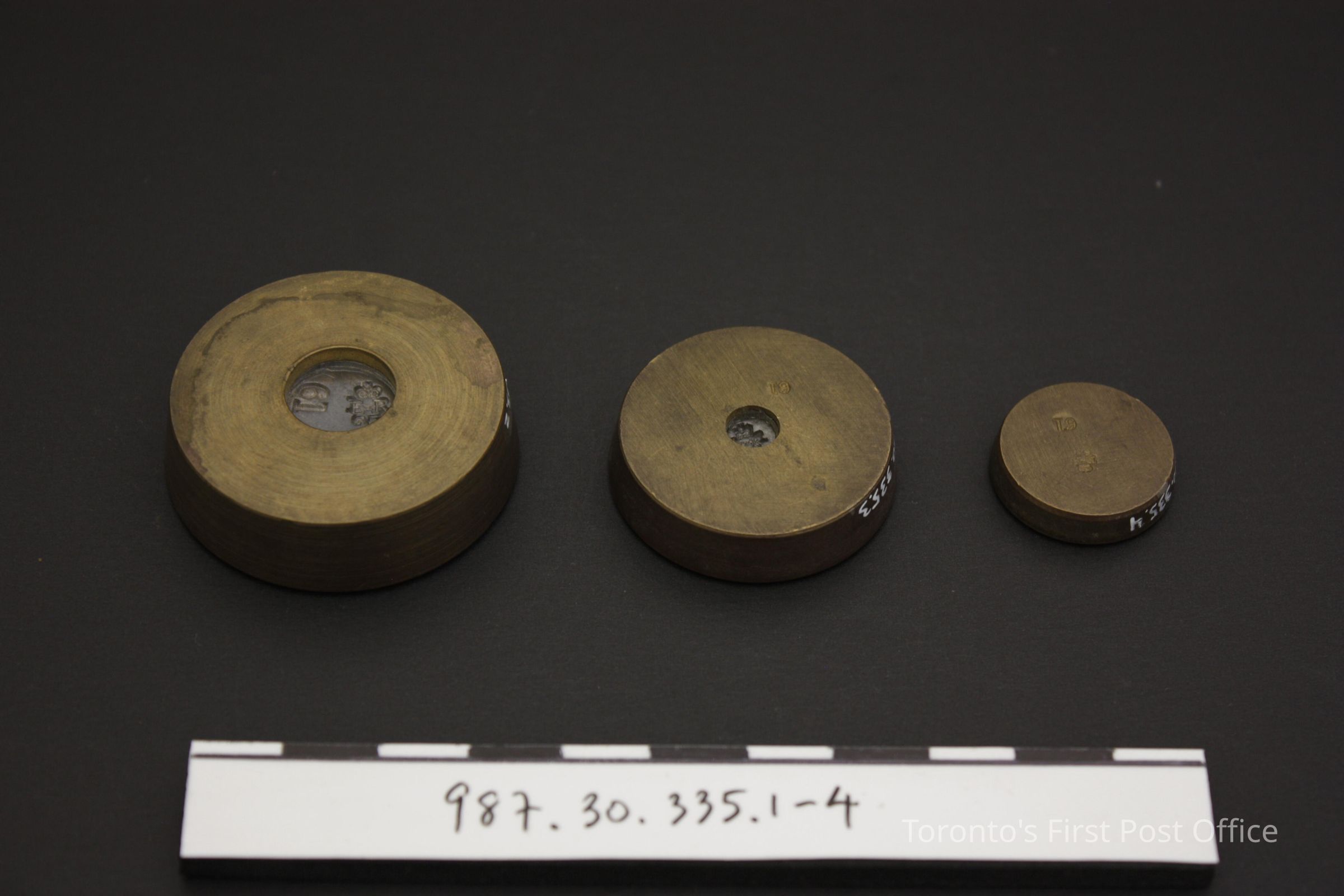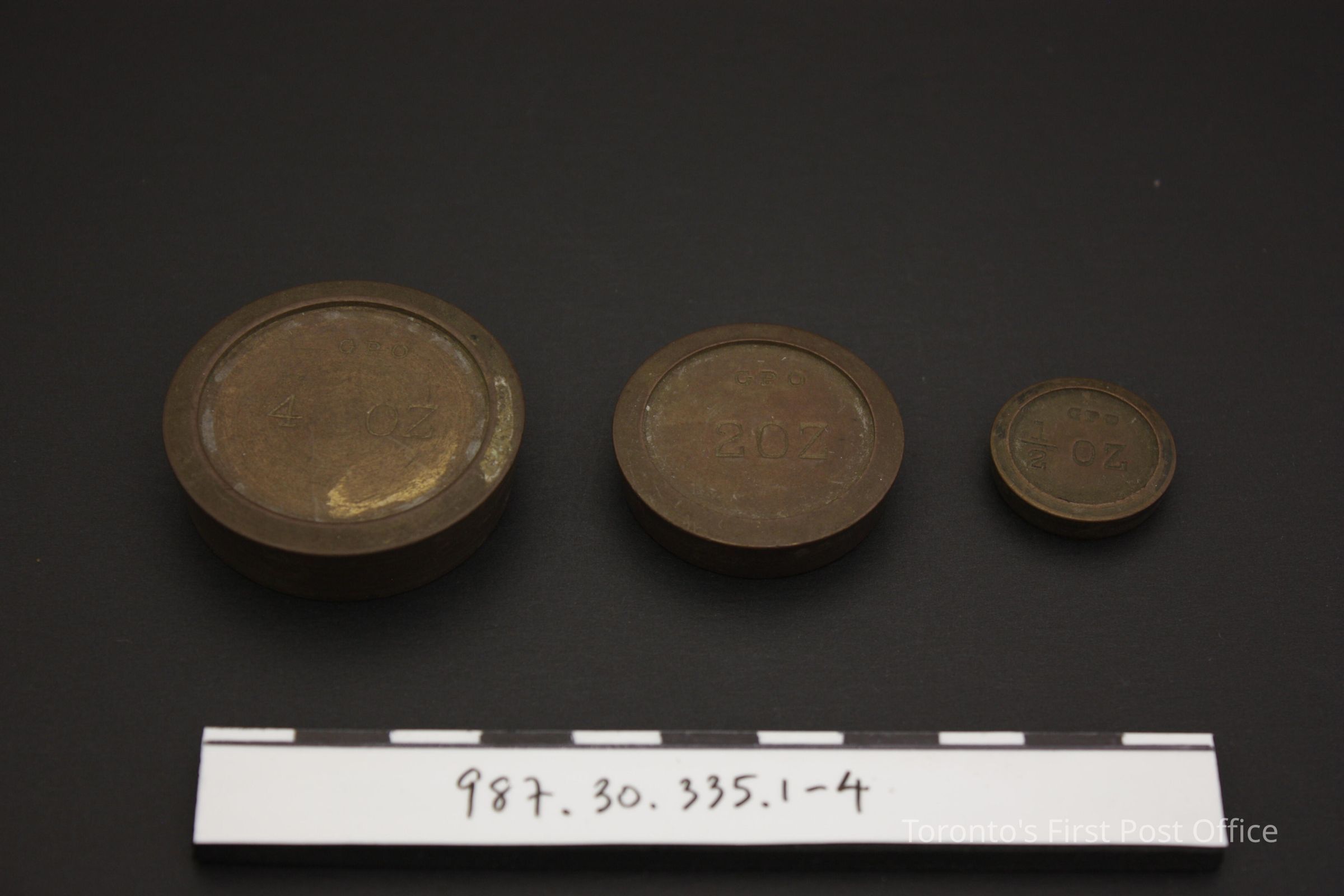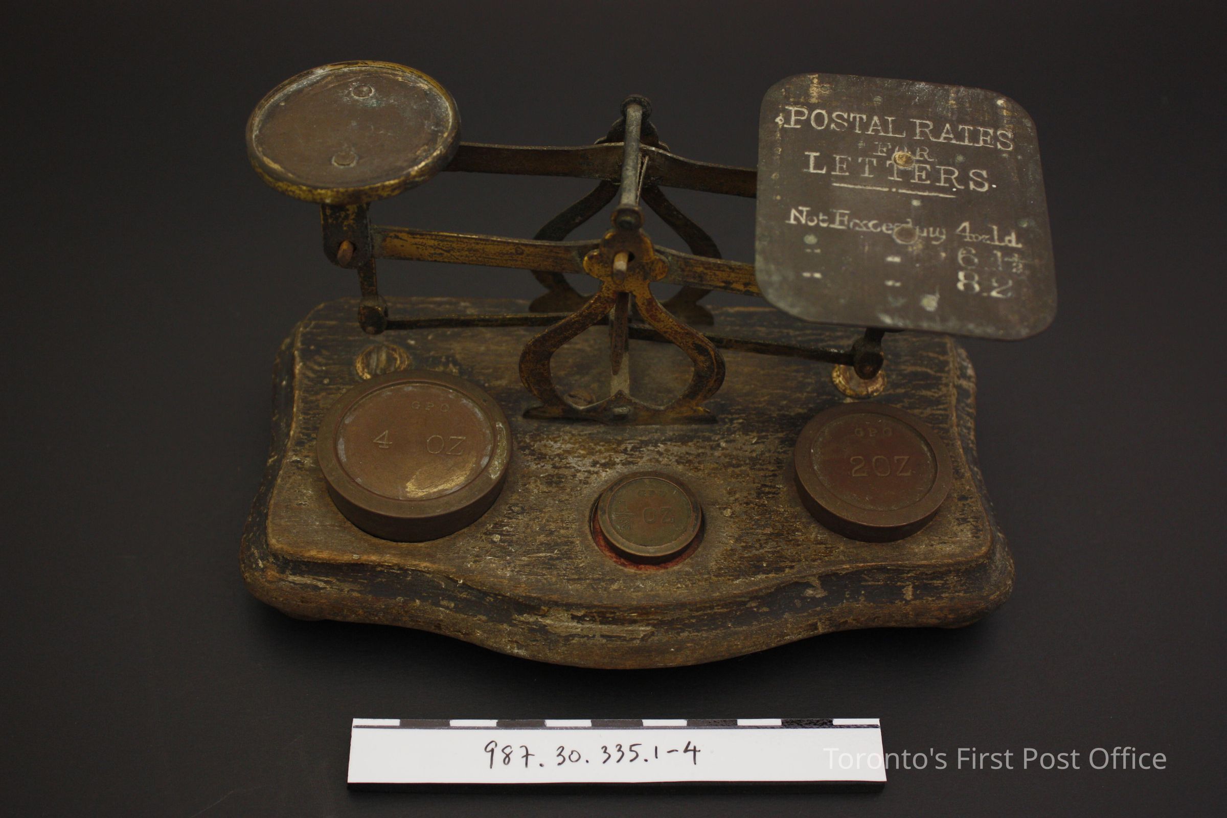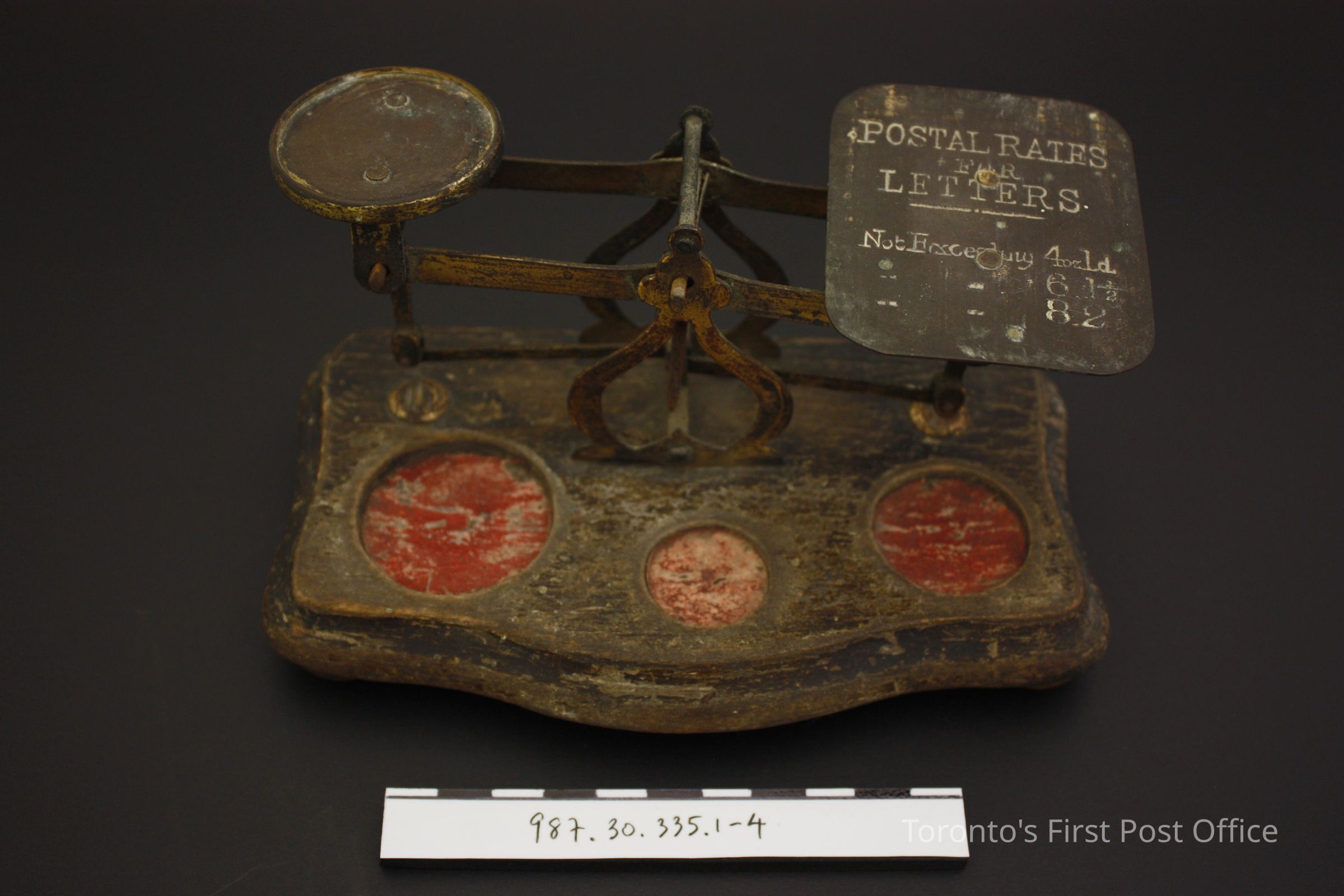 Postal scale; brass on wood base; pan inscribed "Postal Rates for letters not exceeding 4 oz/d/6 1 1/2/8.2" as adopted by the General Post Office for England and colonies in 1841; three weights inscribed as follows: .2 = "GPO 4oz", .3 = "GPO 2oz", .4 = "GPO 1/2oz"; weights sit in depressions in wood base; bottom of depressions painted red; circa 1845.Update Date