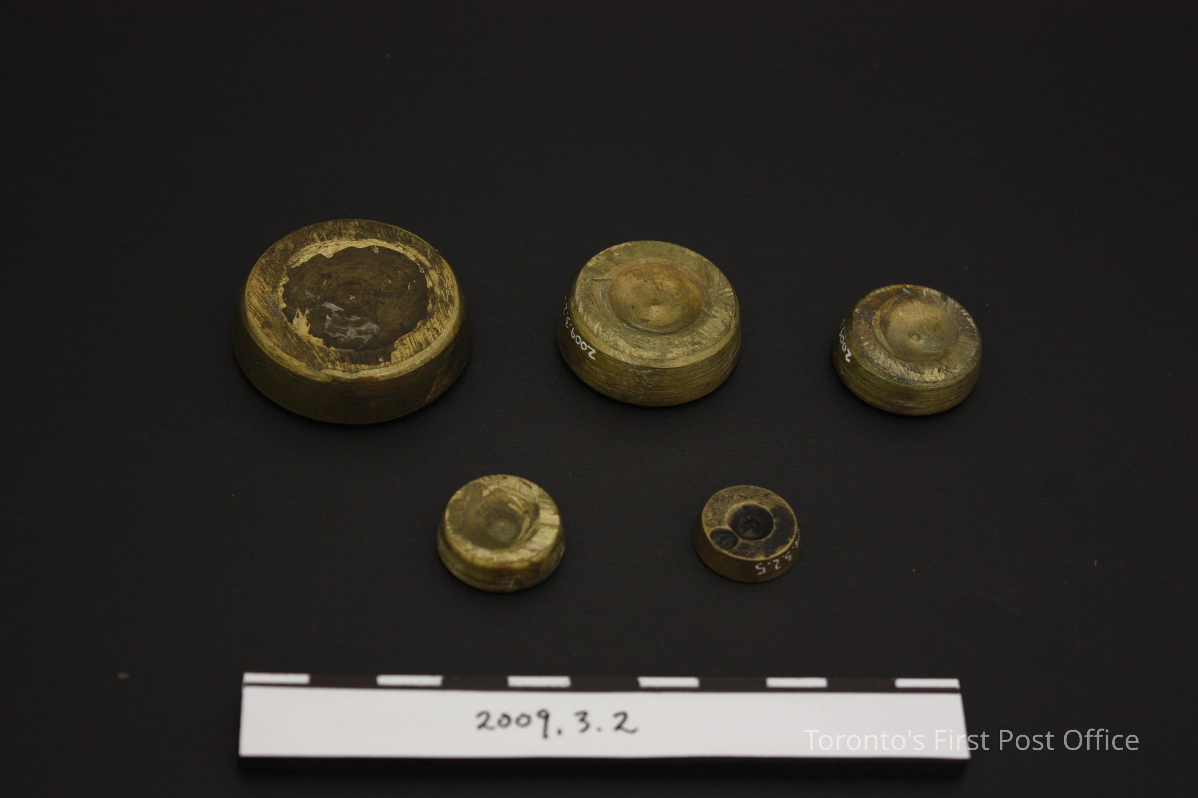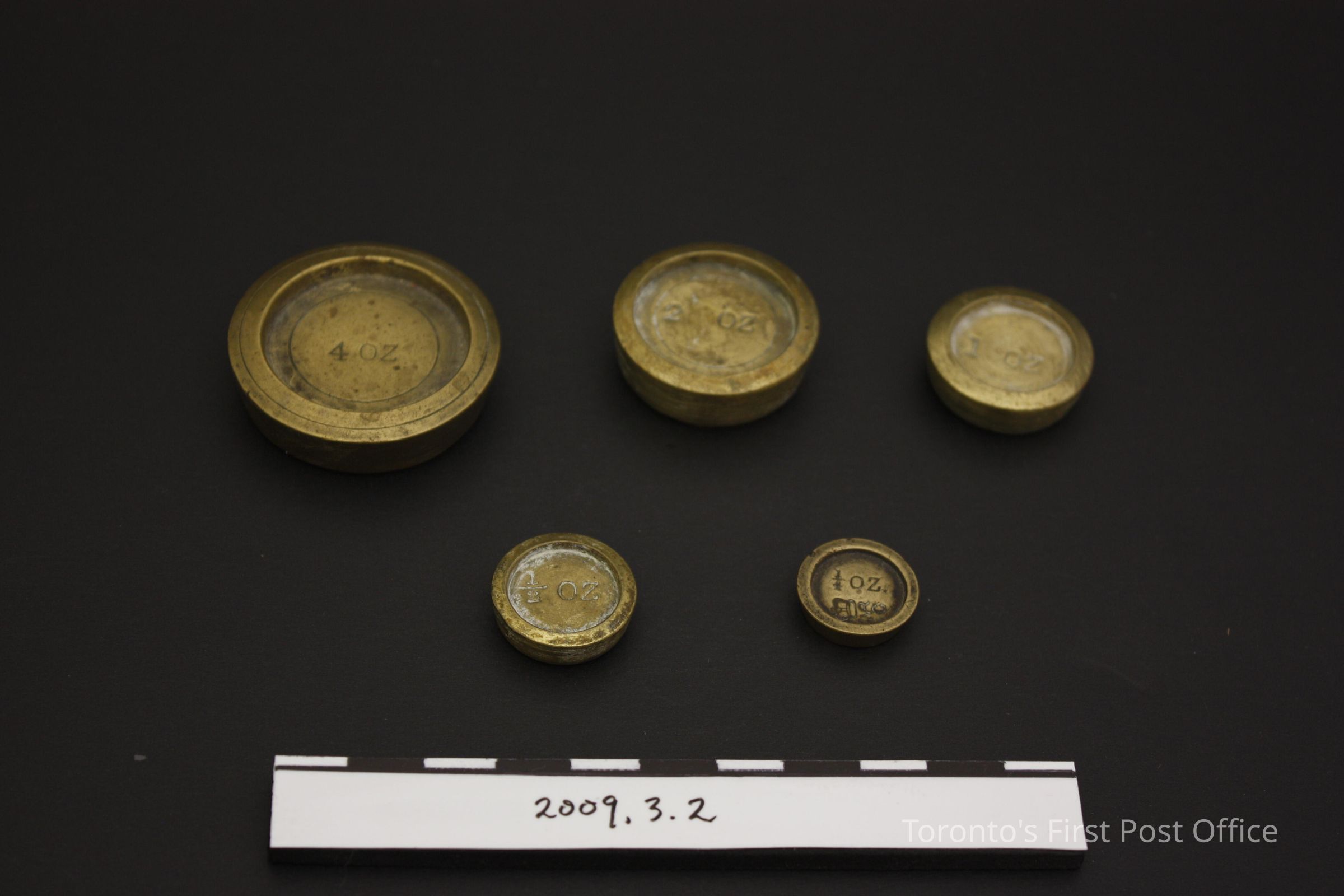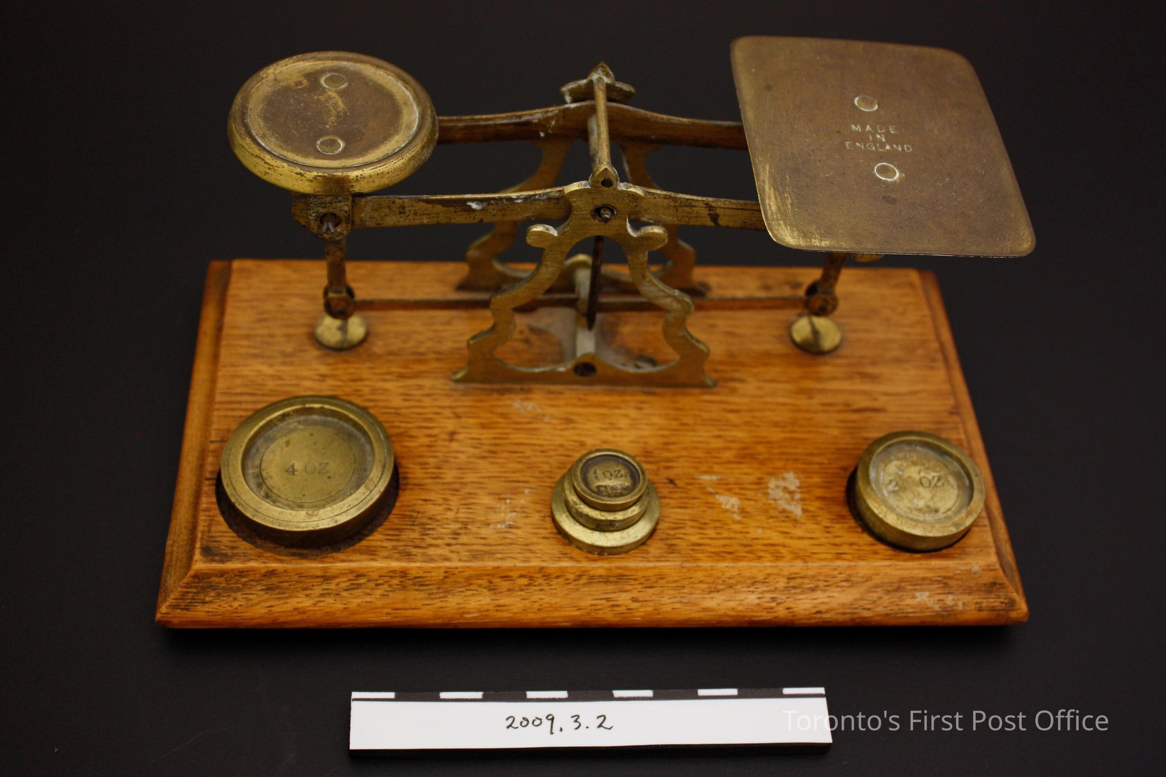 Postal scale; on footed oak base with bevelled edges; two brass trays - one circular withy small edge; one rectangular and with rounded edges, marked "MADE IN ENGLAND" - each supported by two brass arms; three insets in bae for weights; centre insert bottom painted dark red; weights are all bright brass; weights are as follows: 4 oz (.2.1); 2 oz (.2.2); 1 oz (.2.3); 1/2 oz (.2.4); 1/4 oz also marked with crown and VRC (.2.5); c. 1850-1860.Dimensions