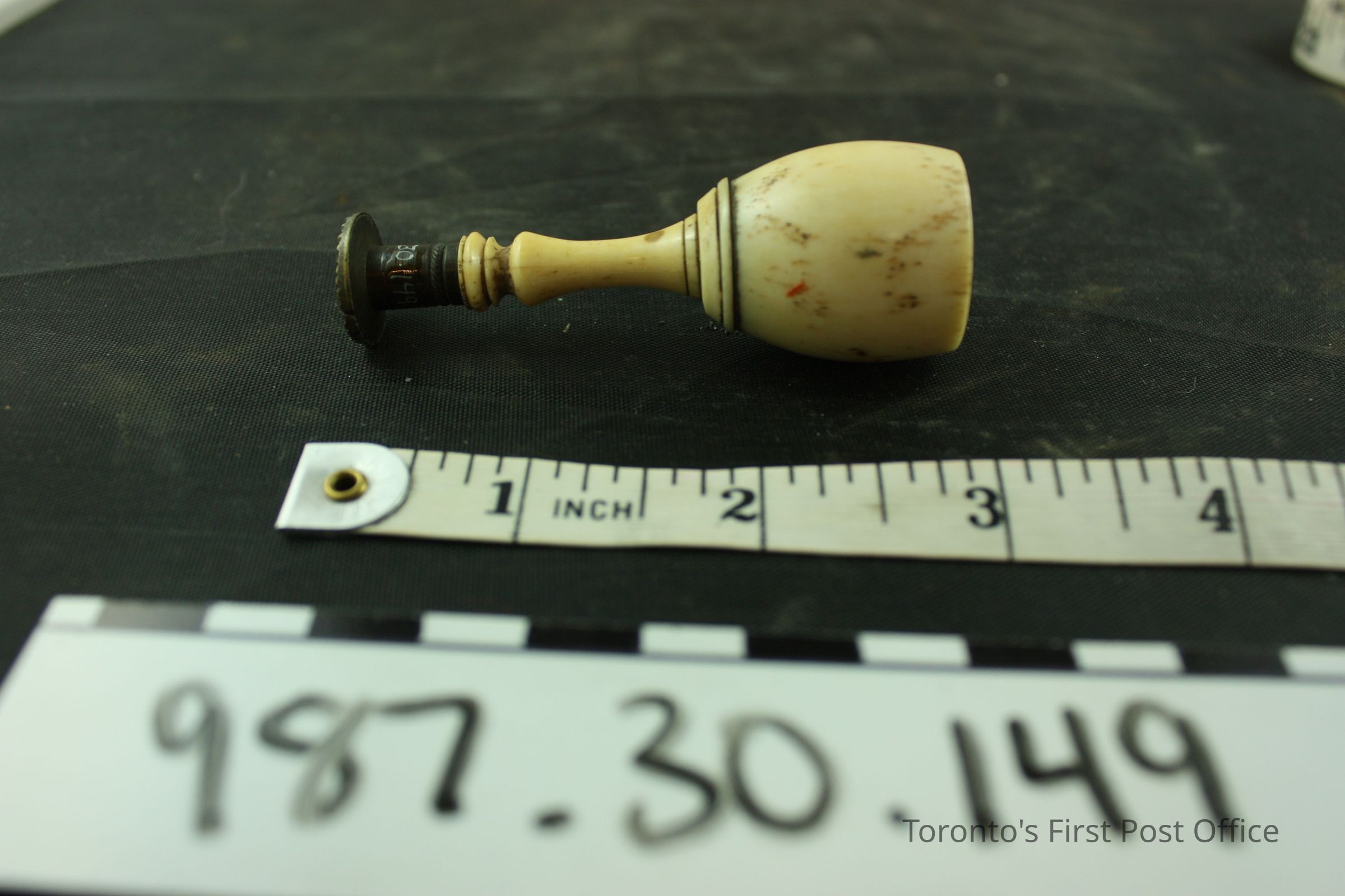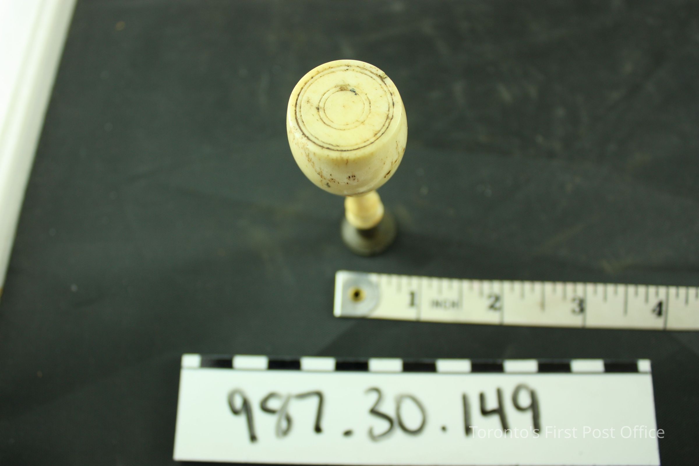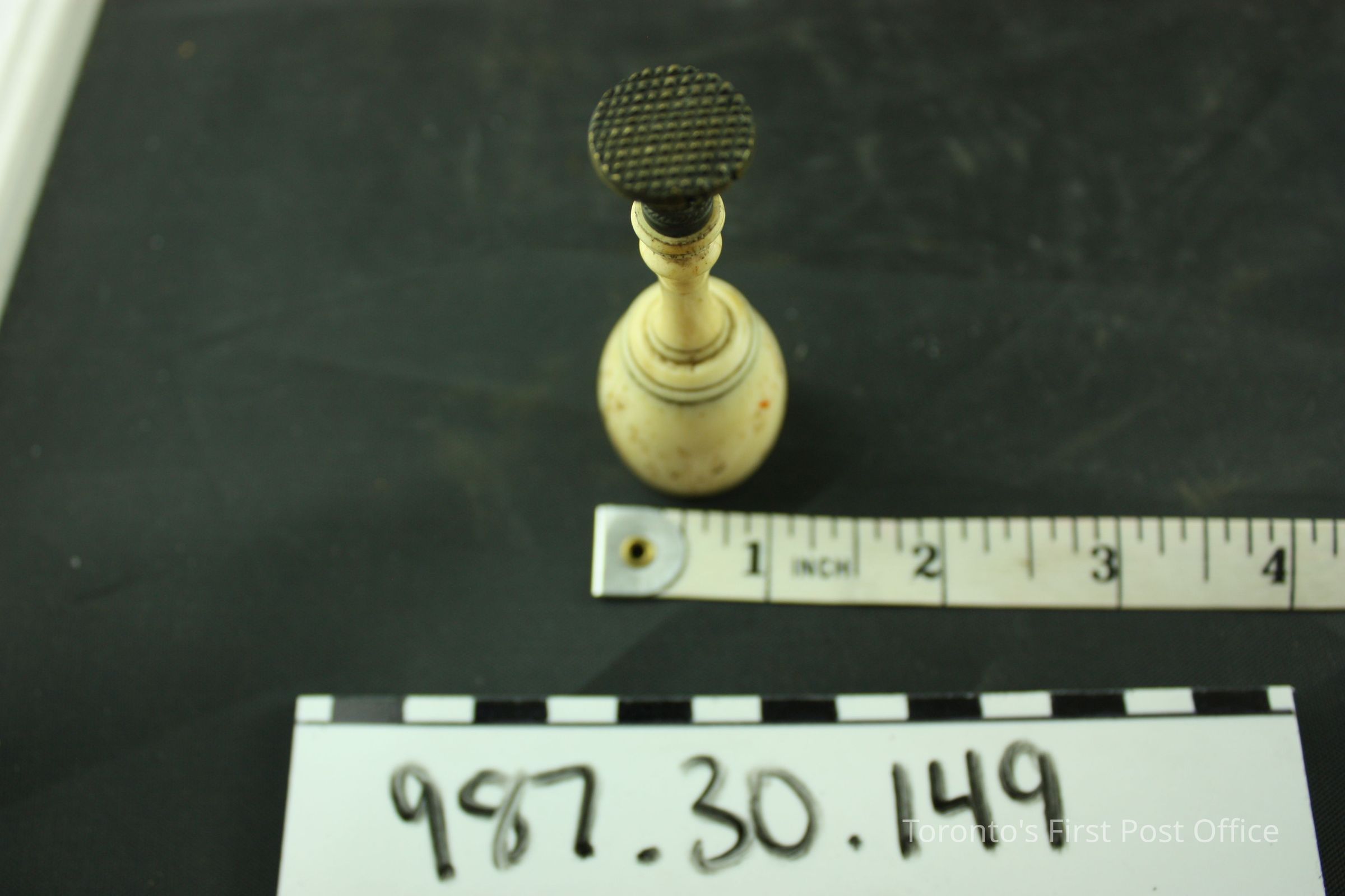 Wax seal; handle: ivory; head: brass, cross-hatched design; heavy top half; slender bottom; incised lines at bottom of wide handle; circa 1830s.Dimensions