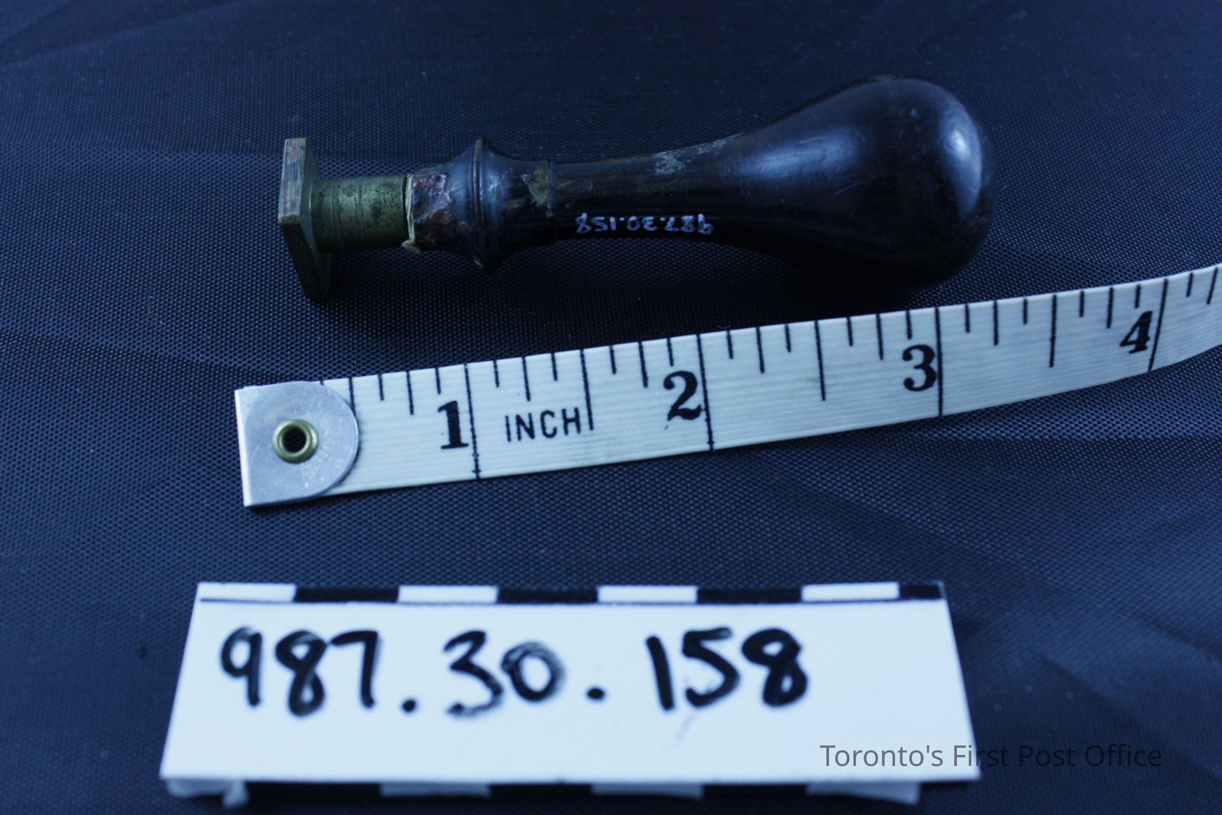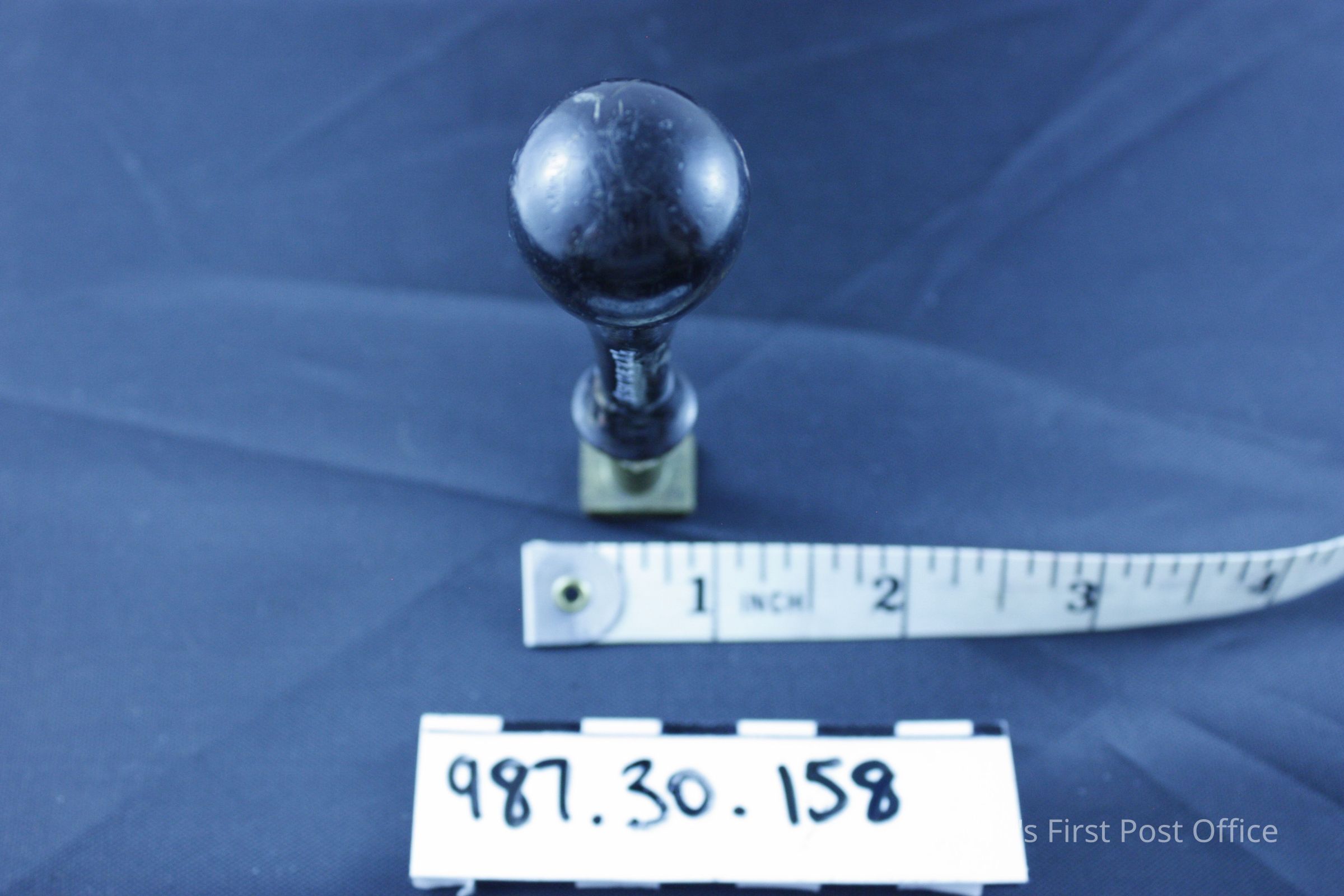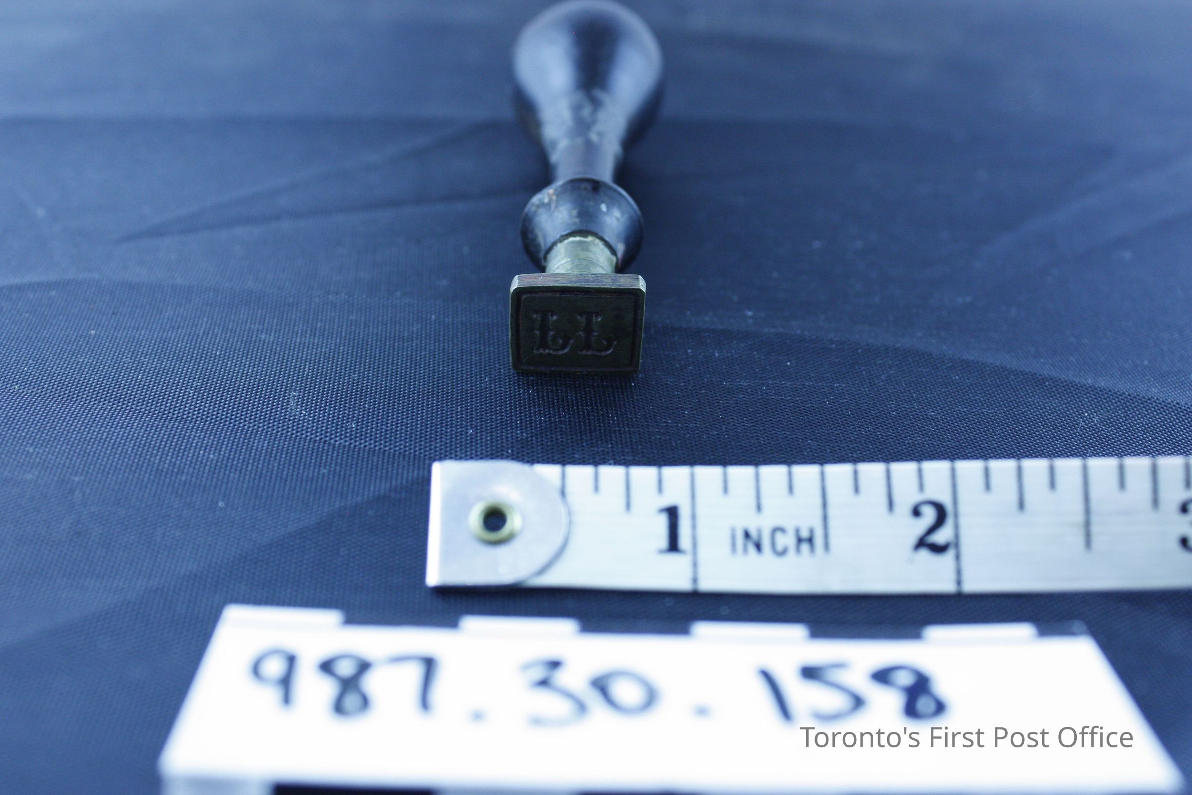 Wax seal; handle: wood, black stain, heavy rounded knob at top end, tapering down toward base and centre; head: brass, rectangular, initials "JJ" (possibly "LL"); circa 1840.Dimensions
