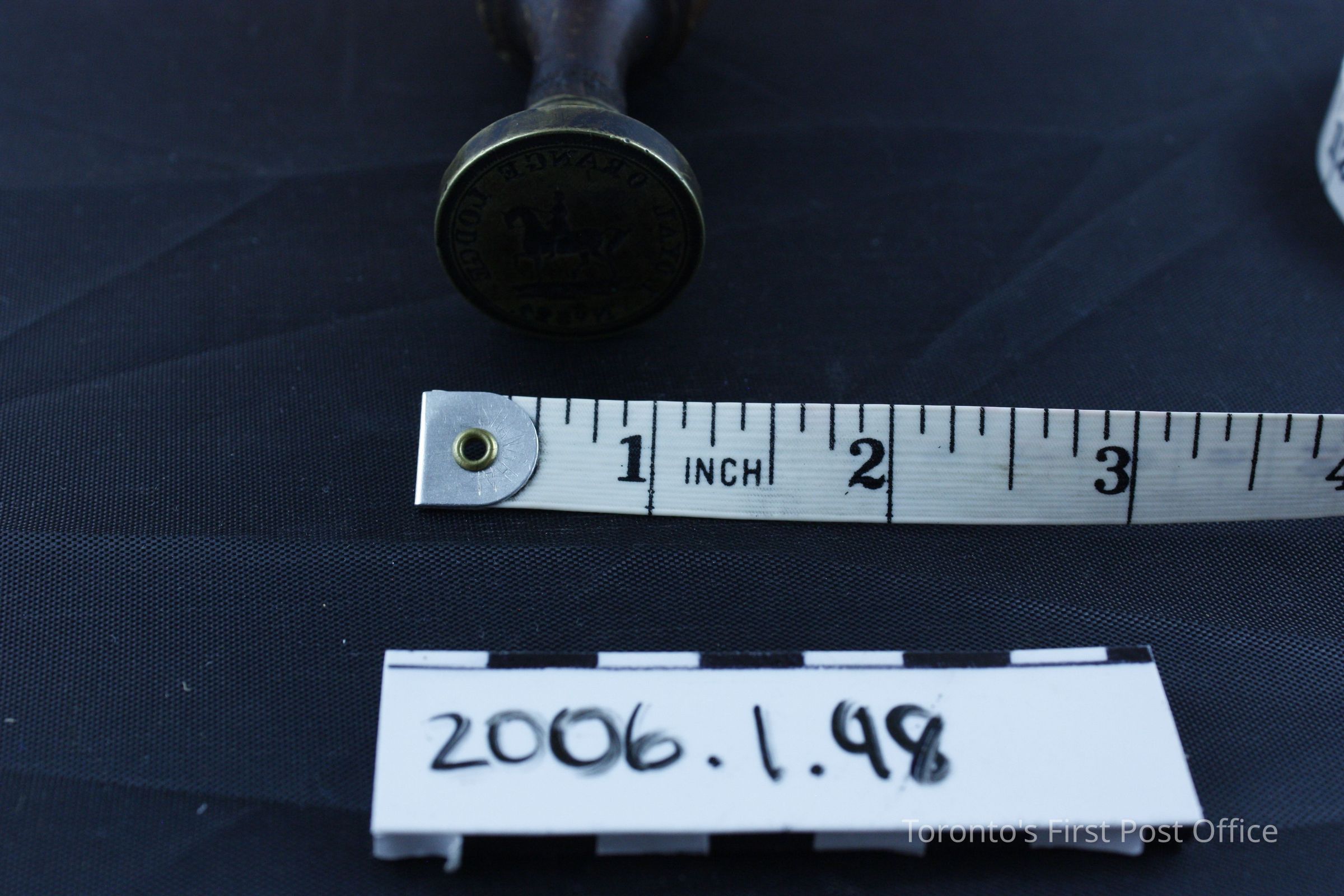Seal with wooden handle; brass marker with "LOYAL ORANGE LODGE No 324"; and King William(?) on horseback; circa 1850.Dimensions