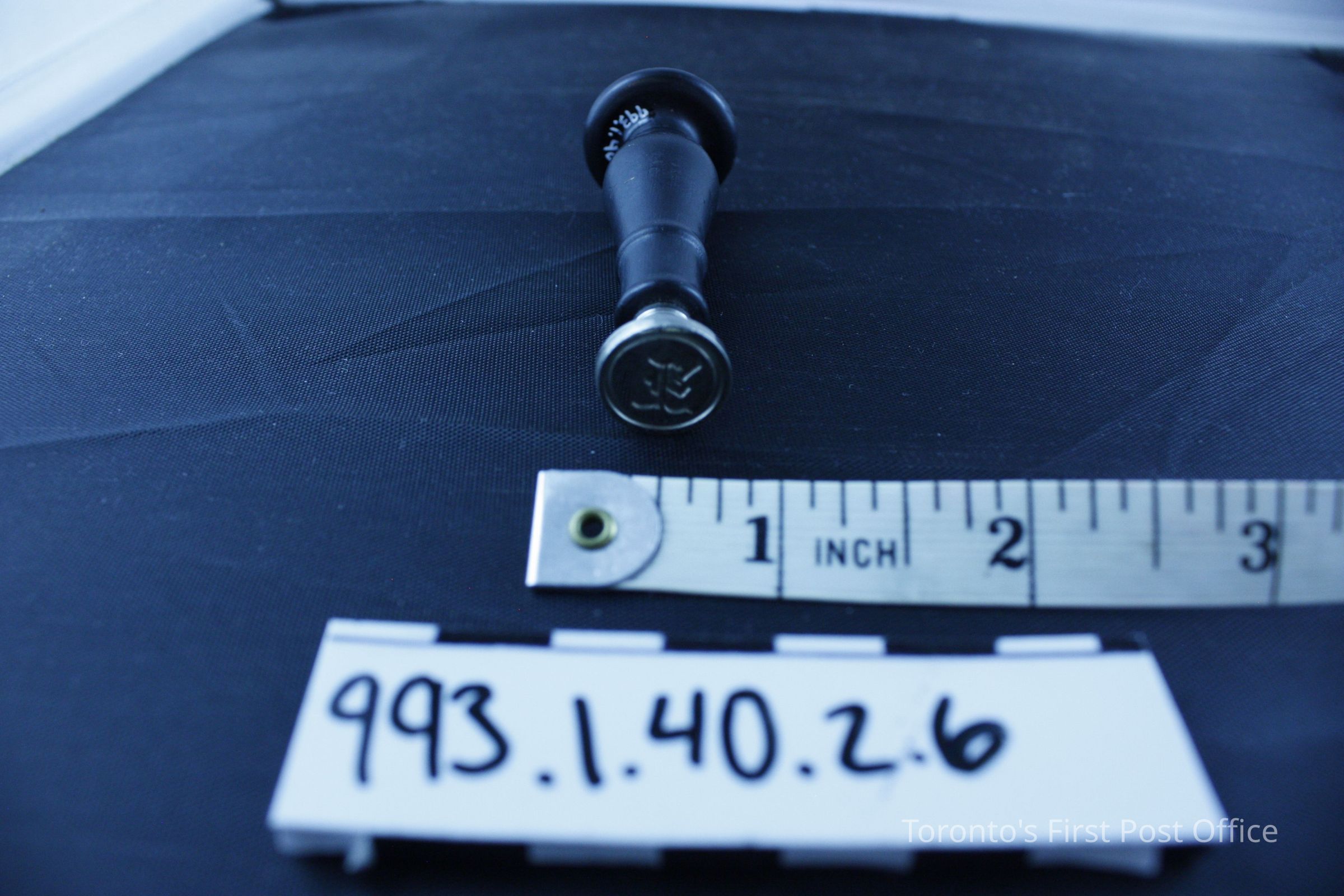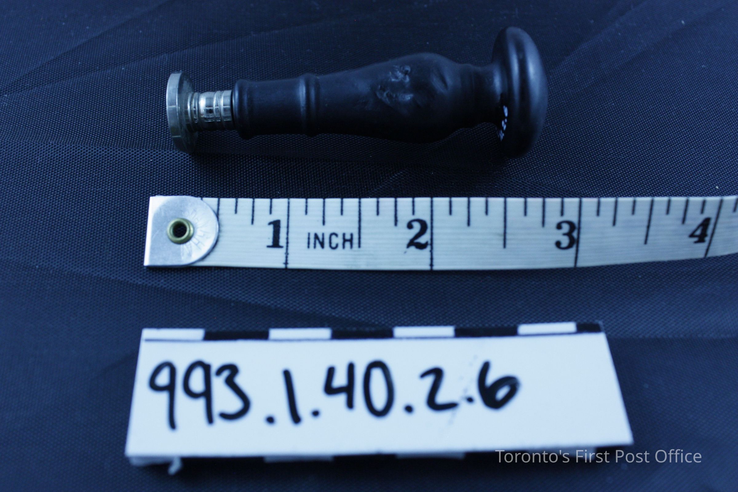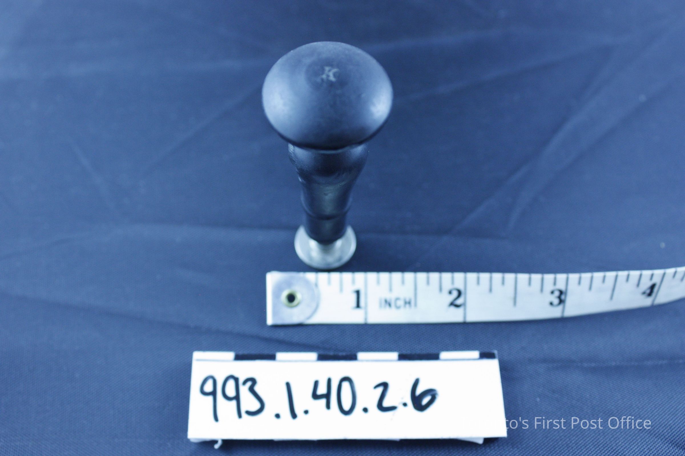 Seal with wood handle; black finish; machine turned; convex top with carved "K"; alloy seal; very light; silver colour; circular with initial "K"; circa 1930s; manufacturer: Dennison.Dimensions