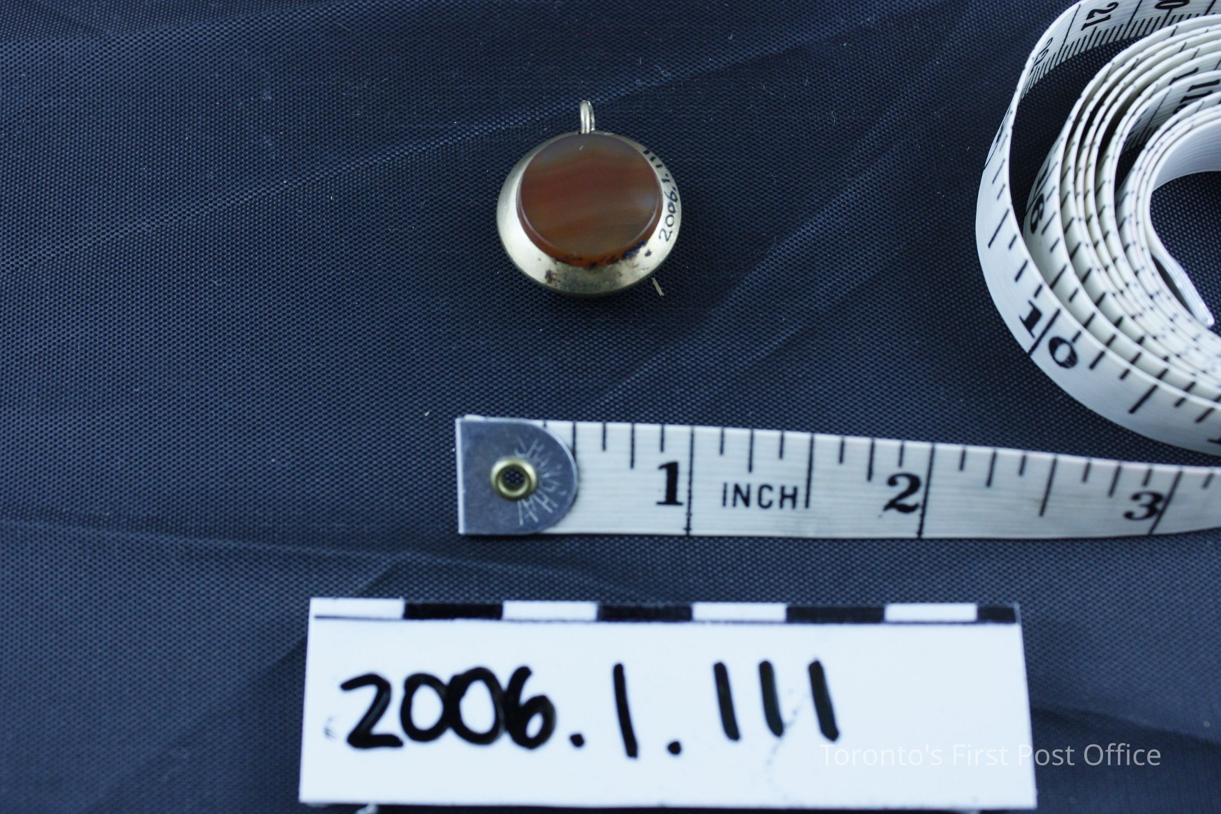 Watch fob seal with gold frame; carnelian on one side; black onyx on reverse; neither side is engraved.