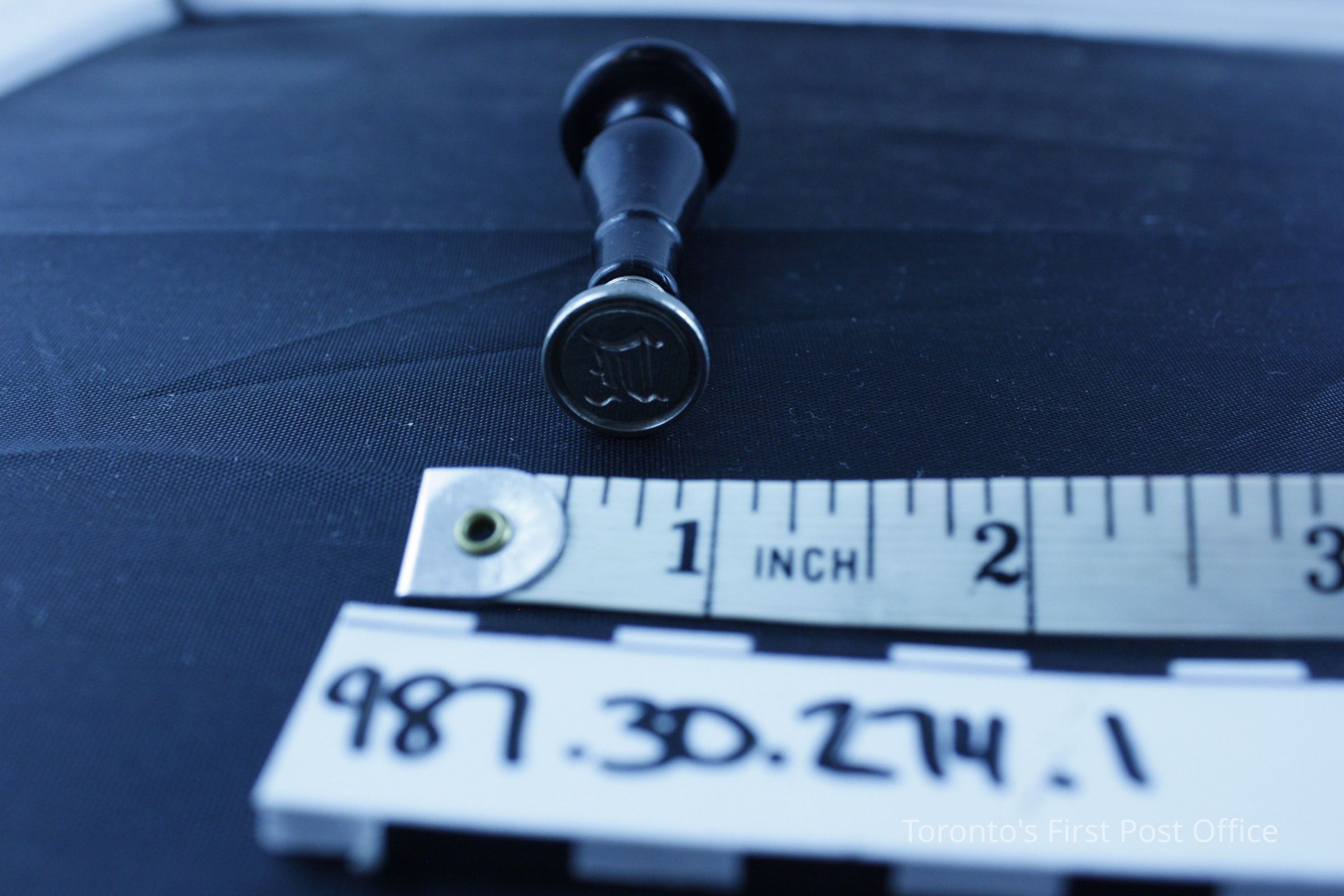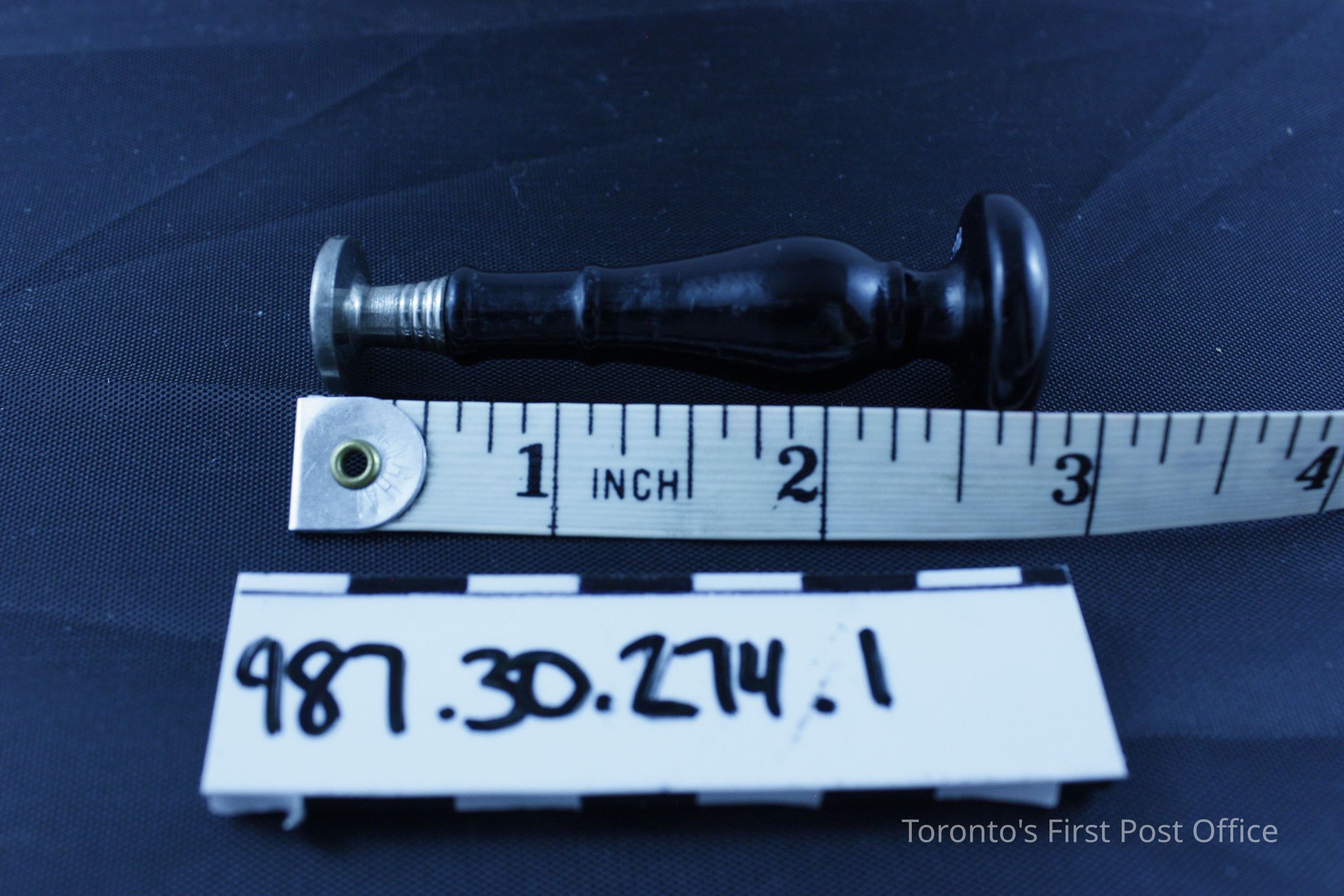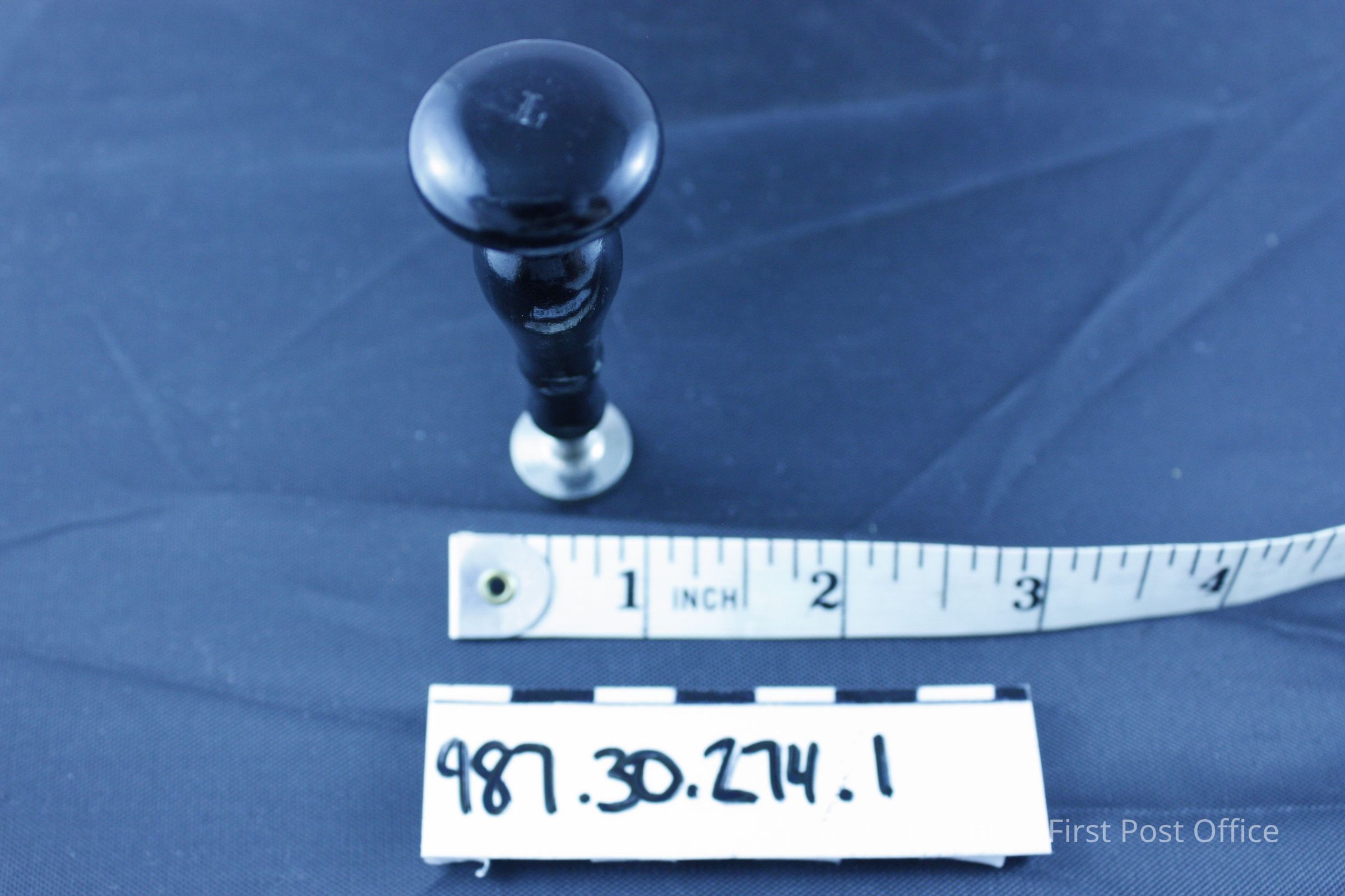 Wax seal with wooden black stained handle; glossy and varnished; small "L" incised in top of handle; metal seal with monogram "L"; circa 1920; possibly Dennison.Dimensions