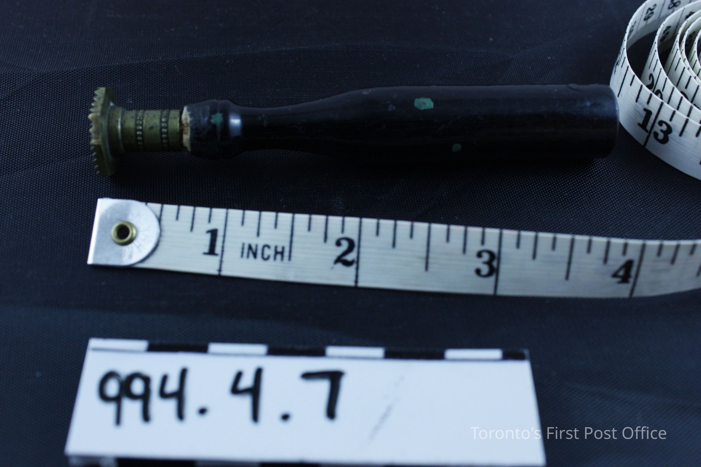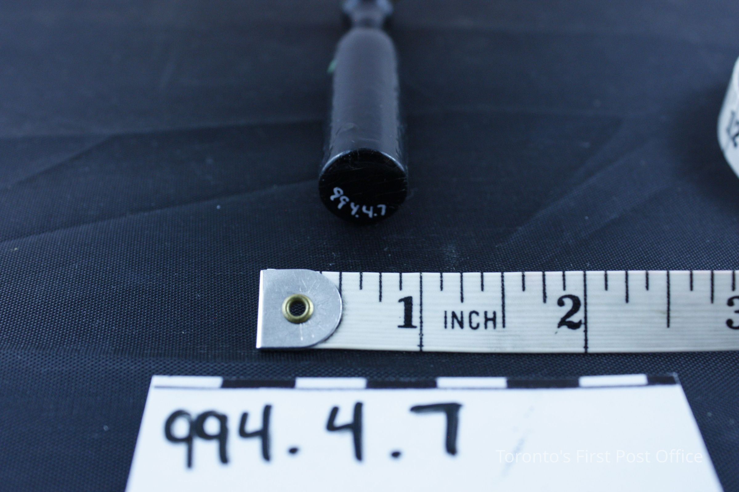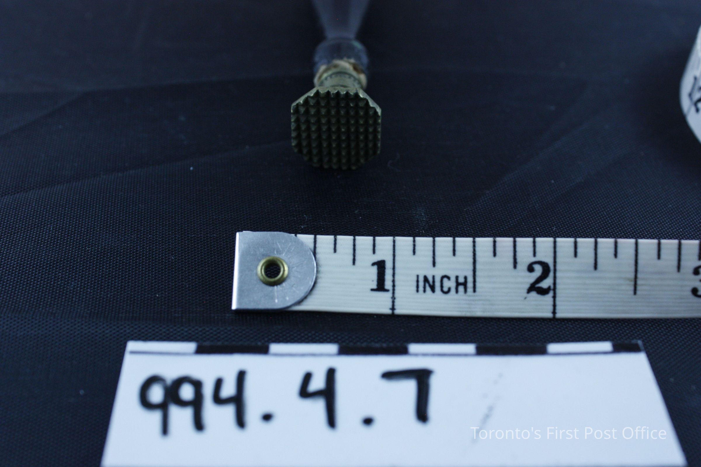Seal; brass face with cross-hatching; slim black handle; possibly circa 1920s.