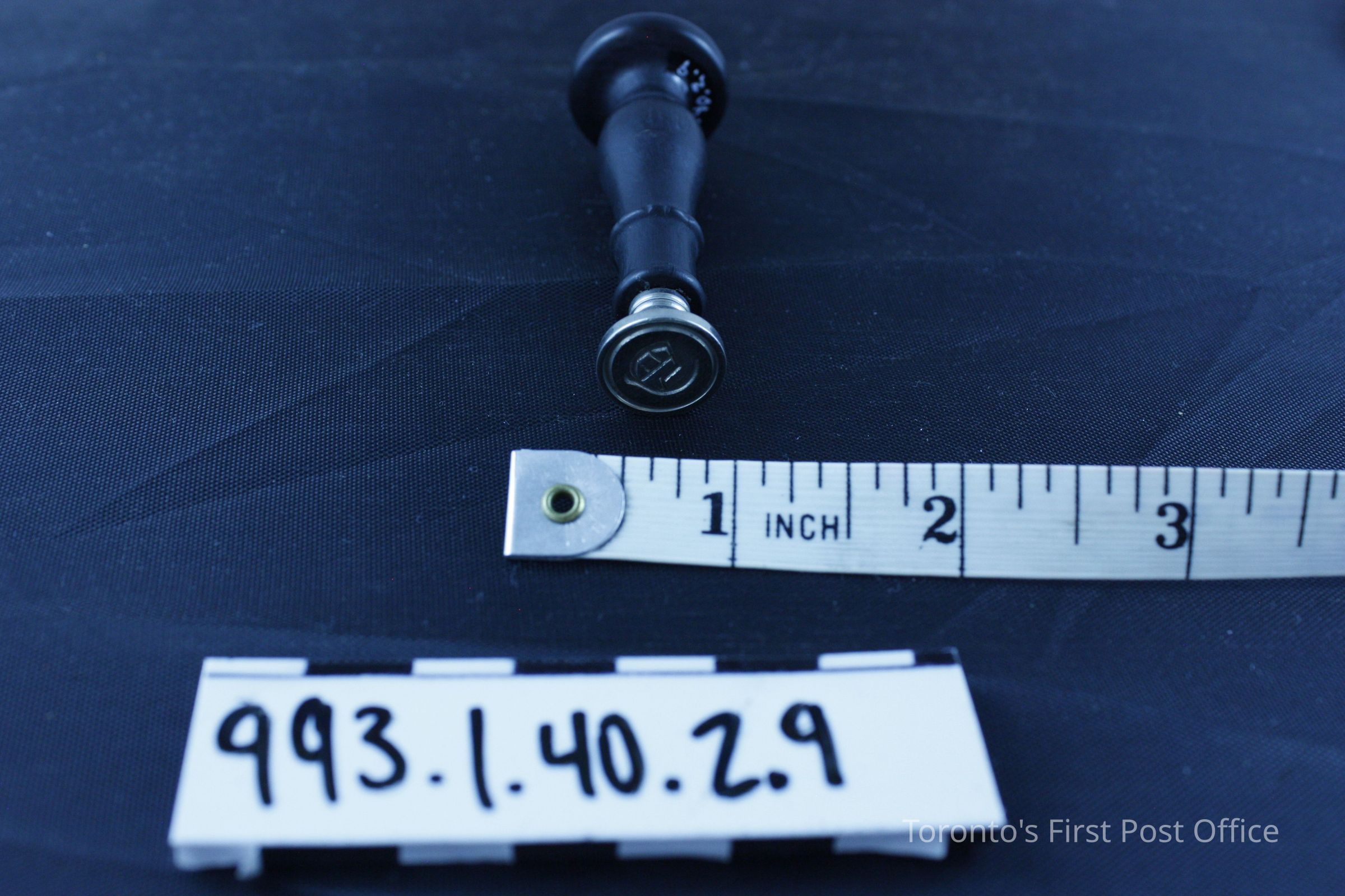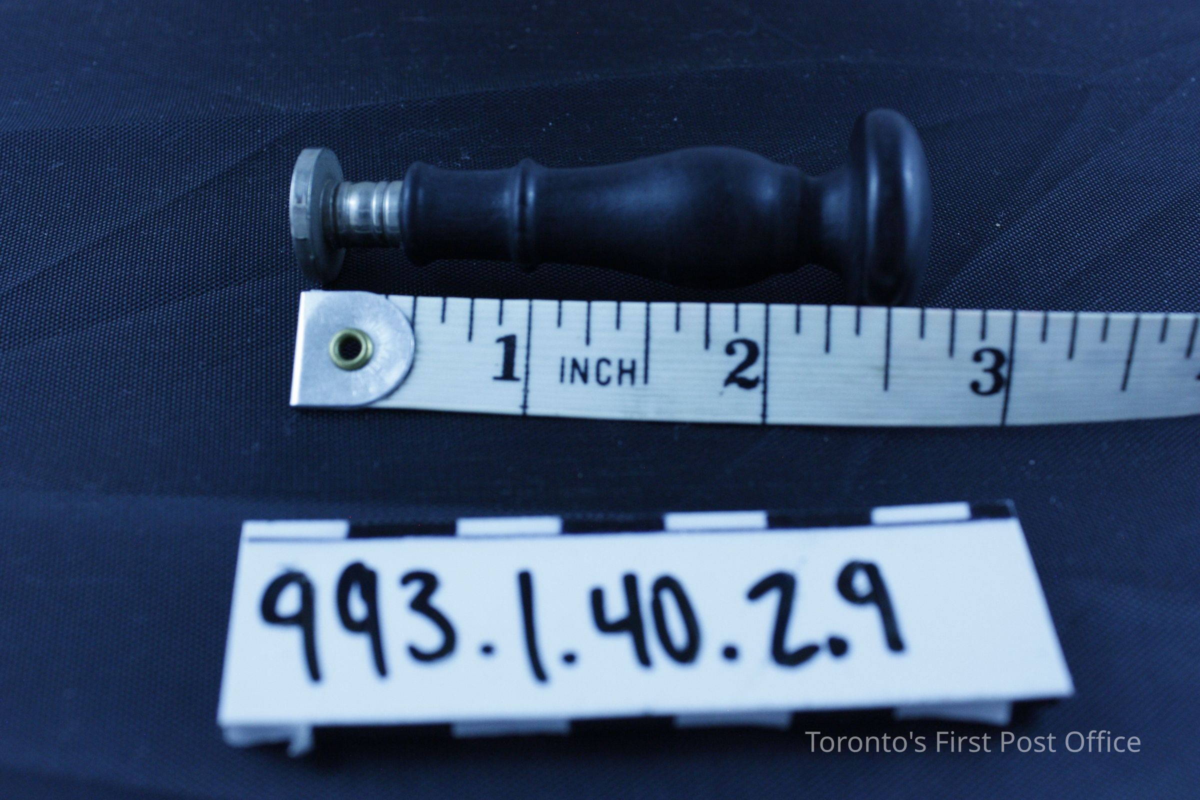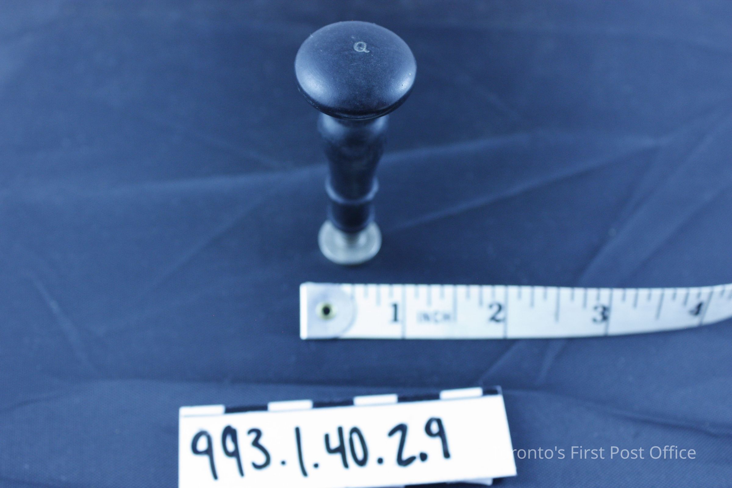 Seal with wood handle; black finish; machine turned; convex top with carved "Q"; alloy seal; very light; silver colour; circular with initial "Q"; circa 1930s; manufacturer: Dennison.Dimensions