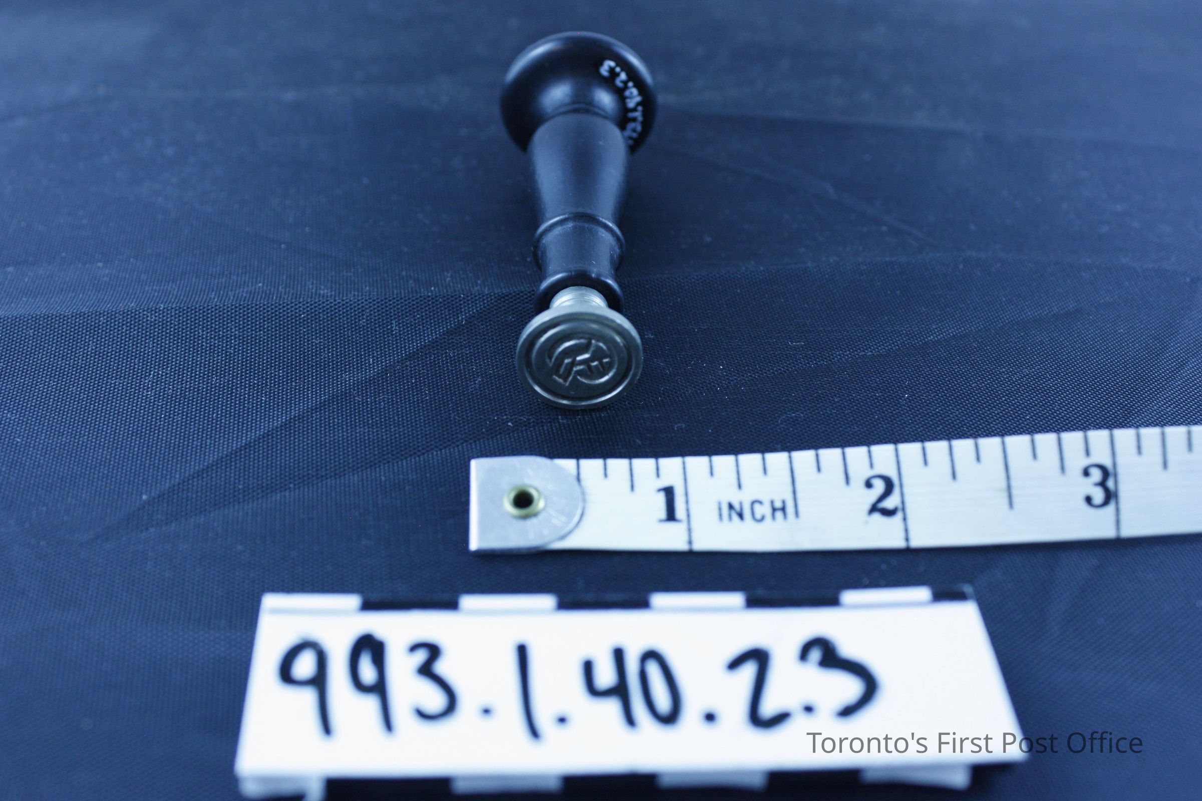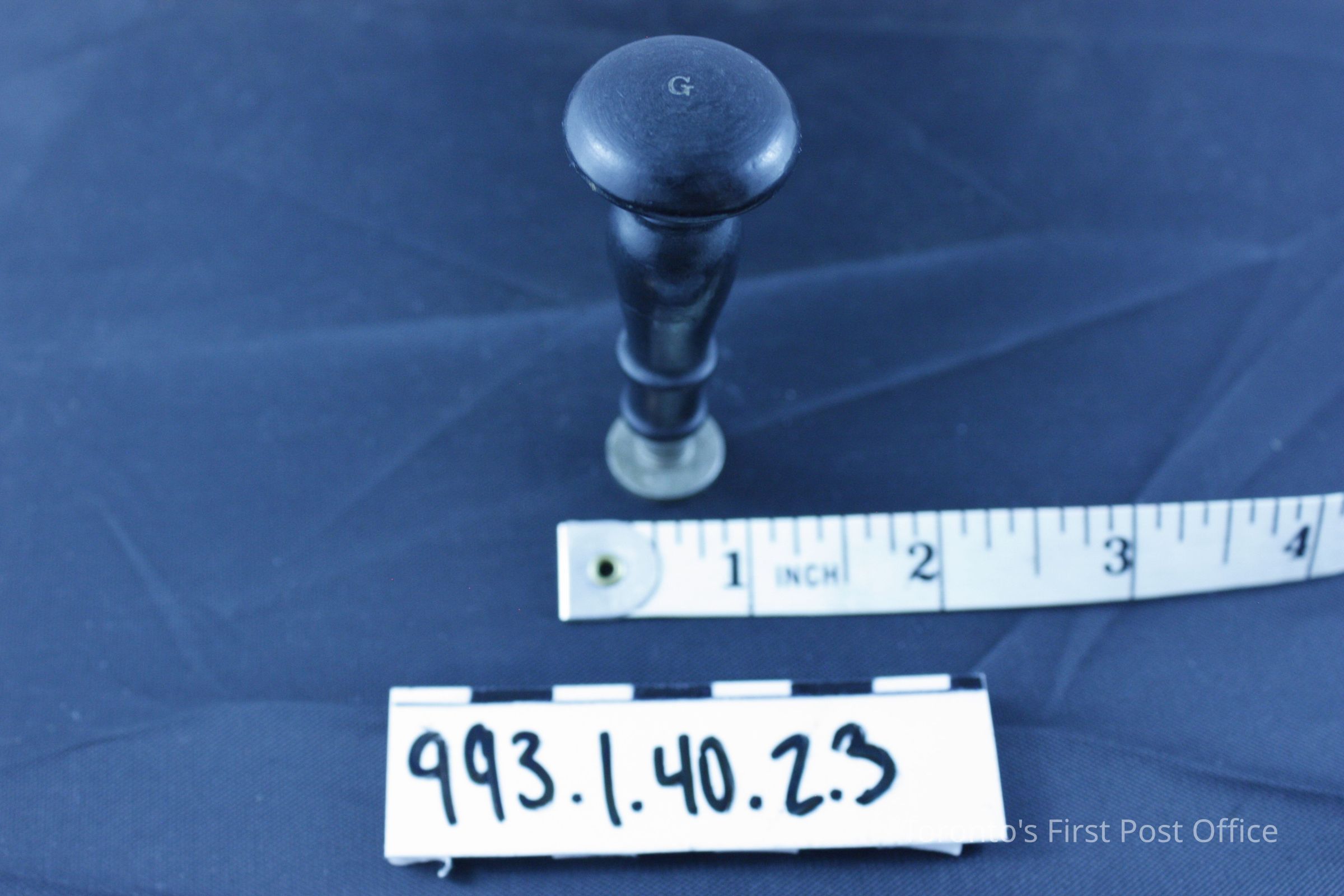 Seal with wood handle; black finish; machine turned; convex top with carved "G"; alloy seal; very light; silver colour; circular with initial "G"; circa 1930s; manufacturer: Dennison.Dimensions