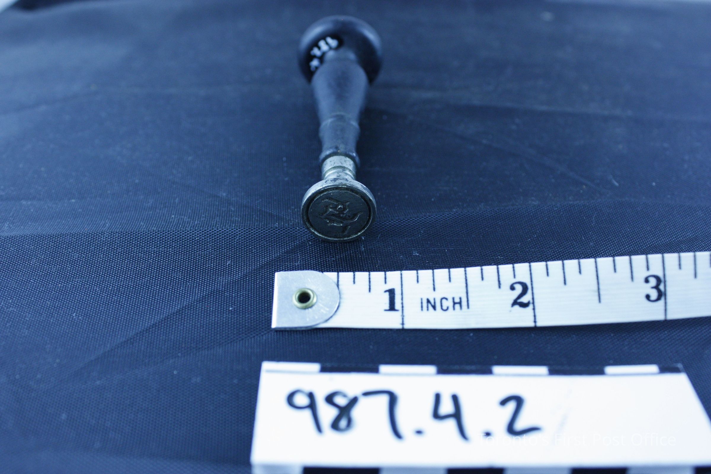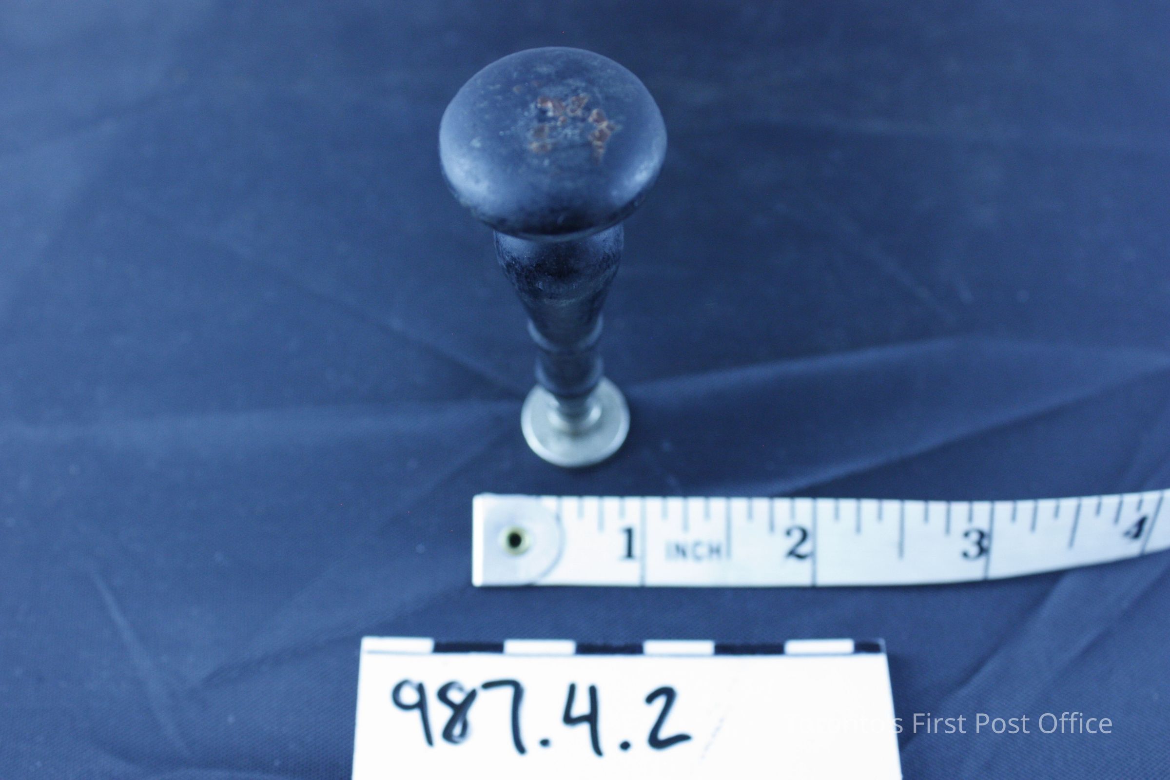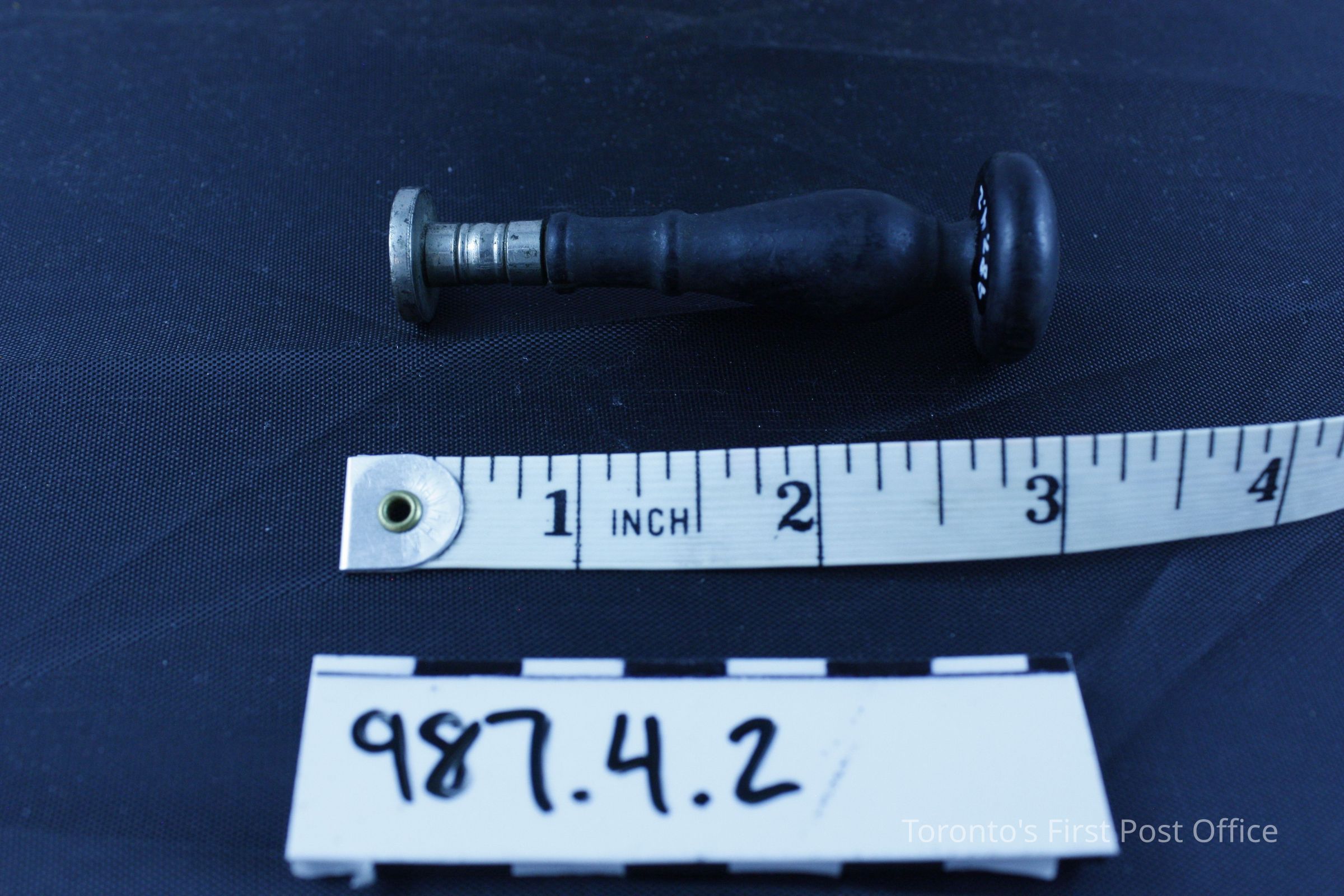 Seal for wax with turned wooden handle painted black; silver plated seal with design; initials: "HA" (?)