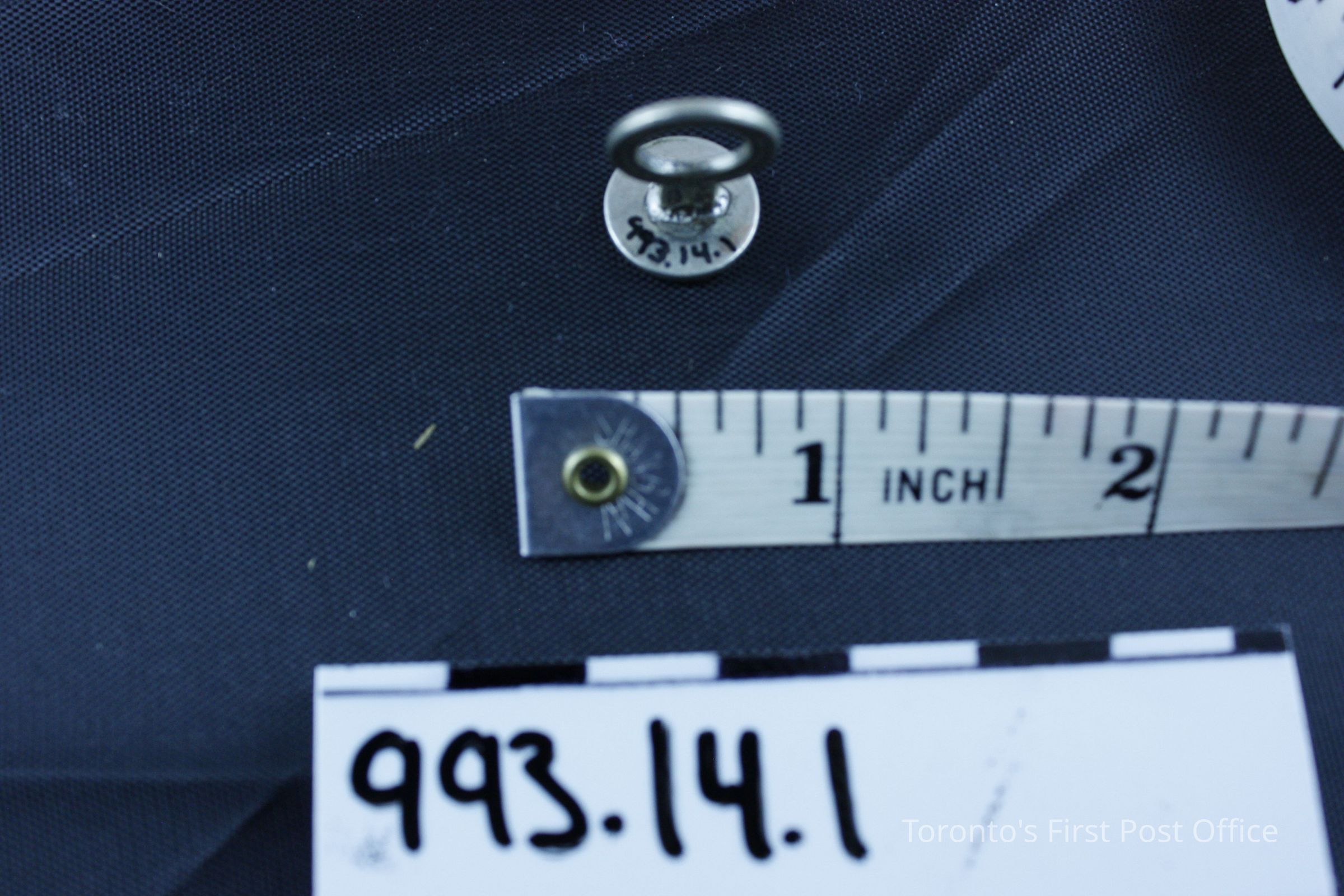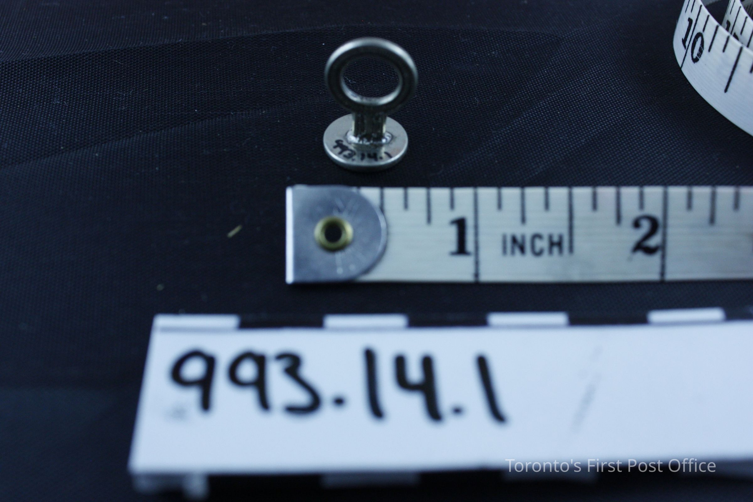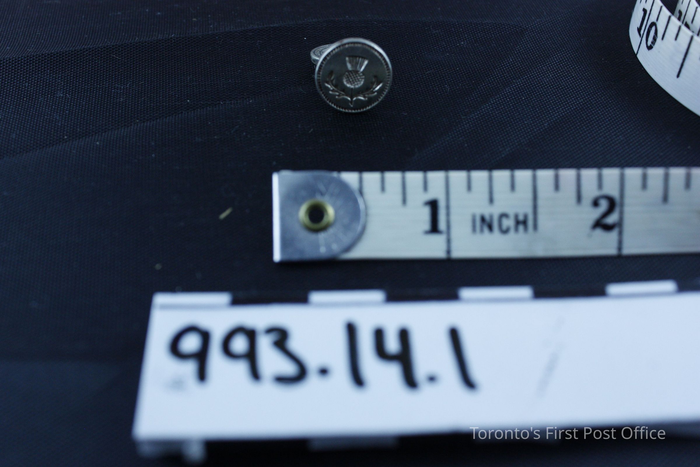 Seal with metal ring handle; chrome alloy; two pieces soldered together; short line decoration; marker is thistle blossom with leaves outlined by circle around edge of seal.Dimensions