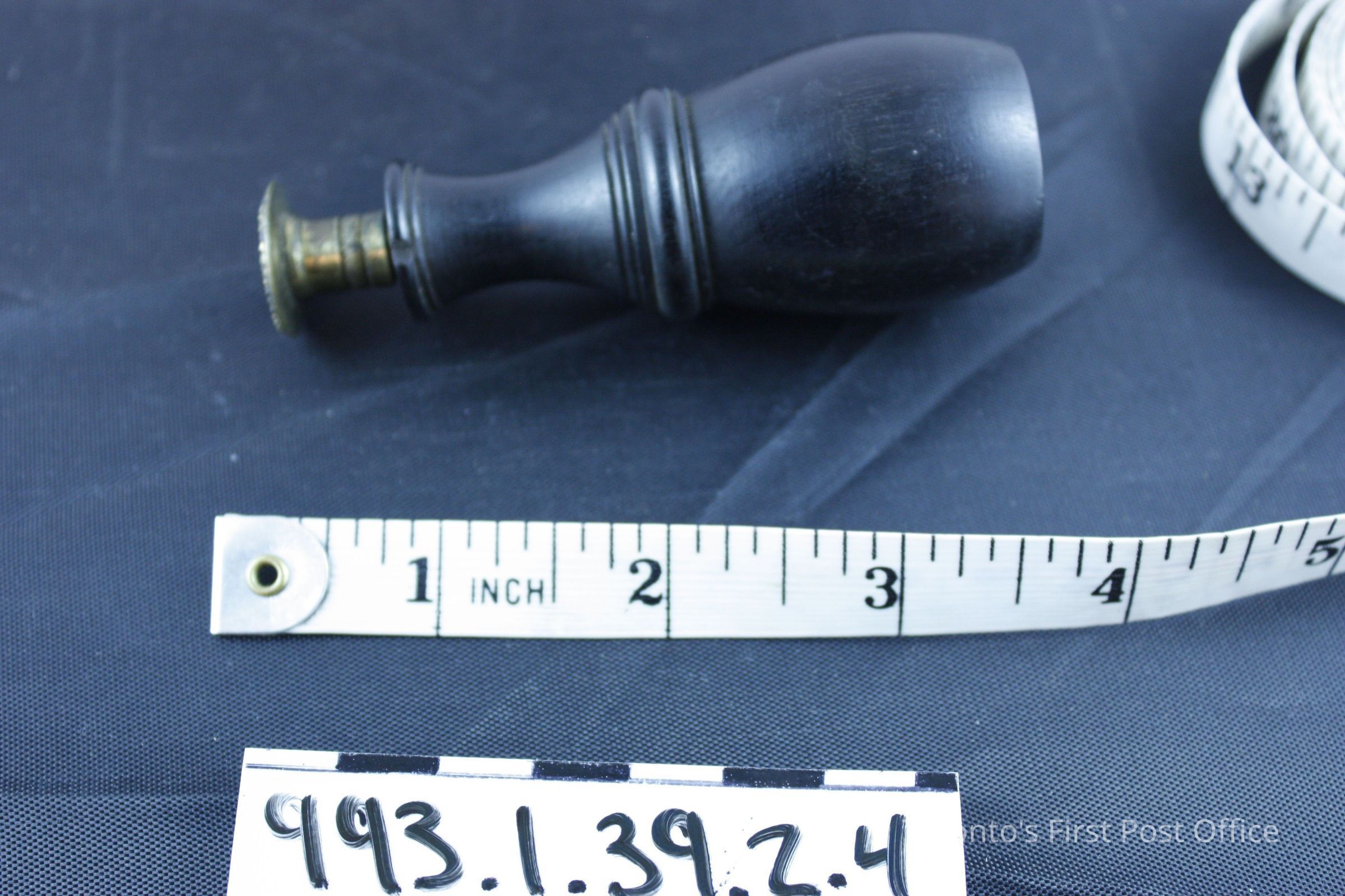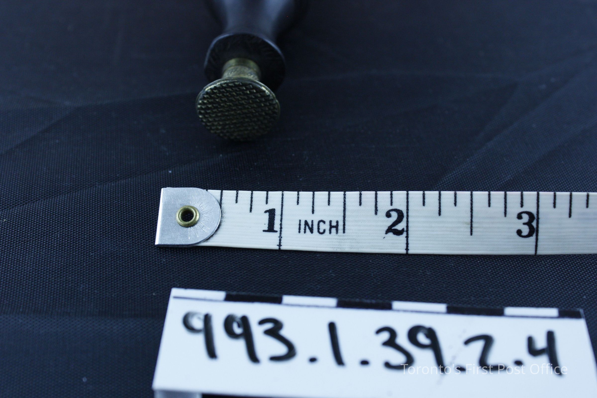 Seal with wood handle; dark brown; circular brass head with cross hatch design; circa 19th C.Dimensions