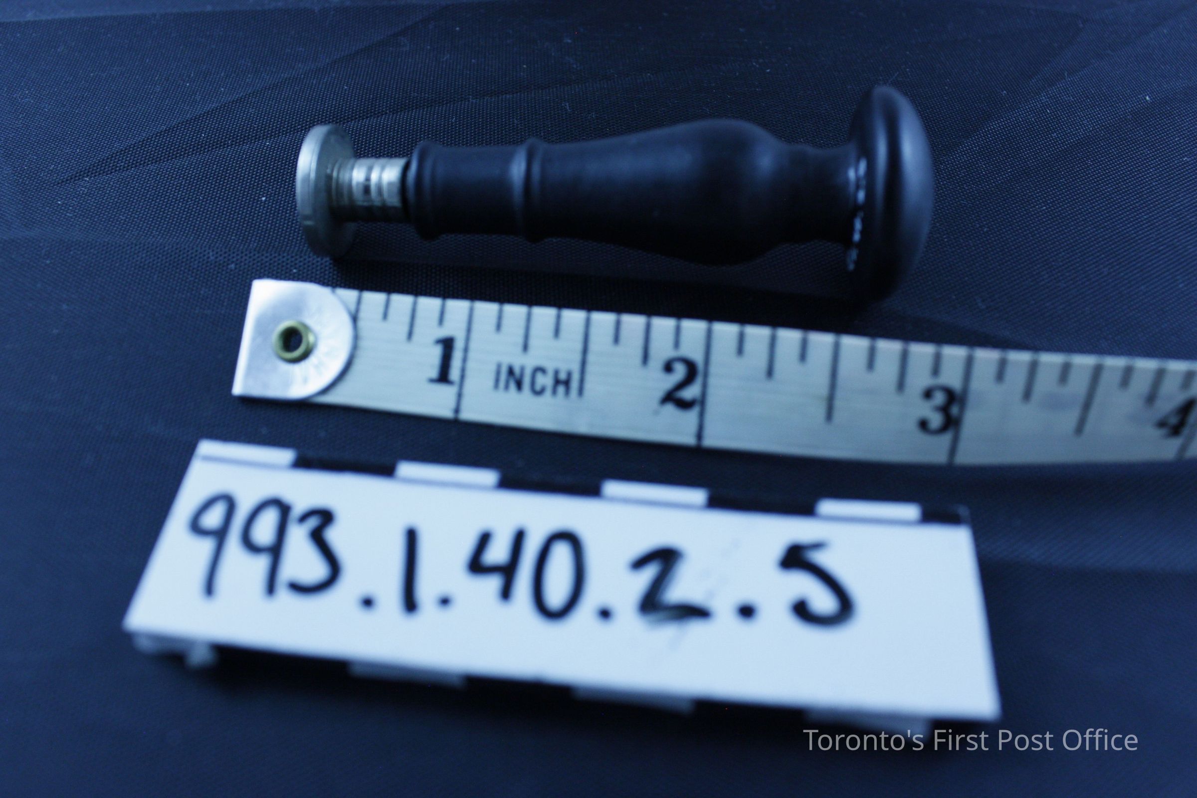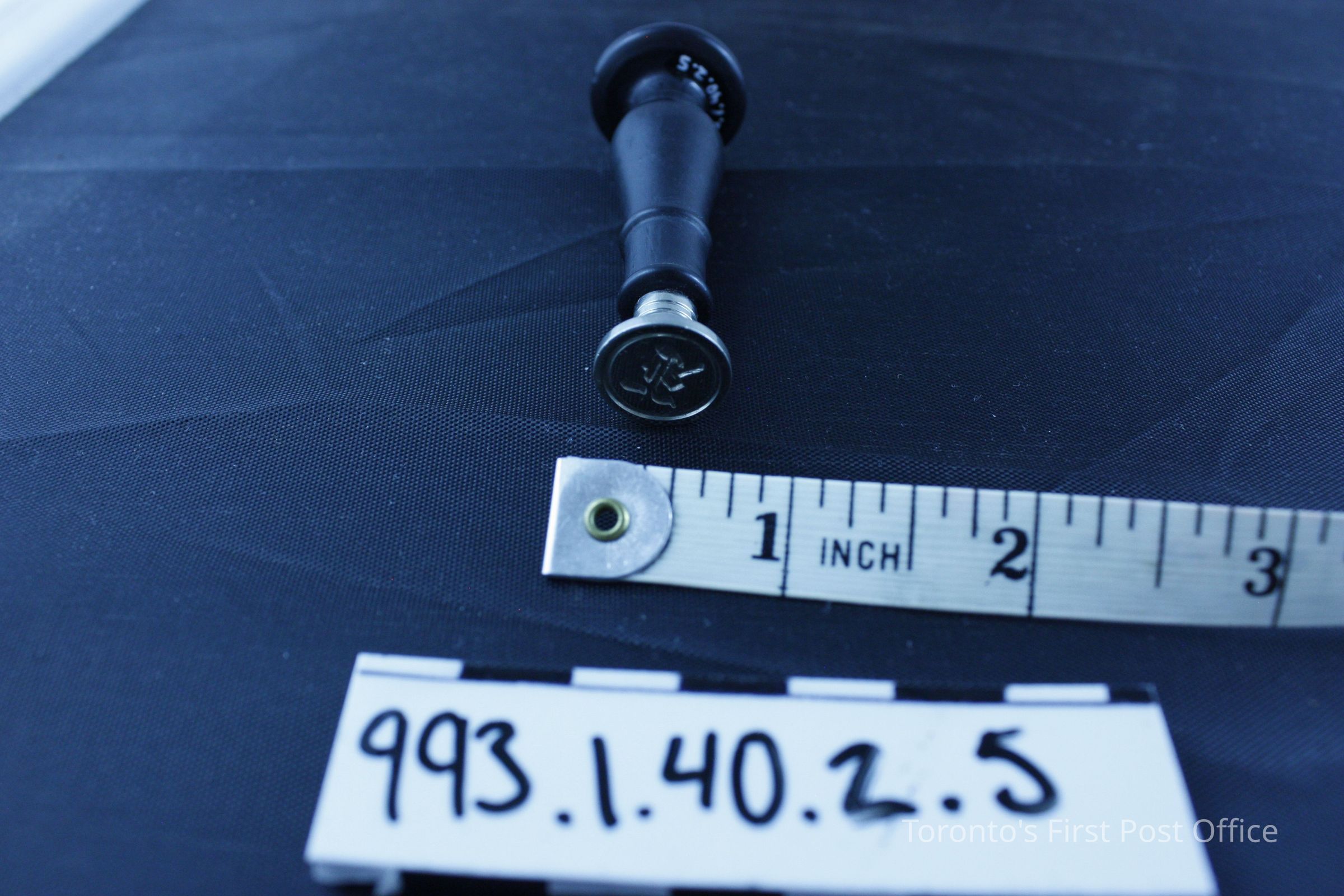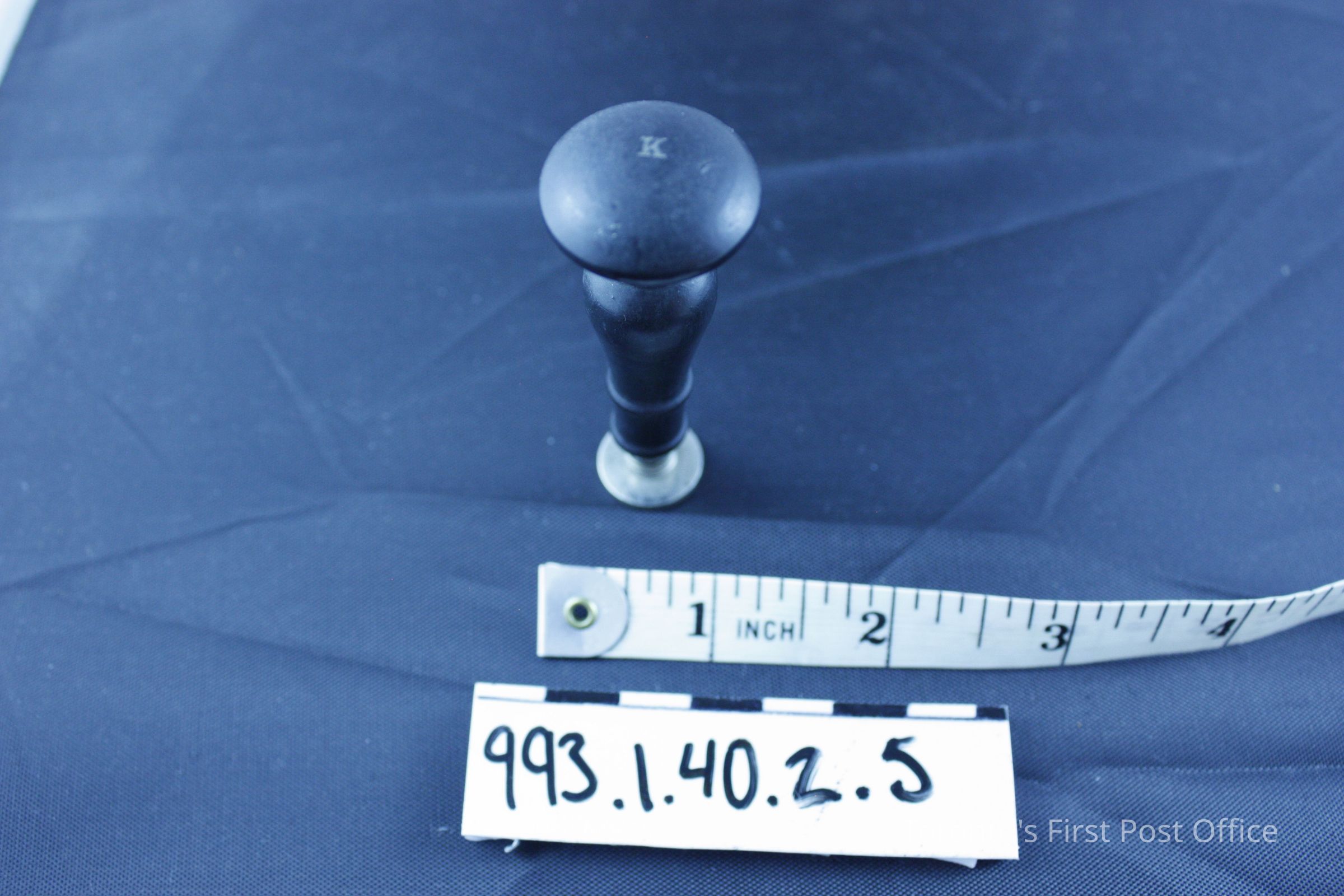 Seal with wood handle; black finish; machine turned; convex top with carved "K"; alloy seal; very light; silver colour; circular with initial "K"; circa 1930s; manufacturer: Dennison.Dimensions
