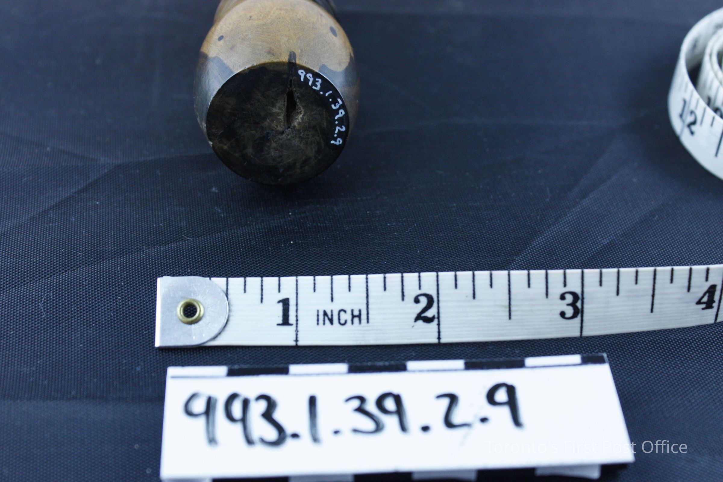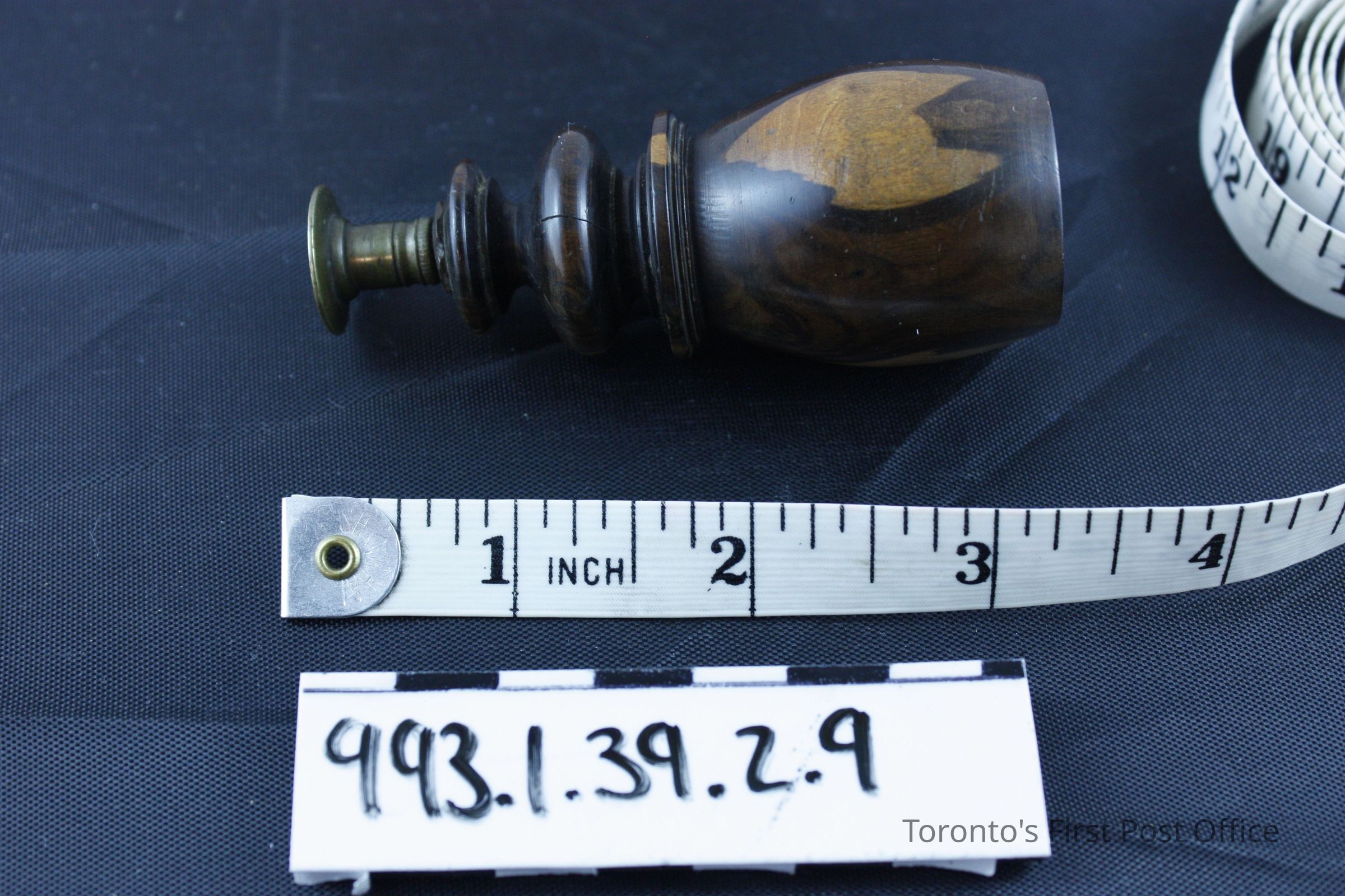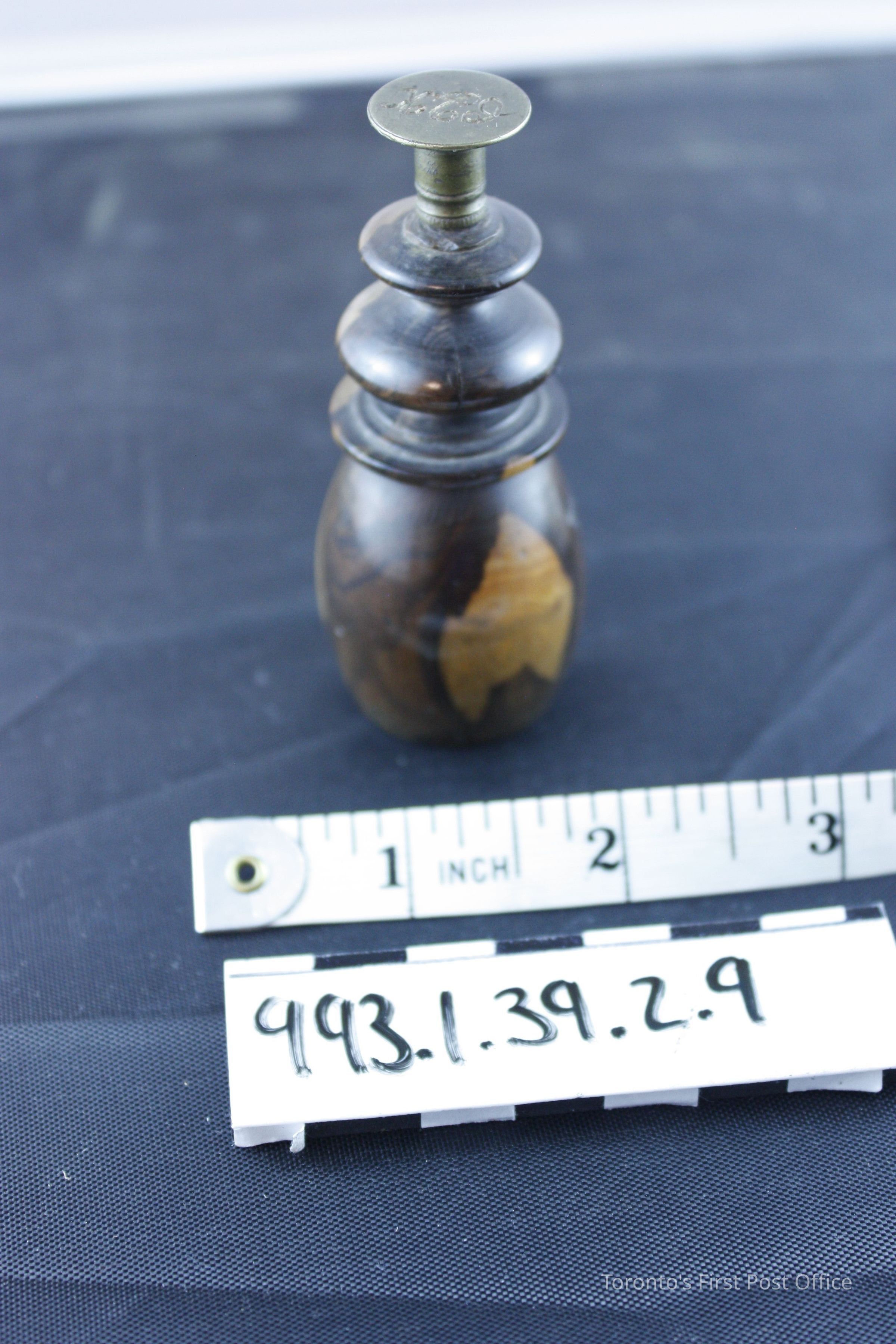 Seal with wood handle; dark brown with lighter patches on either side of knob; shiny finish; circular brass seal with initials "CPK"; circa 19th C.Dimensions