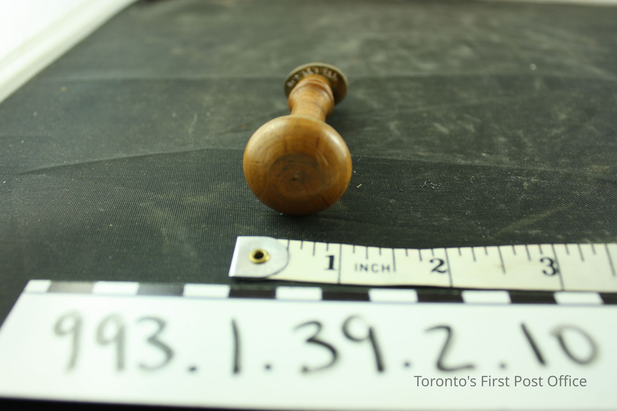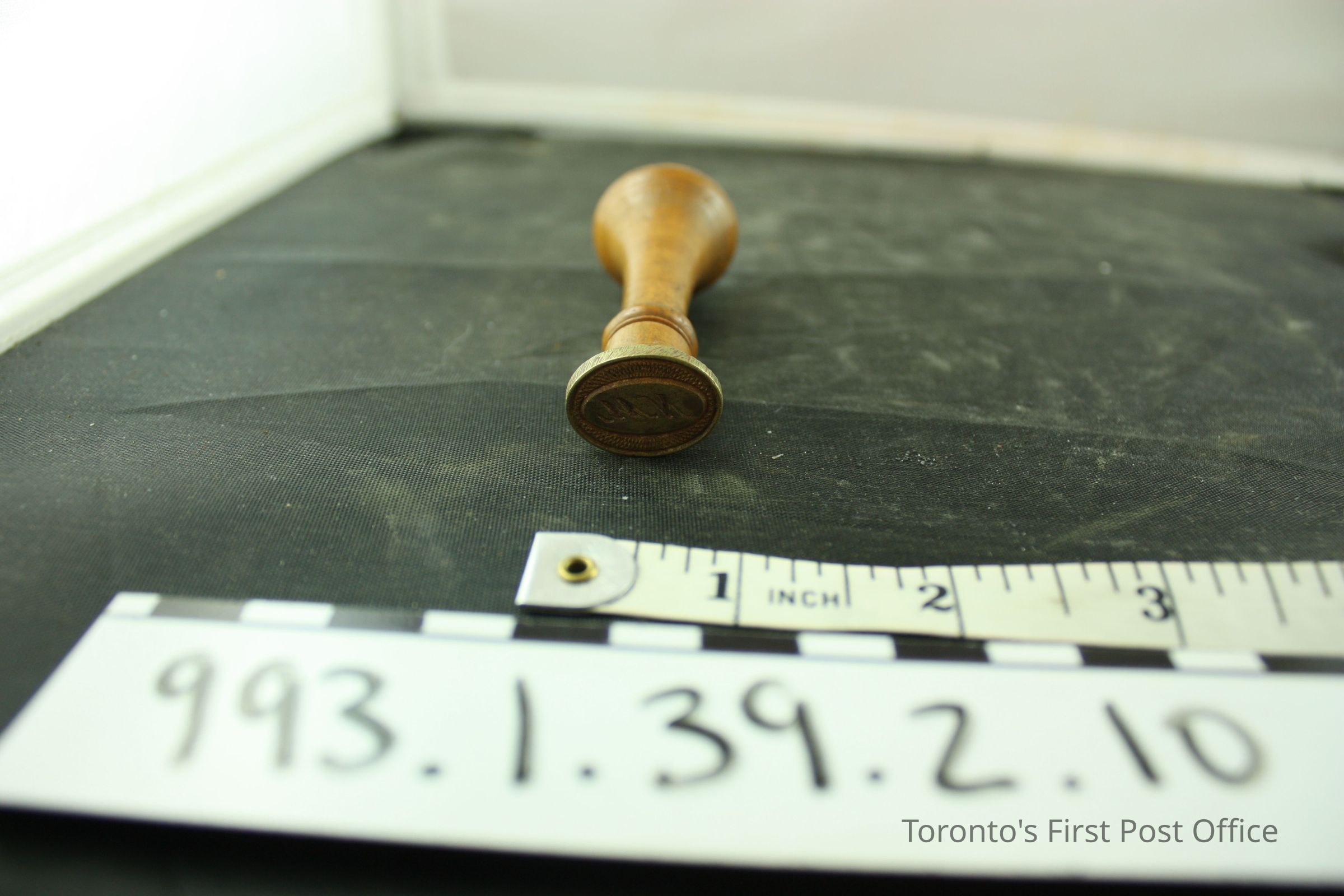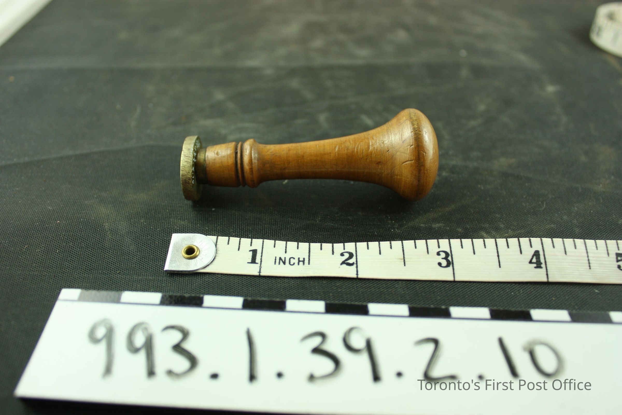 Seal with wood handle; machine turned; convex top; brass seal, oval with initials "WN"; circa 19th C.Dimensions