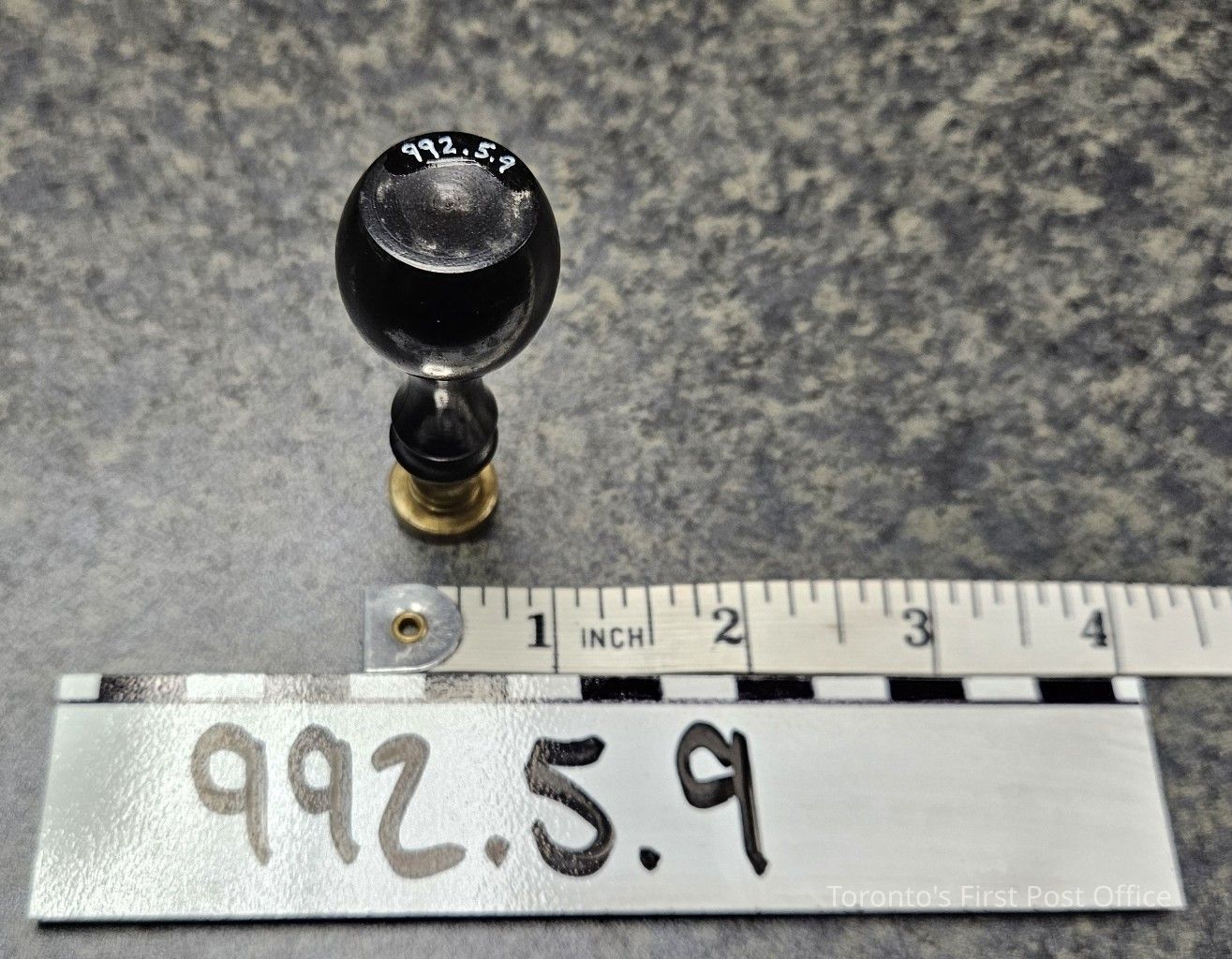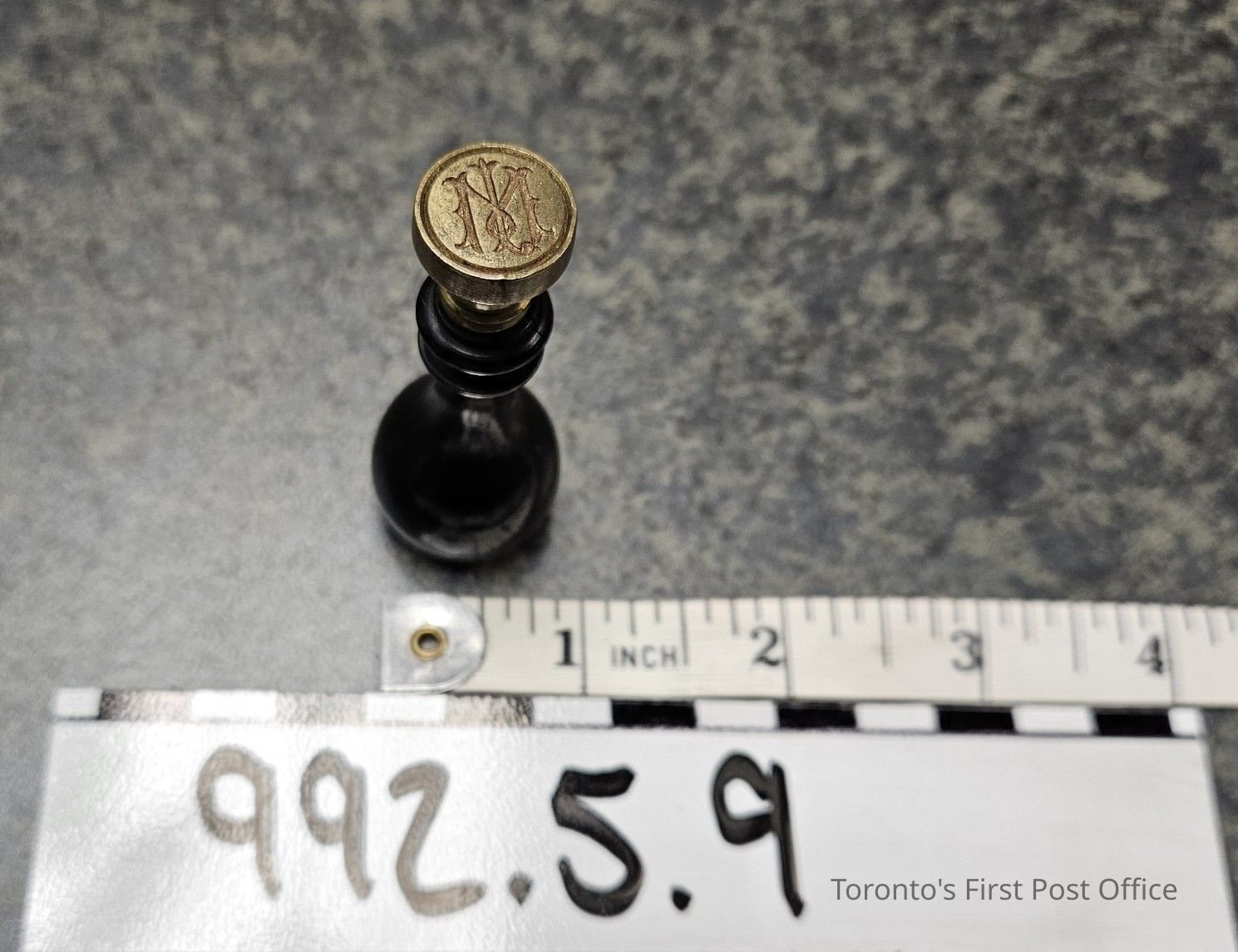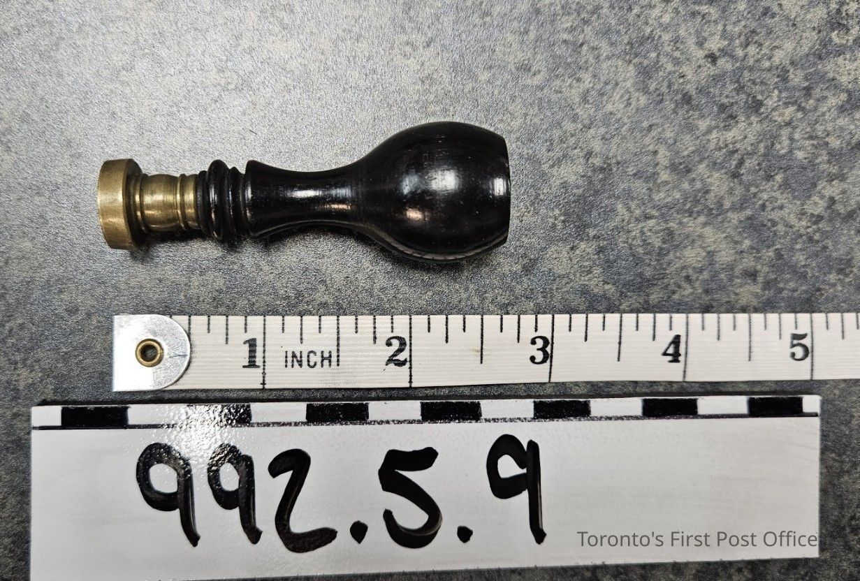 Seal with black wooden handle; turned; brass face; "M".