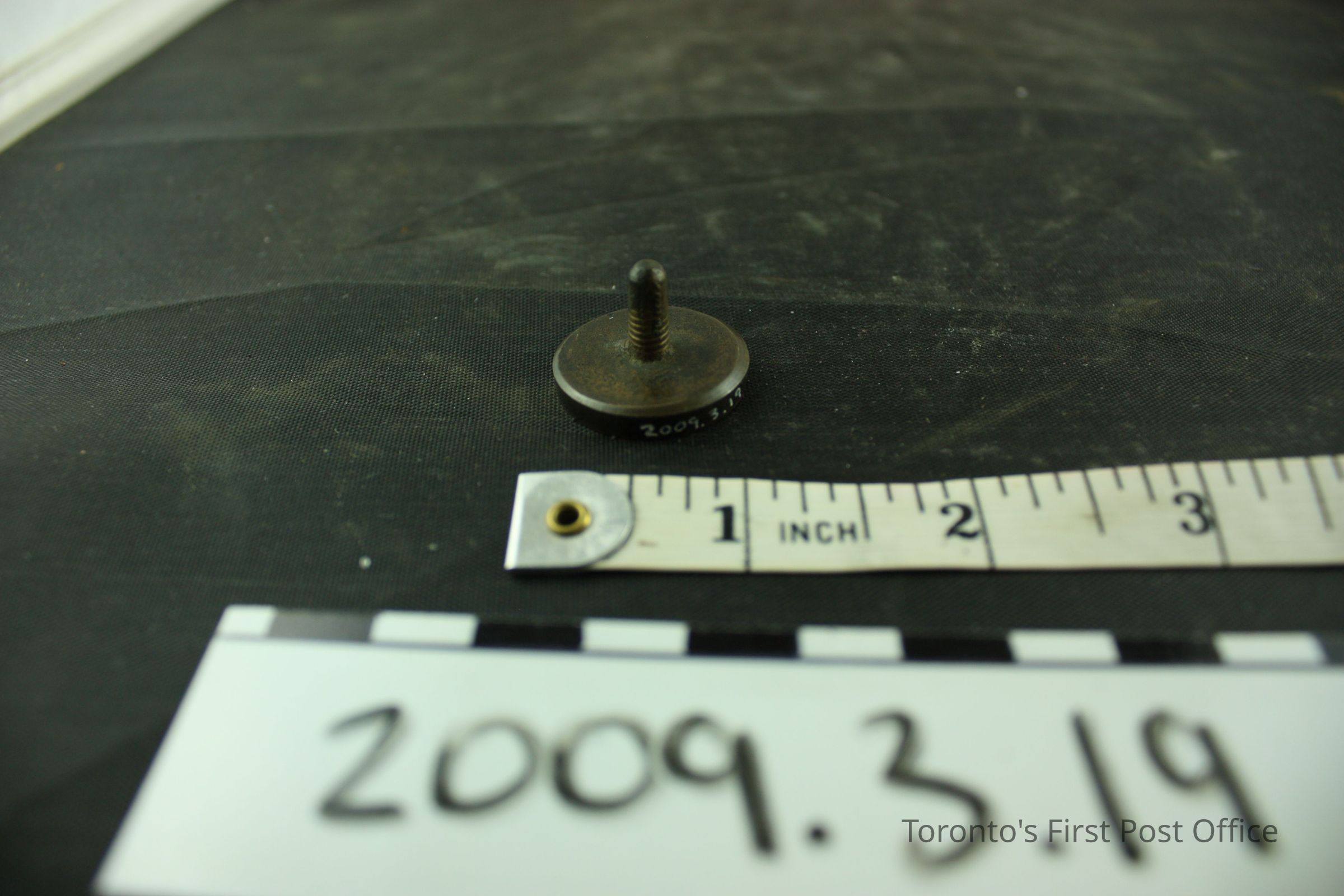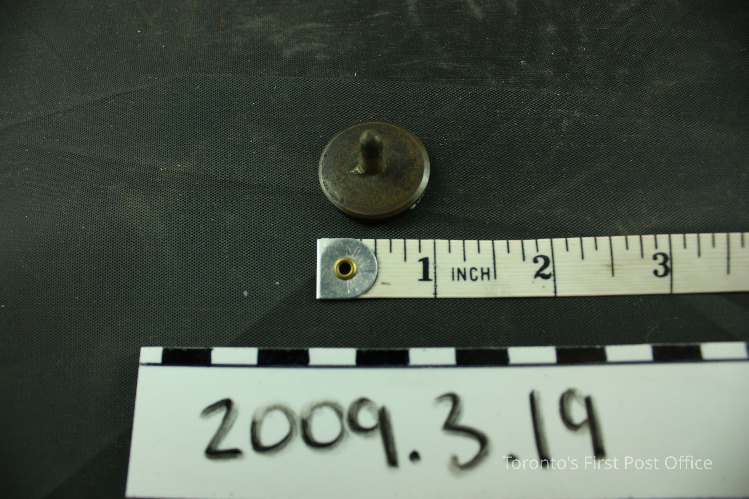 One seal head (no handle); brass; flat, circular seal is banner with block lettering "DUMFRIES" above script "No: 7."; screw tip for missing handle; c. 1850.Dimensions