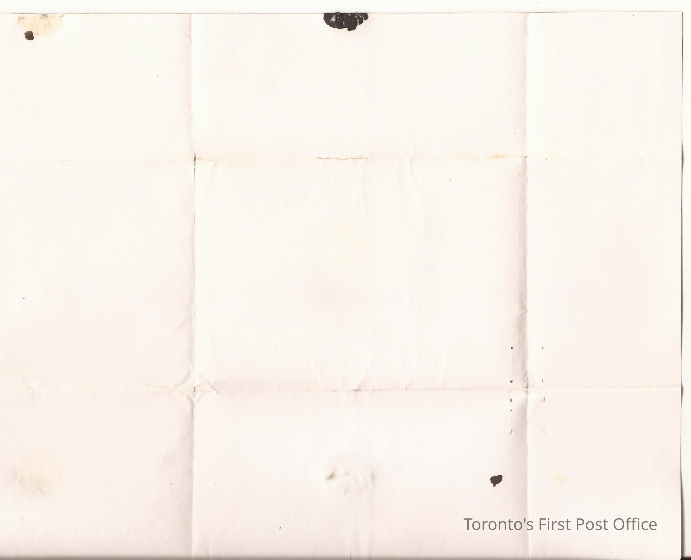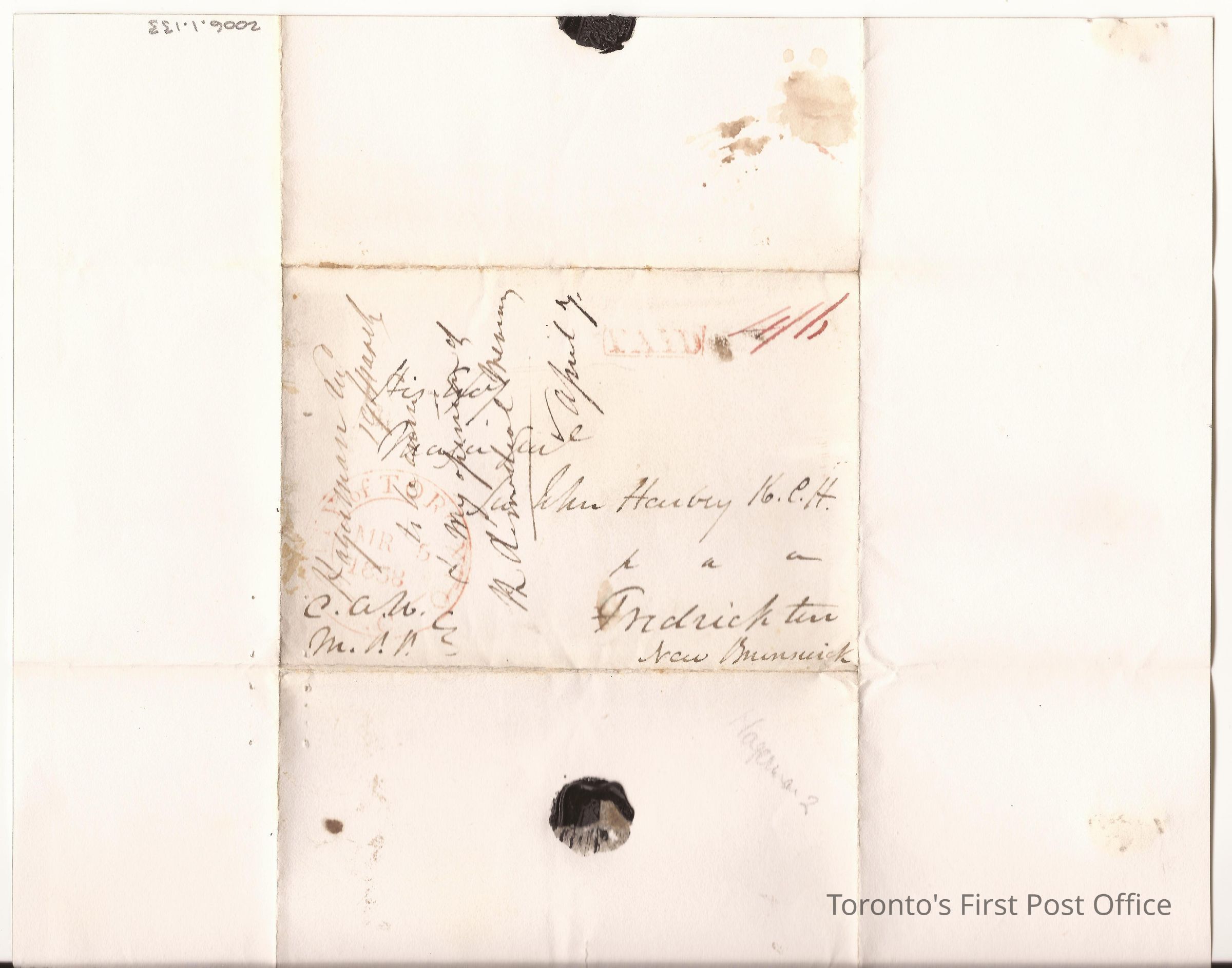Cover; white card; addressed to "John Harby(?) Fredrickton New Brunswick"; from "C.A.H. M.P.P." all in brown in manuscript; topic of letter is cross-written; stemped "PAID" and double-ringed "CITY OF TORONTO U.C. MR 5 1838" in red ink and "4/6" in red manuscript; seal is black wax with initials, probably CAH but pieces missing.Update Date