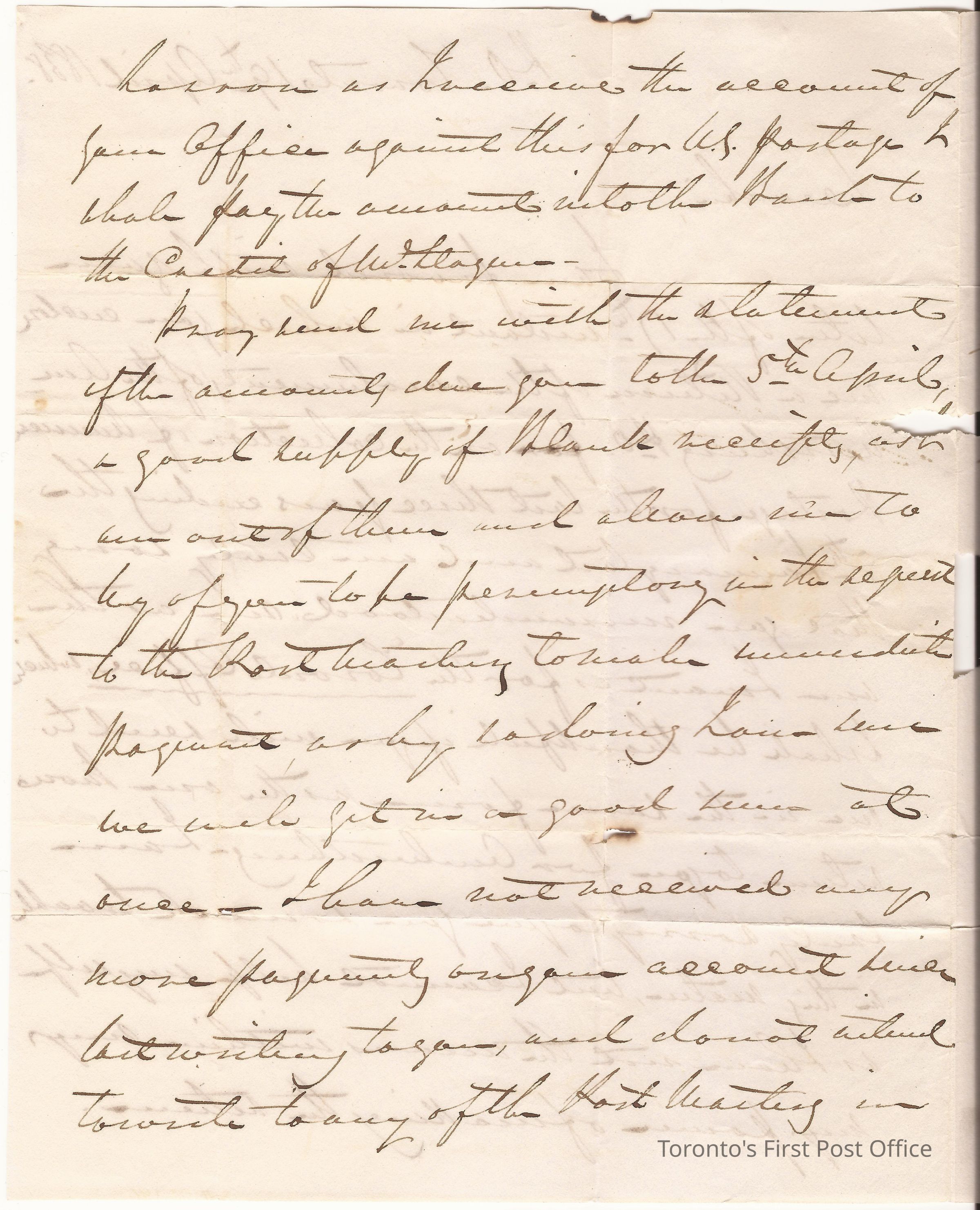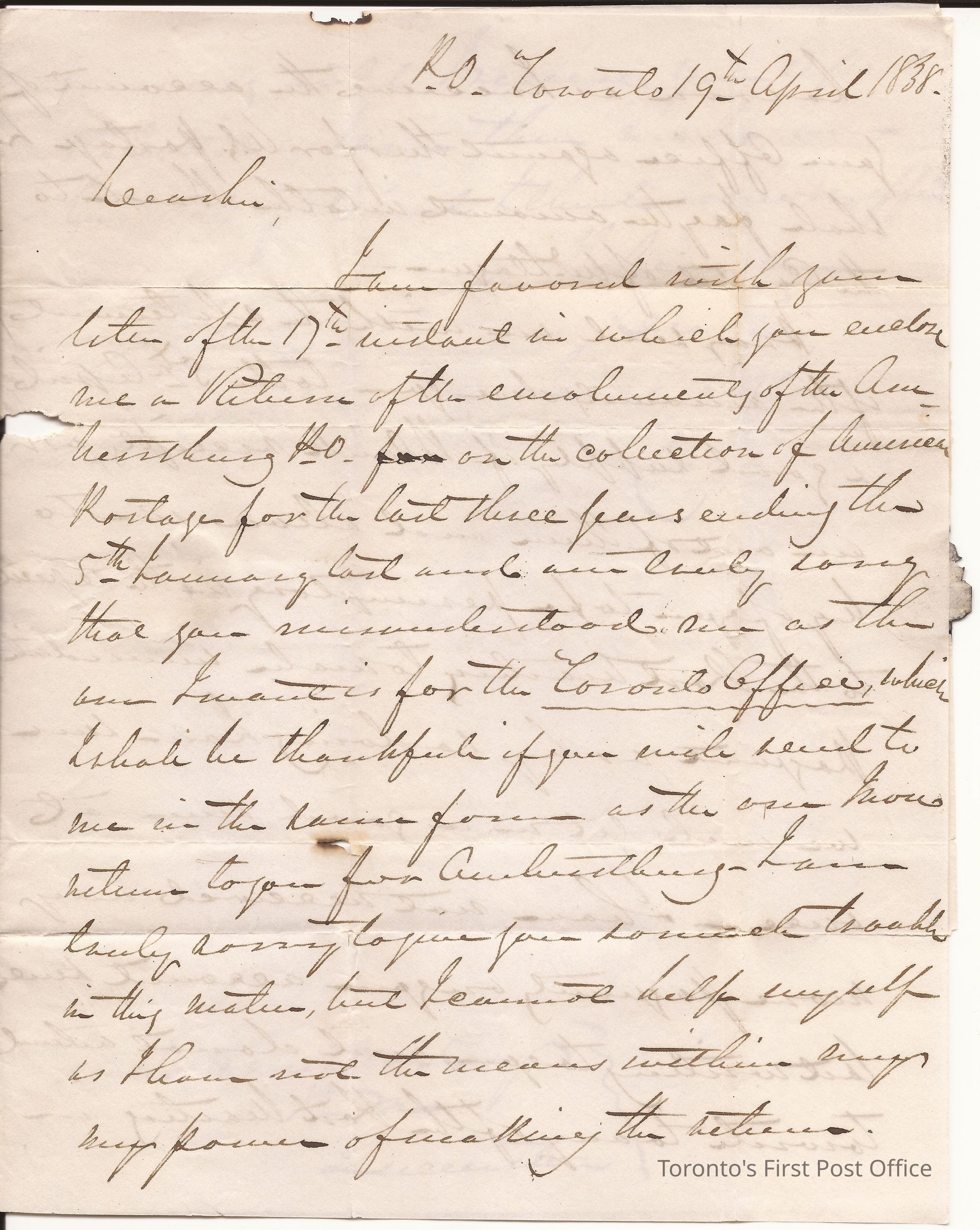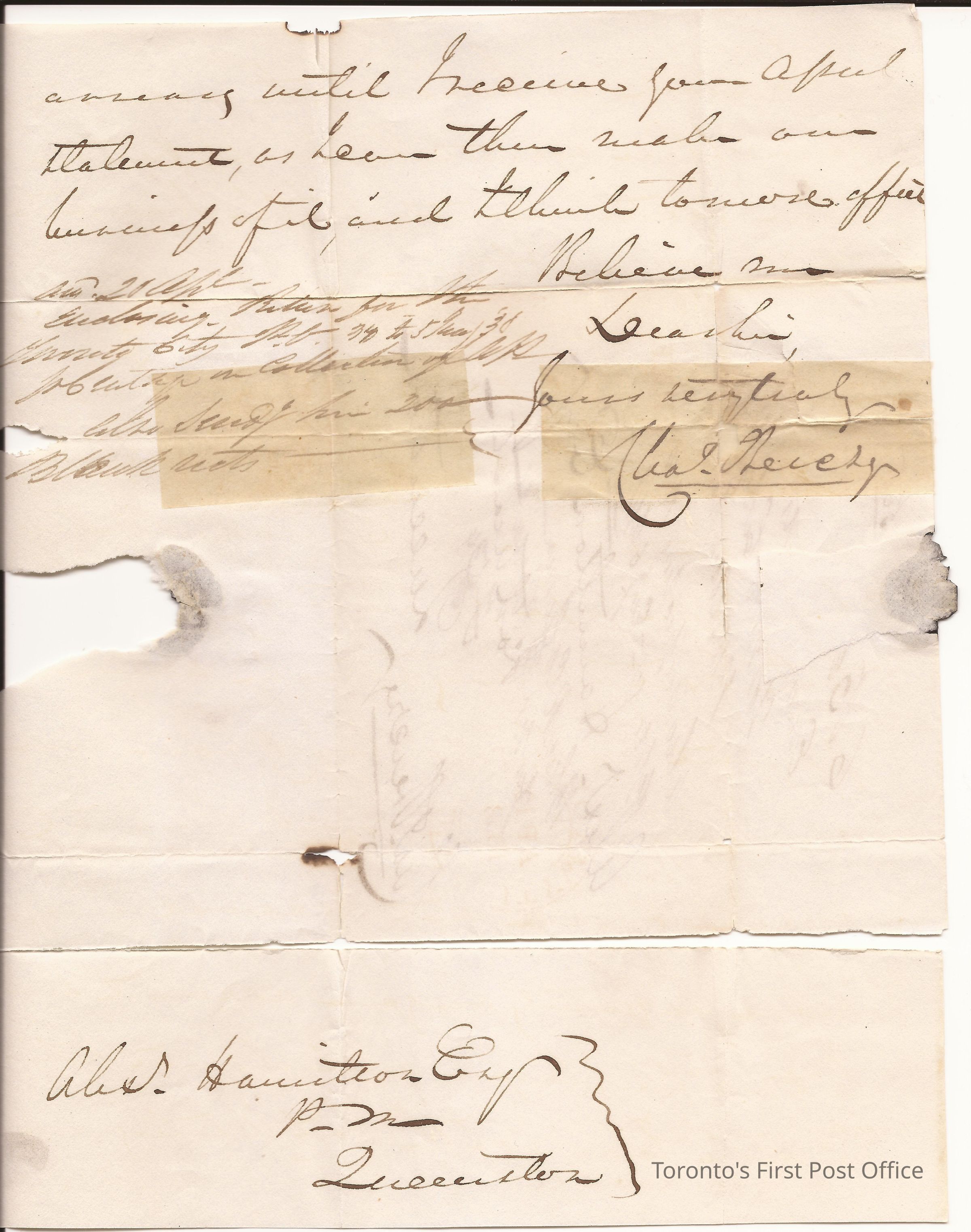 Black wax seal impression of Charles Berczy, marked "ENTRE NOUS" on stampless, folded letter; dated: 19 April 1838.