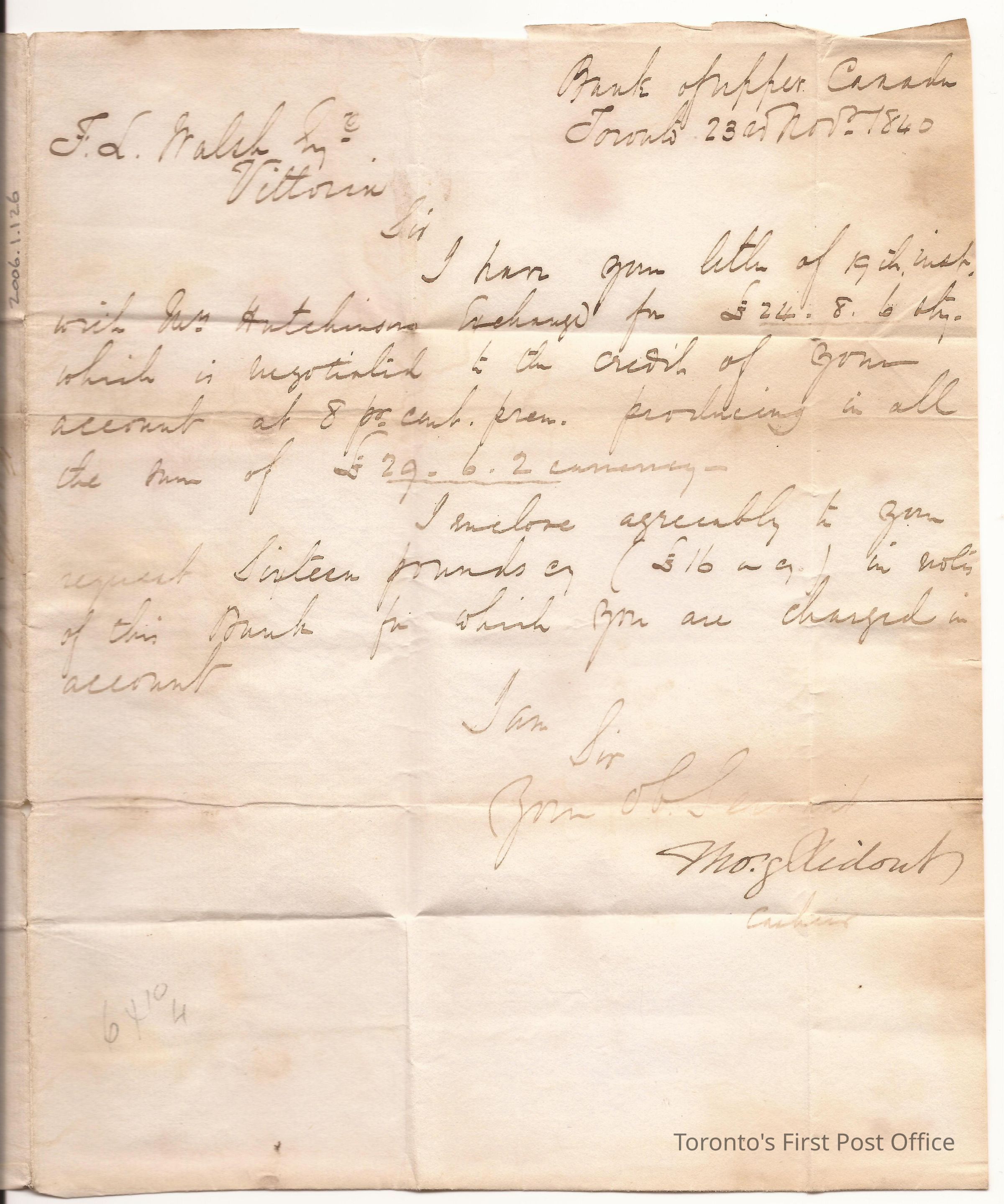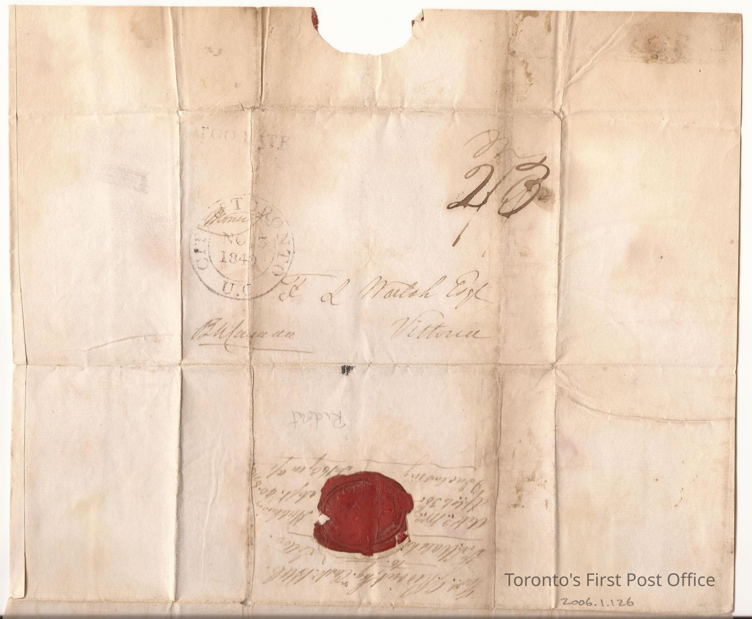 Letter and cover on white laid paper; addressed to FL Walsh Esq. Vittoria" in brown ink; stamped "CITY OF TORONTO U.C. NO 23 1840" and "TOO LATE" in black; handwritten postage: "2/3"; impression is of Bank of Upper Canada in red wax.Update Date
