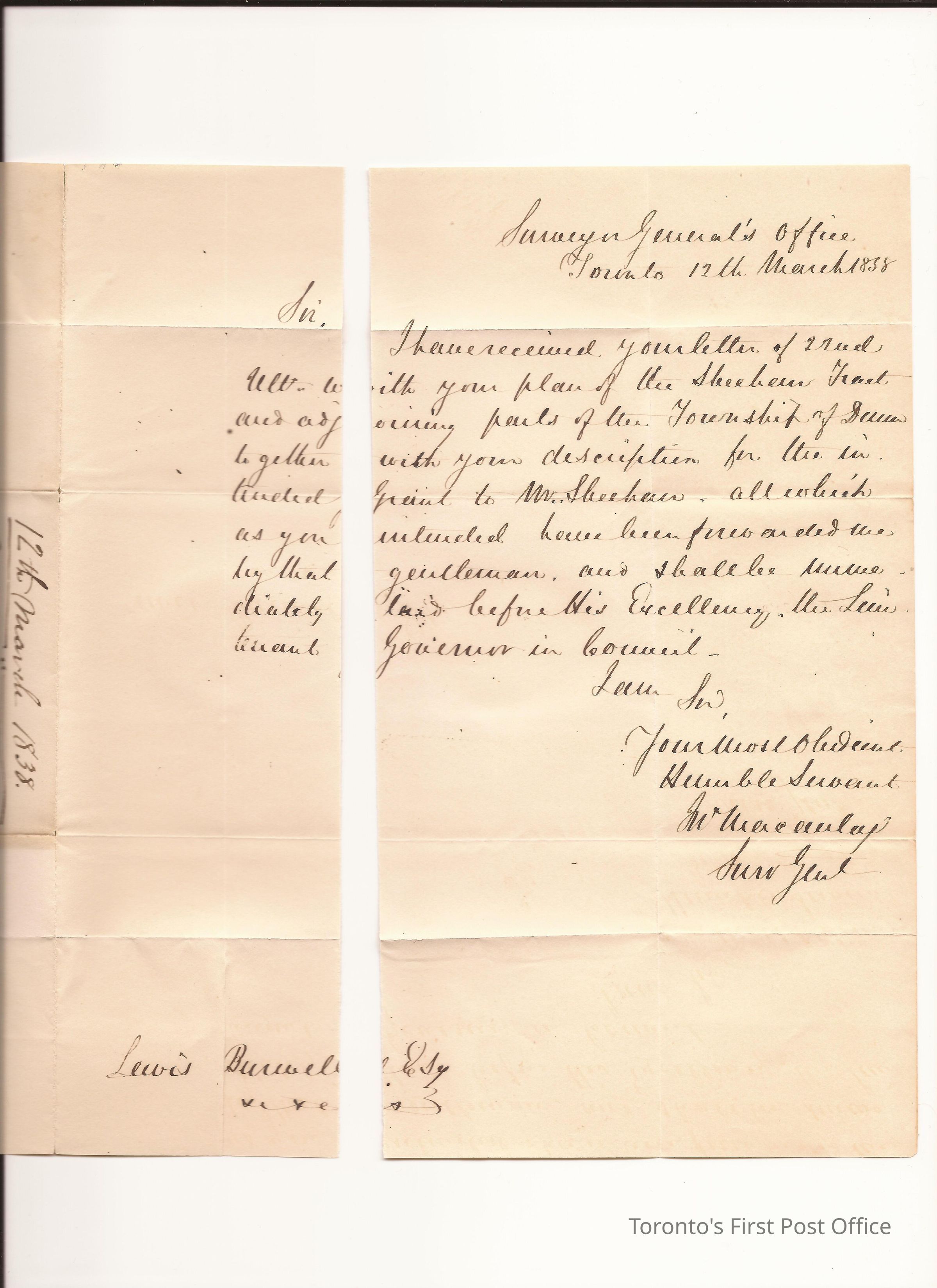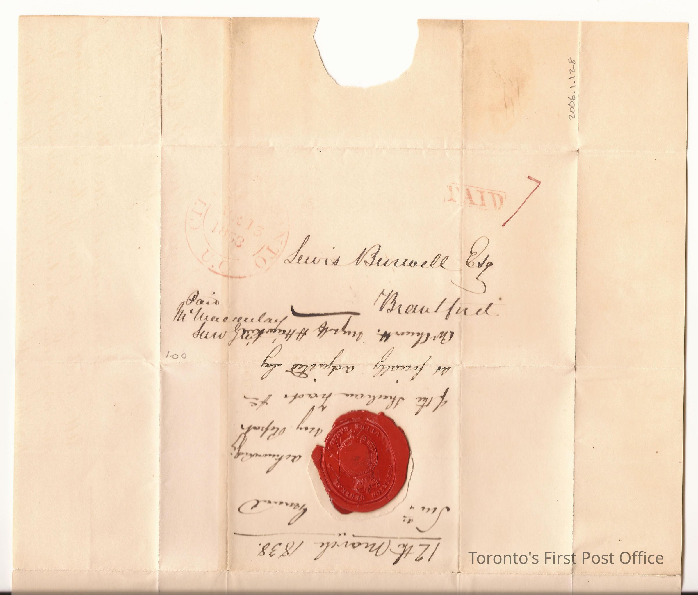 Letter on white card addressed to "Lewis Burwell Esq Brentford" in brown m/s; stamped double circle "CITY OF TORONTO U.C. MR 13 1838" and "PAID" in red ink; m/s "7" in red ink; letter signed by John Macaulay; red wax seal is crest of Surveyor General of Upper Canada.Update Date
