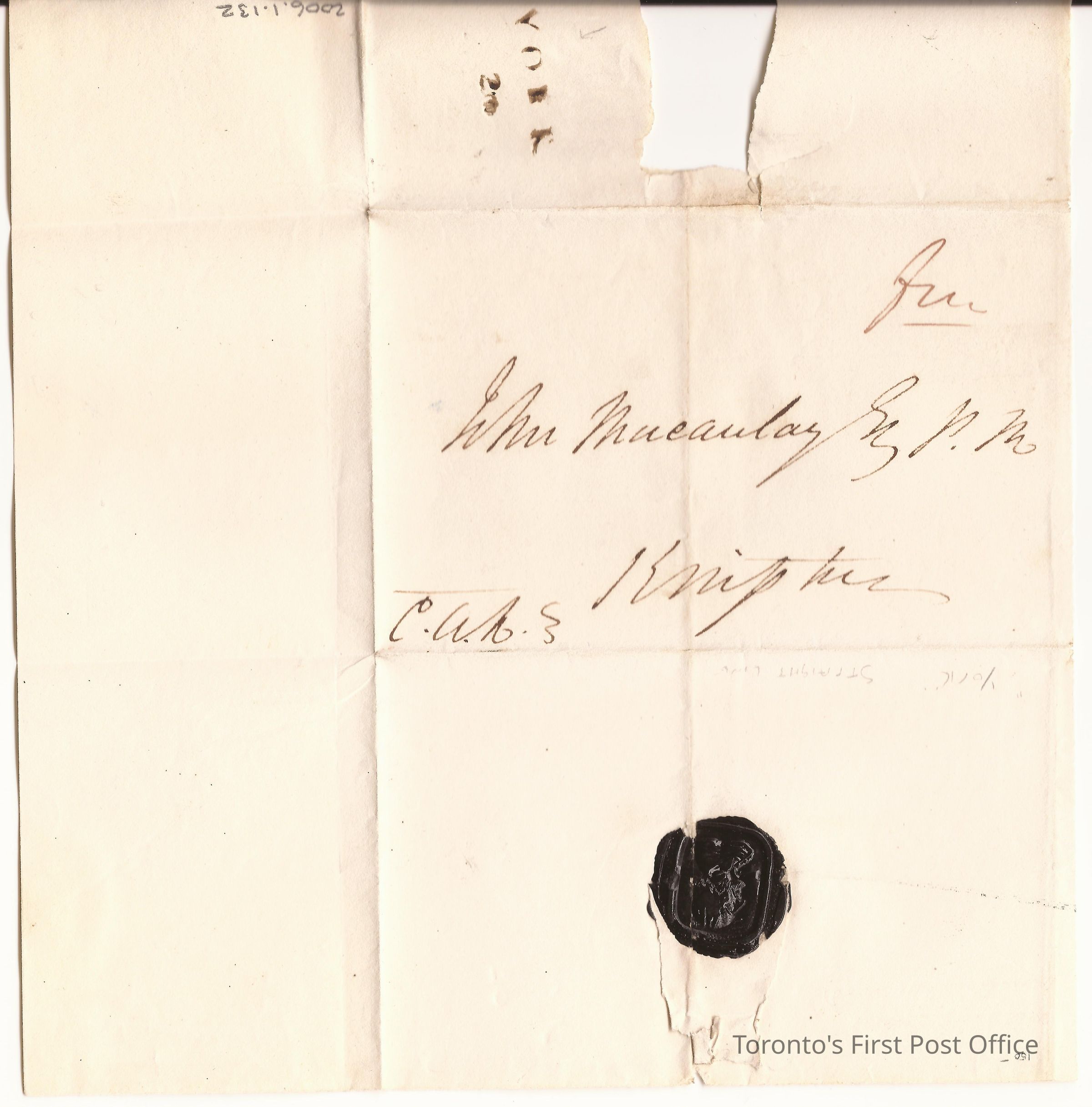 Cover on white watermarked paper; addressed to "John Macaulay… P.M Kingston" and signed "C.A.H." in dark brown ink manuscript; "Free" in light brown manuscript; reverse stamped "YORK 2"; black wax seal impression is of Wellington in profile sinister; circa 1822.Update Date
