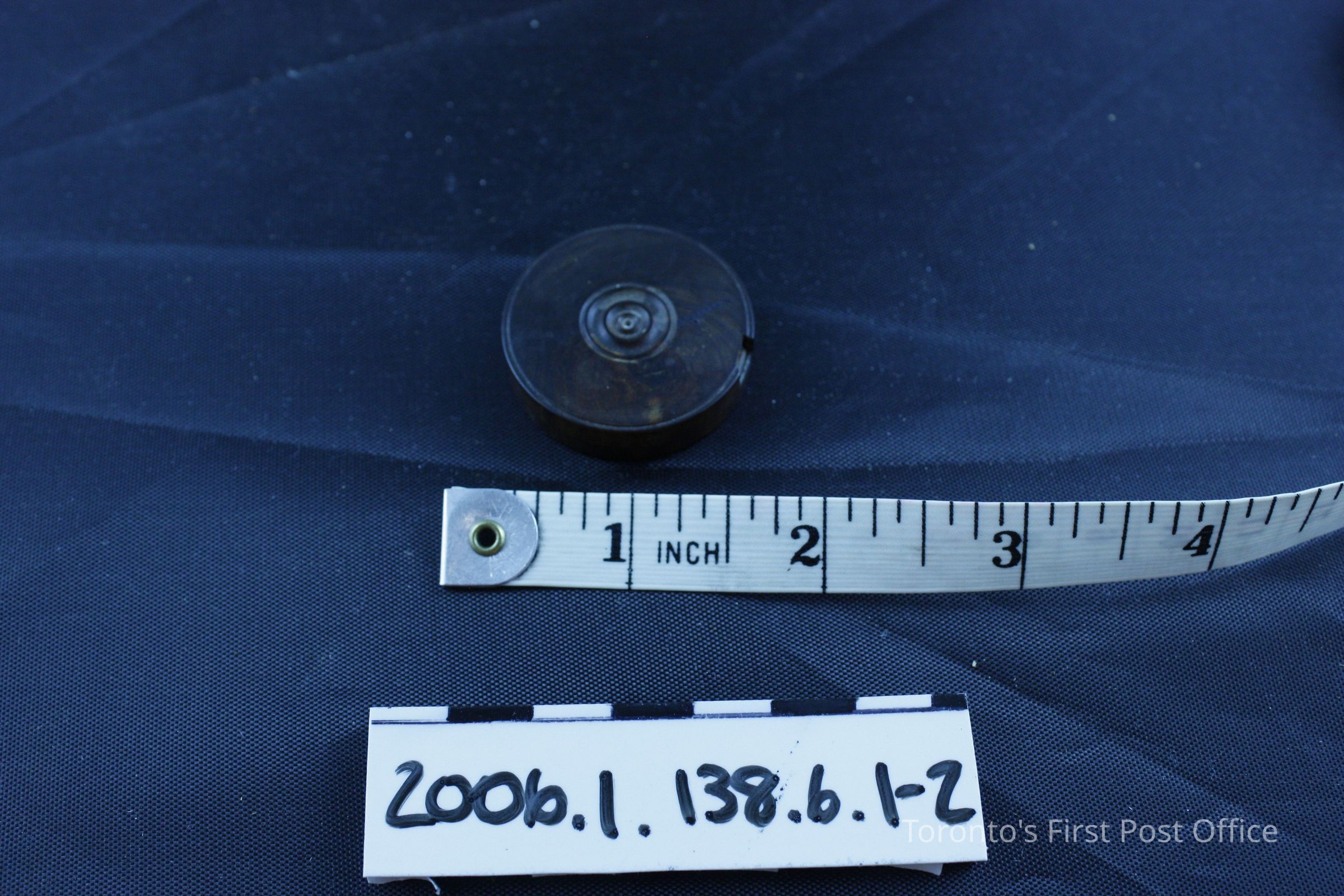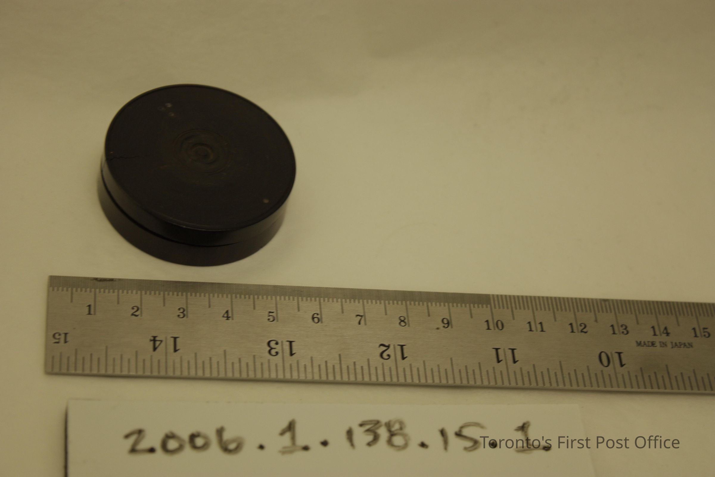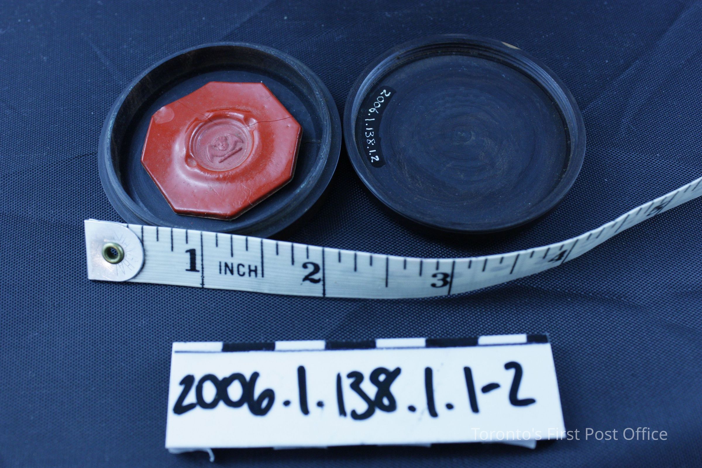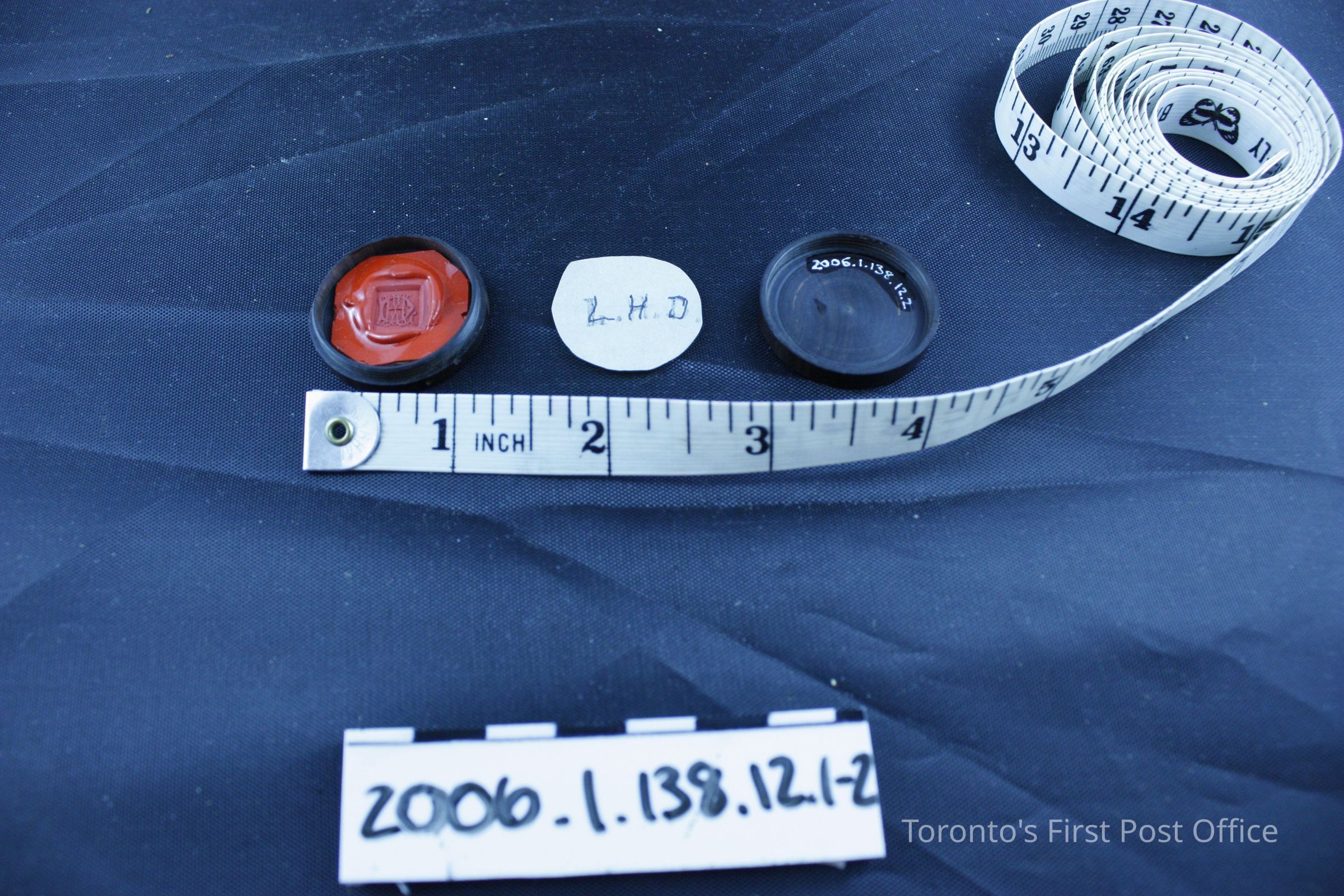 Fifteen sealing wafers in boxes; all boxes are rosewood, round, with screw-off lids; proofs as follows: .1: red wax proof; small, round seal of cherub head and wings over bar; .2: red wax proof; eight-sided seal of crest with stork with spread wings; head couped at neck by crest; tag in lid: "Thos Brown Esq" in brown m/s; .3: red wax proof; small oval seal of rearing dog in profile sinister; .4: red wax proof; eight-sided seal with bar, snake, pointing hand, and motto in banner: "SI DIUS, QUIS CONTRA"; tag with print also in box; .5: red wax proof; circular seal with bee and motto in banner: "VIVE ET VIVAS"; .6: red wax proof; small oval seal with star over gothic "TYR"; .7: red wax proof; small circular seal with motto: "LOYAL AN MORT"; lid interior covered with blue paper; .8: red wax proof with crest; animal over initials over motto; proof on paper; .9: red wax proof with eight-sided seal with overlaid initials: "NHI"; .10: red wax proof; oval seal with shell surrounded by belt with motto "DEPRESSIS PATENS"; .11: red wax proof; small circular seal with mouse; .12: red wax proof; square seal with overlaid initials: "LHD"; paper with these initials in lid; .13: bronze wax proof; oval seal with crest; written on back of paper affixed to seal: "Arms of Mrs. Iansla(?) related to John Maytons(?)"; green paper on base of box interior; .14: red wax proof; diamond seal with shield surmounted by crown; surrounded by "MR"; on white paper; .15: red wax proof; small circular seal with shield surmounted by cherub and wings; over motto "TOUT JOUR PRET".Dimensions