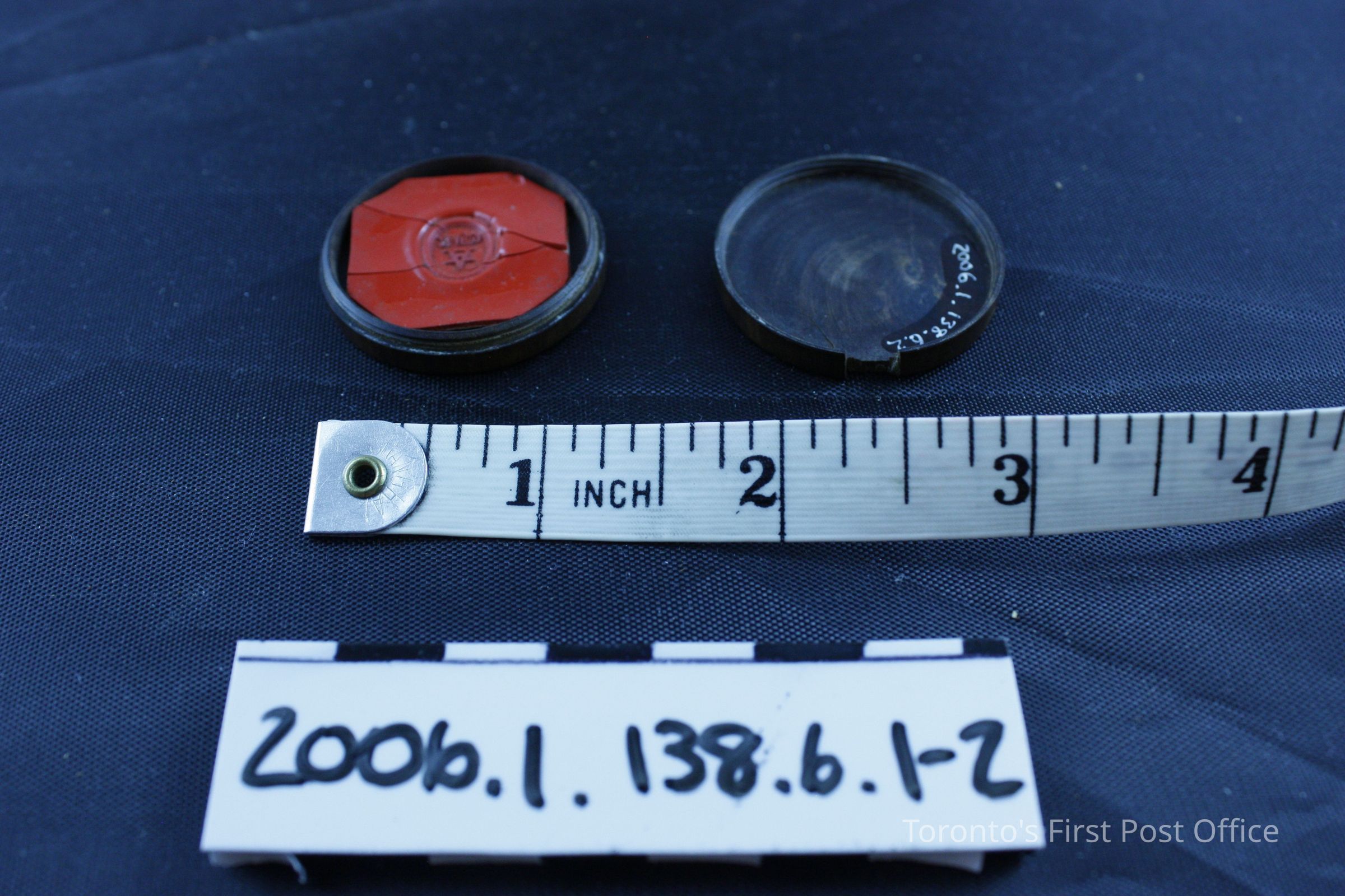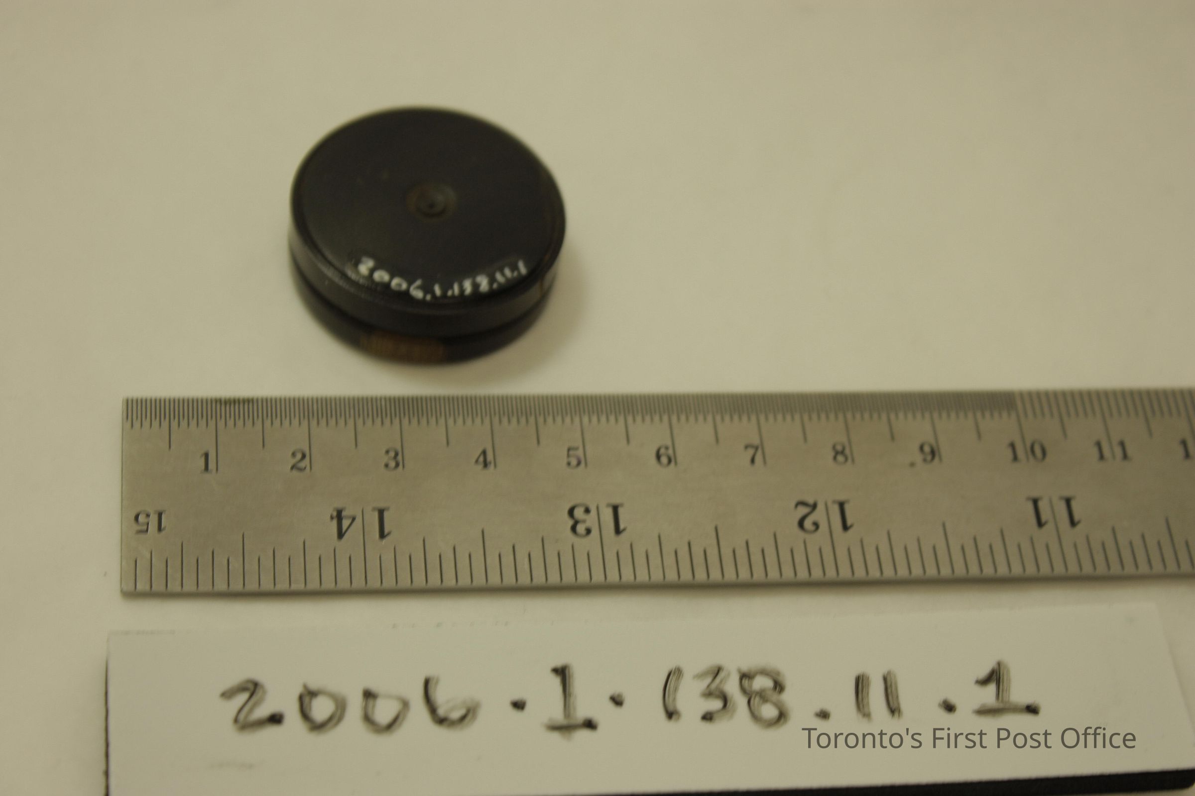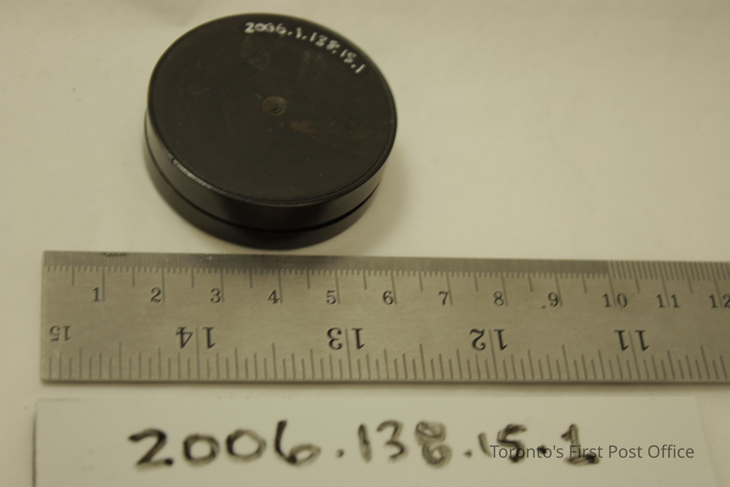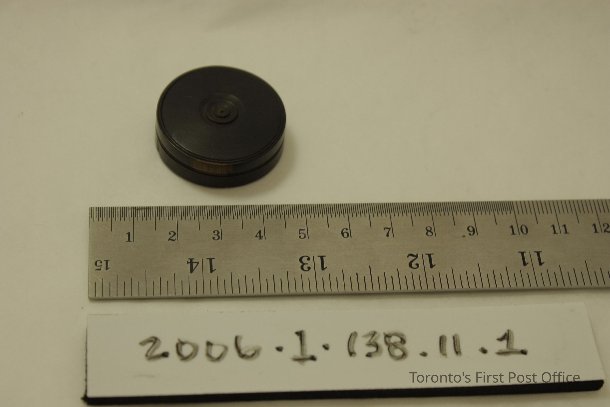 Fifteen sealing wafers in boxes; all boxes are rosewood, round, with screw-off lids; proofs as follows: .1: red wax proof; small, round seal of cherub head and wings over bar; .2: red wax proof; eight-sided seal of crest with stork with spread wings; head couped at neck by crest; tag in lid: "Thos Brown Esq" in brown m/s; .3: red wax proof; small oval seal of rearing dog in profile sinister; .4: red wax proof; eight-sided seal with bar, snake, pointing hand, and motto in banner: "SI DIUS, QUIS CONTRA"; tag with print also in box; .5: red wax proof; circular seal with bee and motto in banner: "VIVE ET VIVAS"; .6: red wax proof; small oval seal with star over gothic "TYR"; .7: red wax proof; small circular seal with motto: "LOYAL AN MORT"; lid interior covered with blue paper; .8: red wax proof with crest; animal over initials over motto; proof on paper; .9: red wax proof with eight-sided seal with overlaid initials: "NHI"; .10: red wax proof; oval seal with shell surrounded by belt with motto "DEPRESSIS PATENS"; .11: red wax proof; small circular seal with mouse; .12: red wax proof; square seal with overlaid initials: "LHD"; paper with these initials in lid; .13: bronze wax proof; oval seal with crest; written on back of paper affixed to seal: "Arms of Mrs. Iansla(?) related to John Maytons(?)"; green paper on base of box interior; .14: red wax proof; diamond seal with shield surmounted by crown; surrounded by "MR"; on white paper; .15: red wax proof; small circular seal with shield surmounted by cherub and wings; over motto "TOUT JOUR PRET".Dimensions