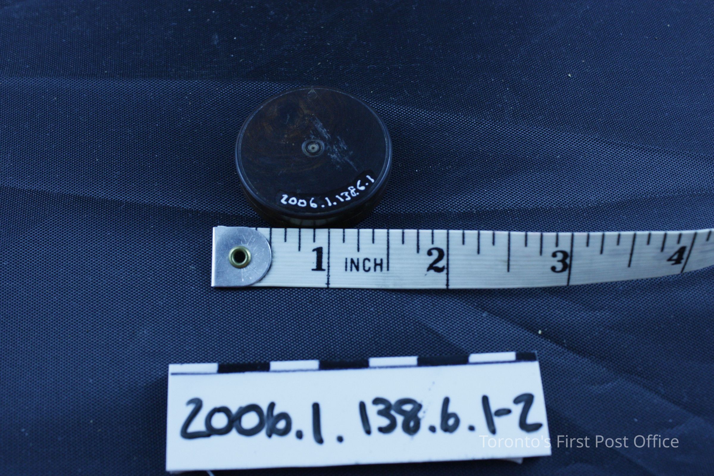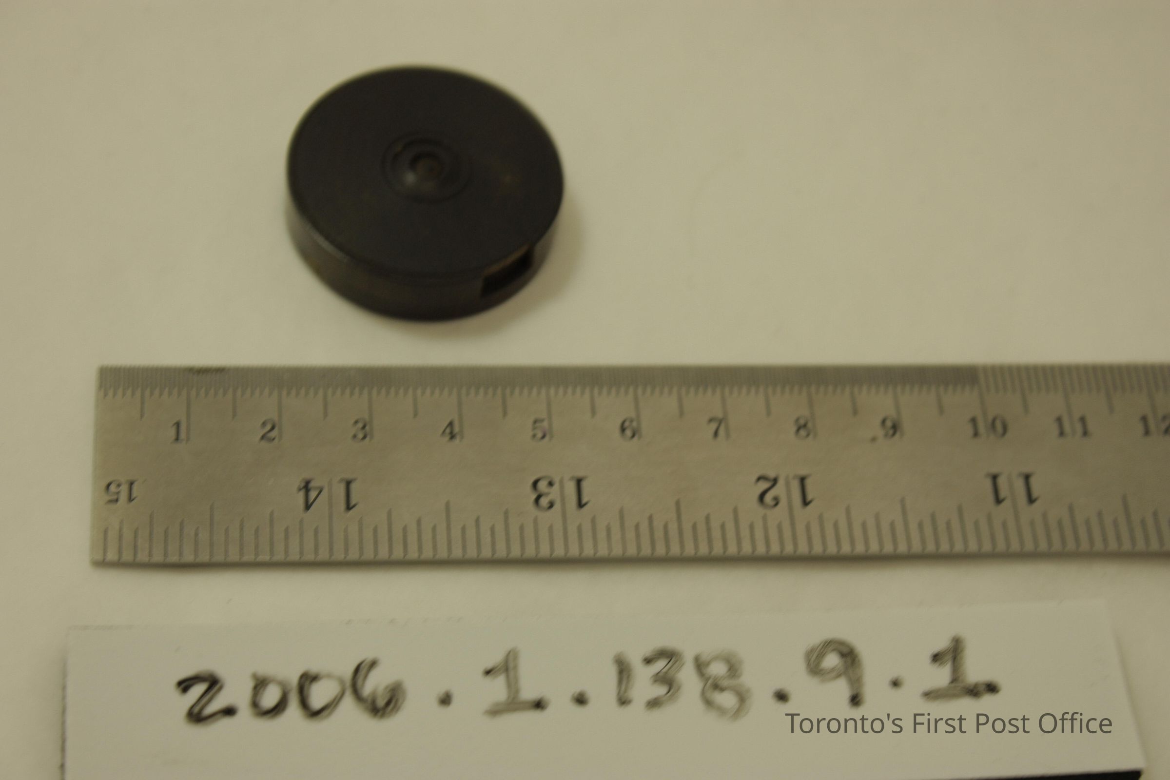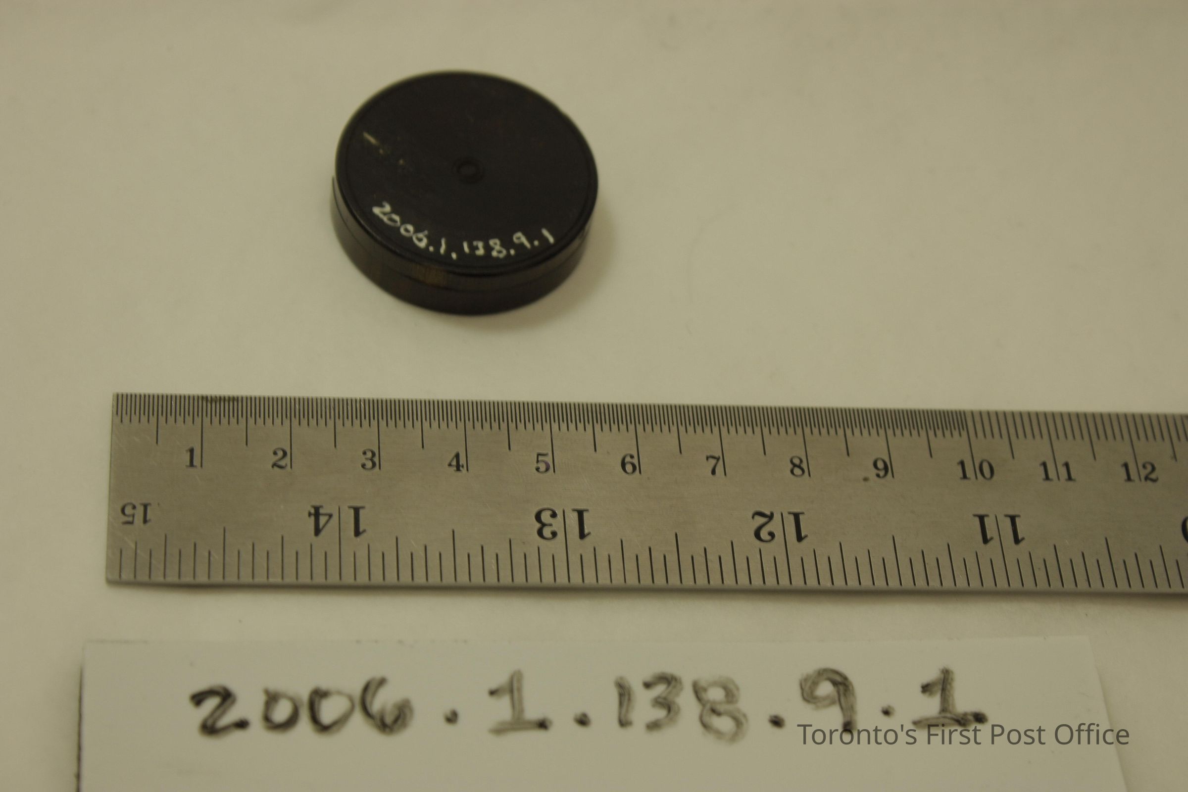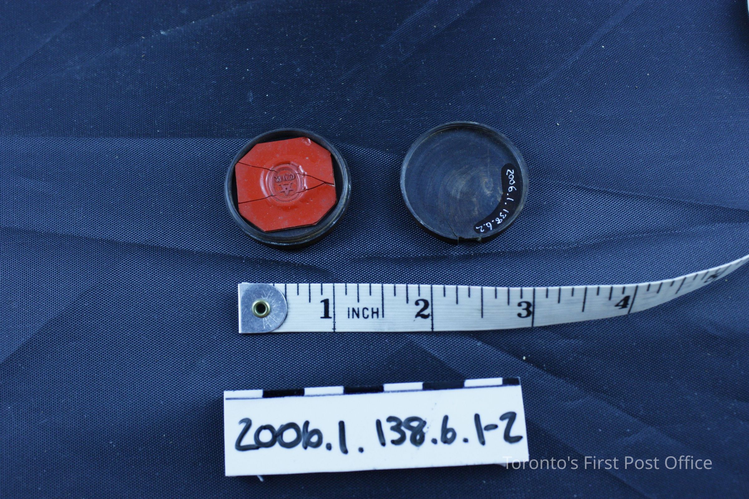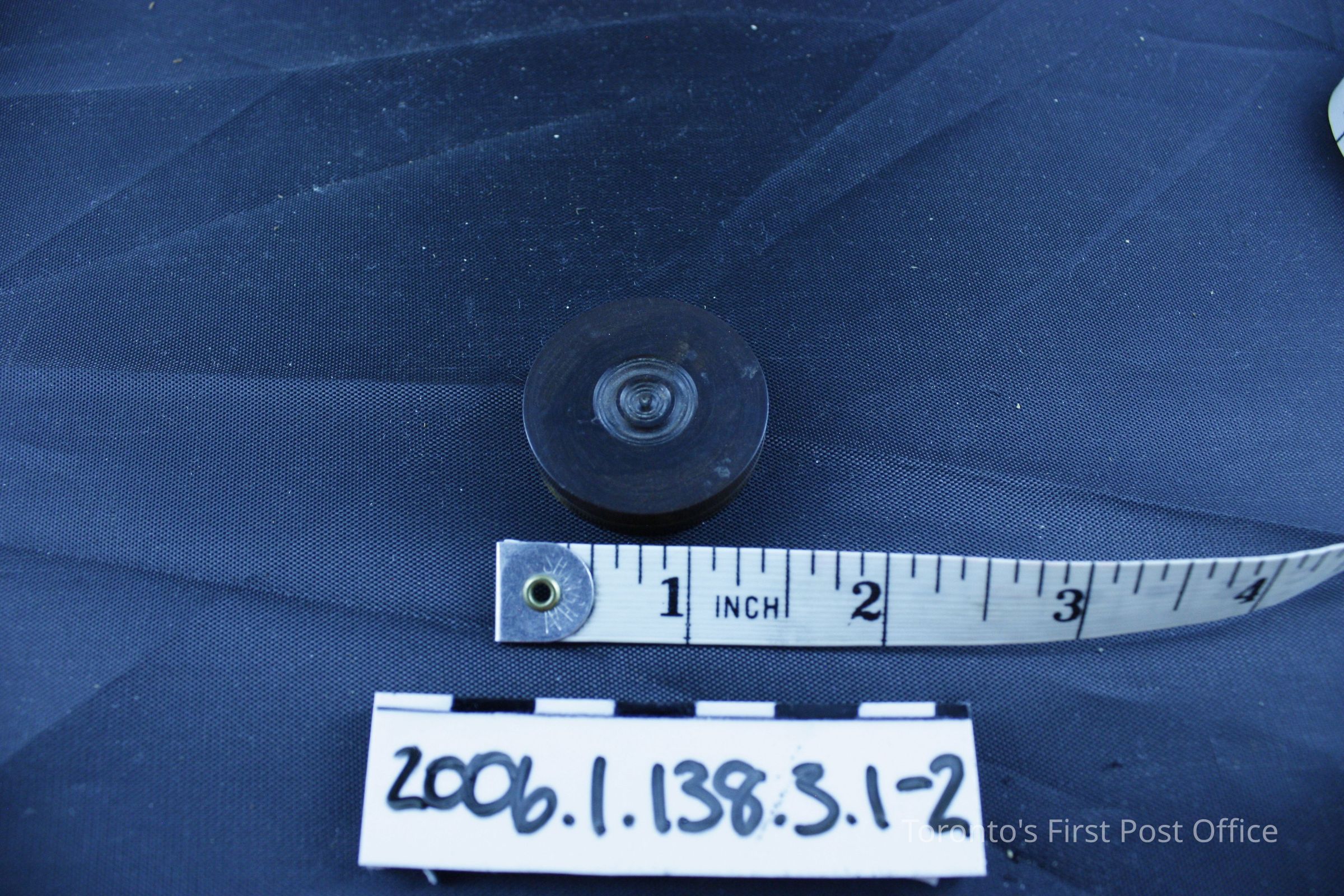 Fifteen sealing wafers in boxes; all boxes are rosewood, round, with screw-off lids; proofs as follows: .1: red wax proof; small, round seal of cherub head and wings over bar; .2: red wax proof; eight-sided seal of crest with stork with spread wings; head couped at neck by crest; tag in lid: "Thos Brown Esq" in brown m/s; .3: red wax proof; small oval seal of rearing dog in profile sinister; .4: red wax proof; eight-sided seal with bar, snake, pointing hand, and motto in banner: "SI DIUS, QUIS CONTRA"; tag with print also in box; .5: red wax proof; circular seal with bee and motto in banner: "VIVE ET VIVAS"; .6: red wax proof; small oval seal with star over gothic "TYR"; .7: red wax proof; small circular seal with motto: "LOYAL AN MORT"; lid interior covered with blue paper; .8: red wax proof with crest; animal over initials over motto; proof on paper; .9: red wax proof with eight-sided seal with overlaid initials: "NHI"; .10: red wax proof; oval seal with shell surrounded by belt with motto "DEPRESSIS PATENS"; .11: red wax proof; small circular seal with mouse; .12: red wax proof; square seal with overlaid initials: "LHD"; paper with these initials in lid; .13: bronze wax proof; oval seal with crest; written on back of paper affixed to seal: "Arms of Mrs. Iansla(?) related to John Maytons(?)"; green paper on base of box interior; .14: red wax proof; diamond seal with shield surmounted by crown; surrounded by "MR"; on white paper; .15: red wax proof; small circular seal with shield surmounted by cherub and wings; over motto "TOUT JOUR PRET".Dimensions