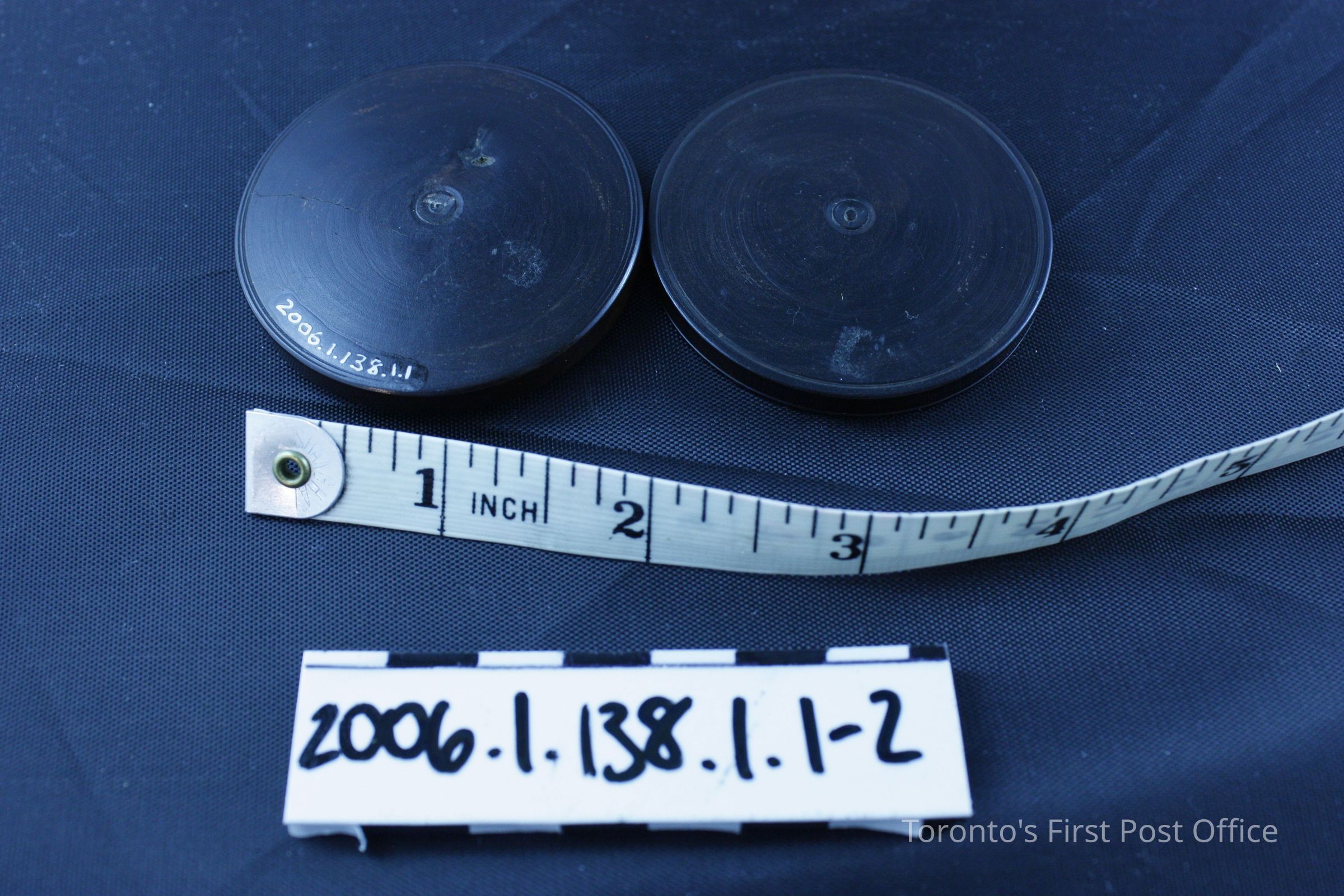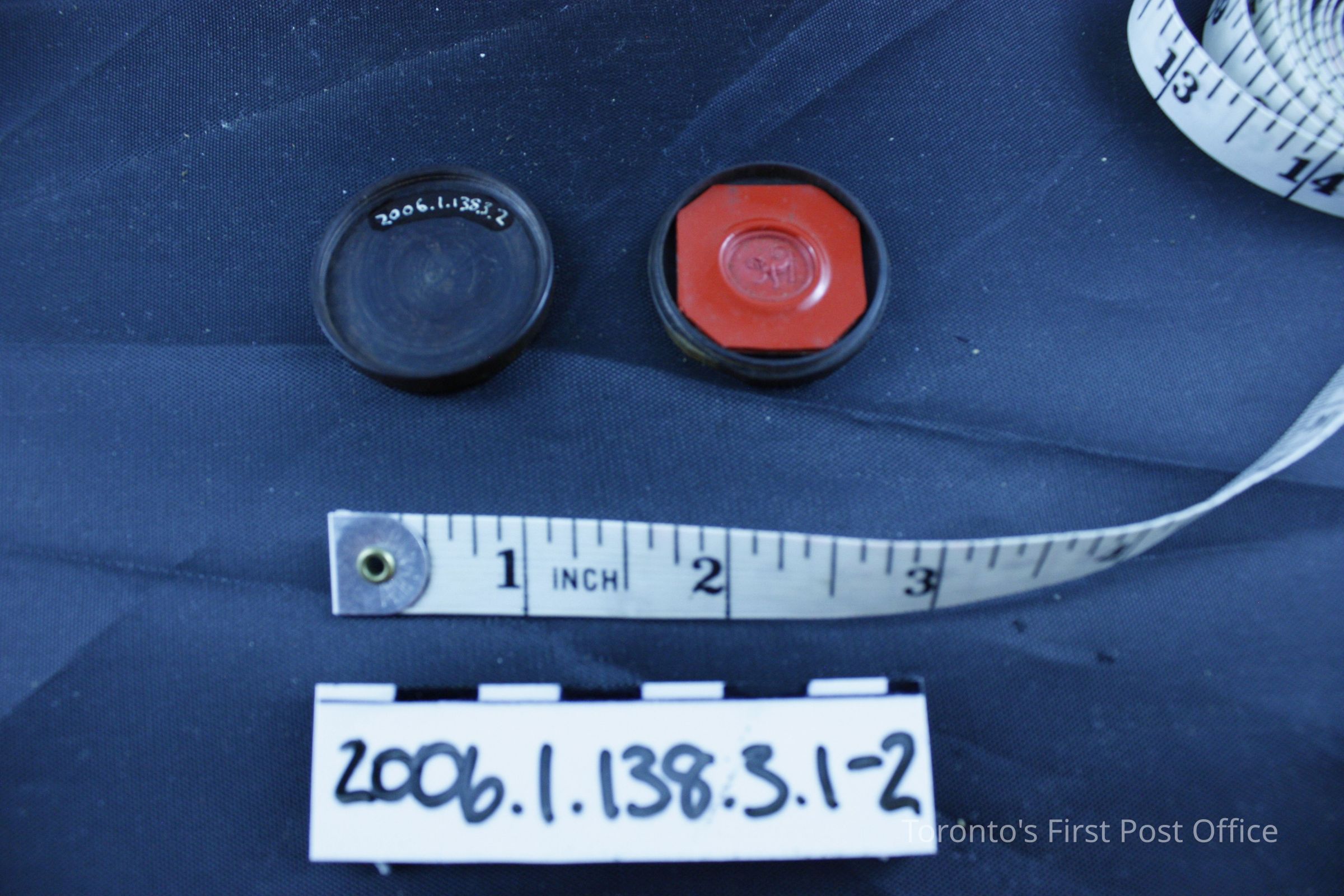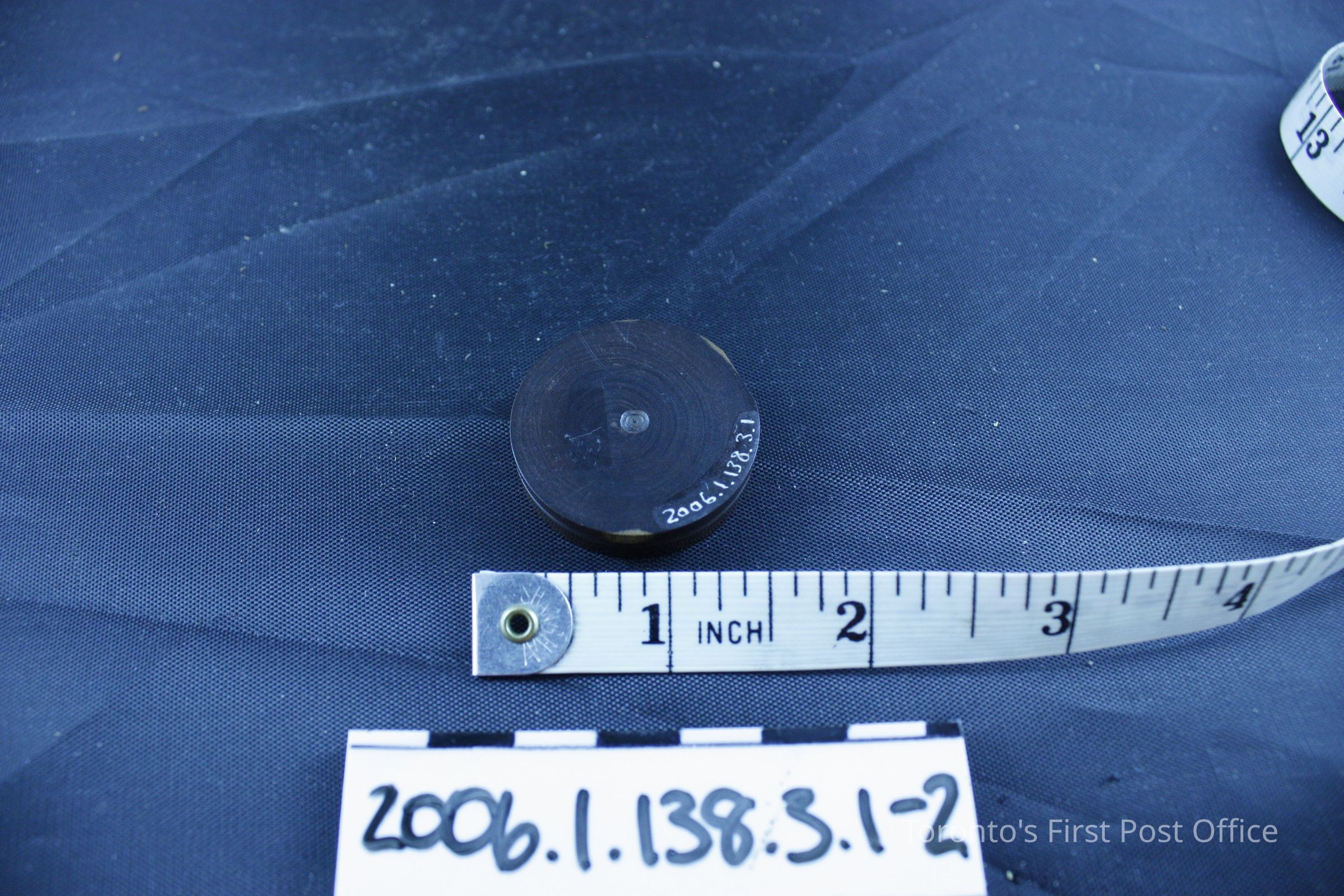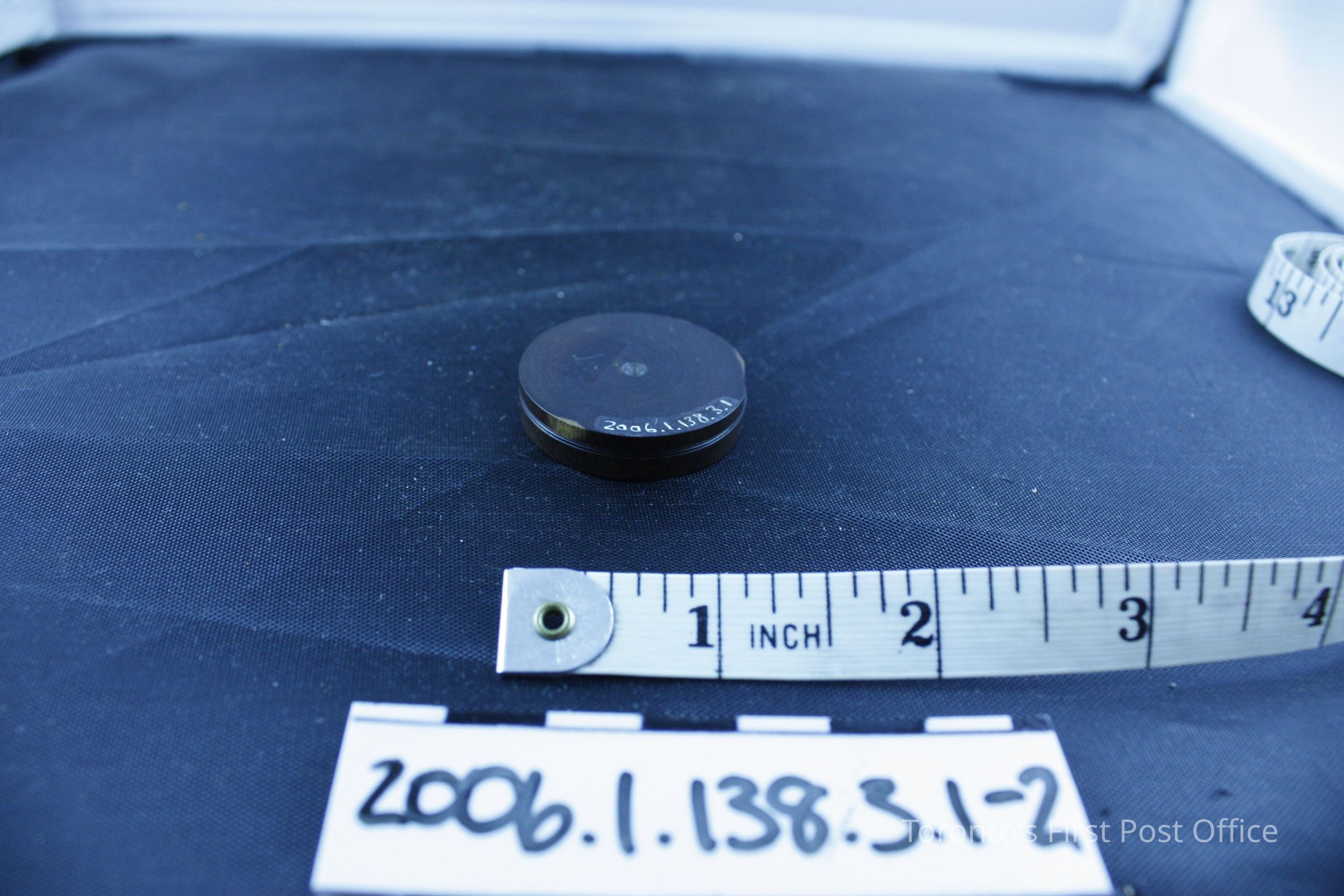 Fifteen sealing wafers in boxes; all boxes are rosewood, round, with screw-off lids; proofs as follows: .1: red wax proof; small, round seal of cherub head and wings over bar; .2: red wax proof; eight-sided seal of crest with stork with spread wings; head couped at neck by crest; tag in lid: "Thos Brown Esq" in brown m/s; .3: red wax proof; small oval seal of rearing dog in profile sinister; .4: red wax proof; eight-sided seal with bar, snake, pointing hand, and motto in banner: "SI DIUS, QUIS CONTRA"; tag with print also in box; .5: red wax proof; circular seal with bee and motto in banner: "VIVE ET VIVAS"; .6: red wax proof; small oval seal with star over gothic "TYR"; .7: red wax proof; small circular seal with motto: "LOYAL AN MORT"; lid interior covered with blue paper; .8: red wax proof with crest; animal over initials over motto; proof on paper; .9: red wax proof with eight-sided seal with overlaid initials: "NHI"; .10: red wax proof; oval seal with shell surrounded by belt with motto "DEPRESSIS PATENS"; .11: red wax proof; small circular seal with mouse; .12: red wax proof; square seal with overlaid initials: "LHD"; paper with these initials in lid; .13: bronze wax proof; oval seal with crest; written on back of paper affixed to seal: "Arms of Mrs. Iansla(?) related to John Maytons(?)"; green paper on base of box interior; .14: red wax proof; diamond seal with shield surmounted by crown; surrounded by "MR"; on white paper; .15: red wax proof; small circular seal with shield surmounted by cherub and wings; over motto "TOUT JOUR PRET".Dimensions
