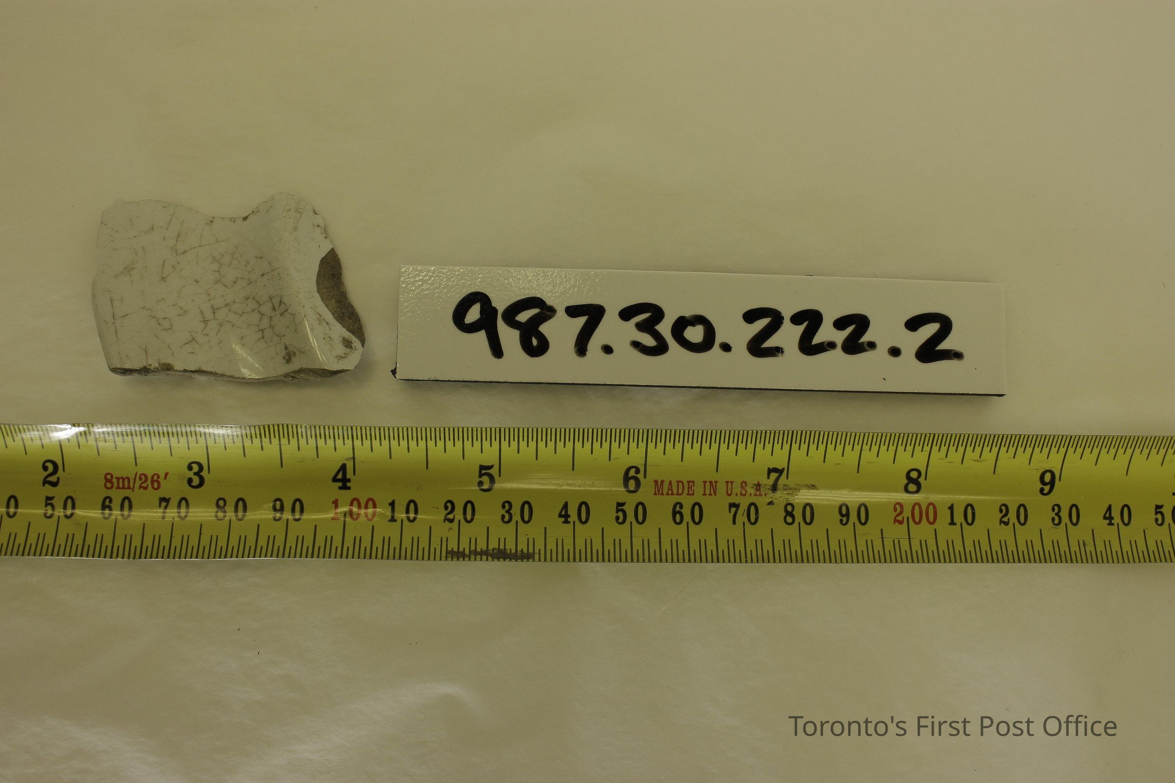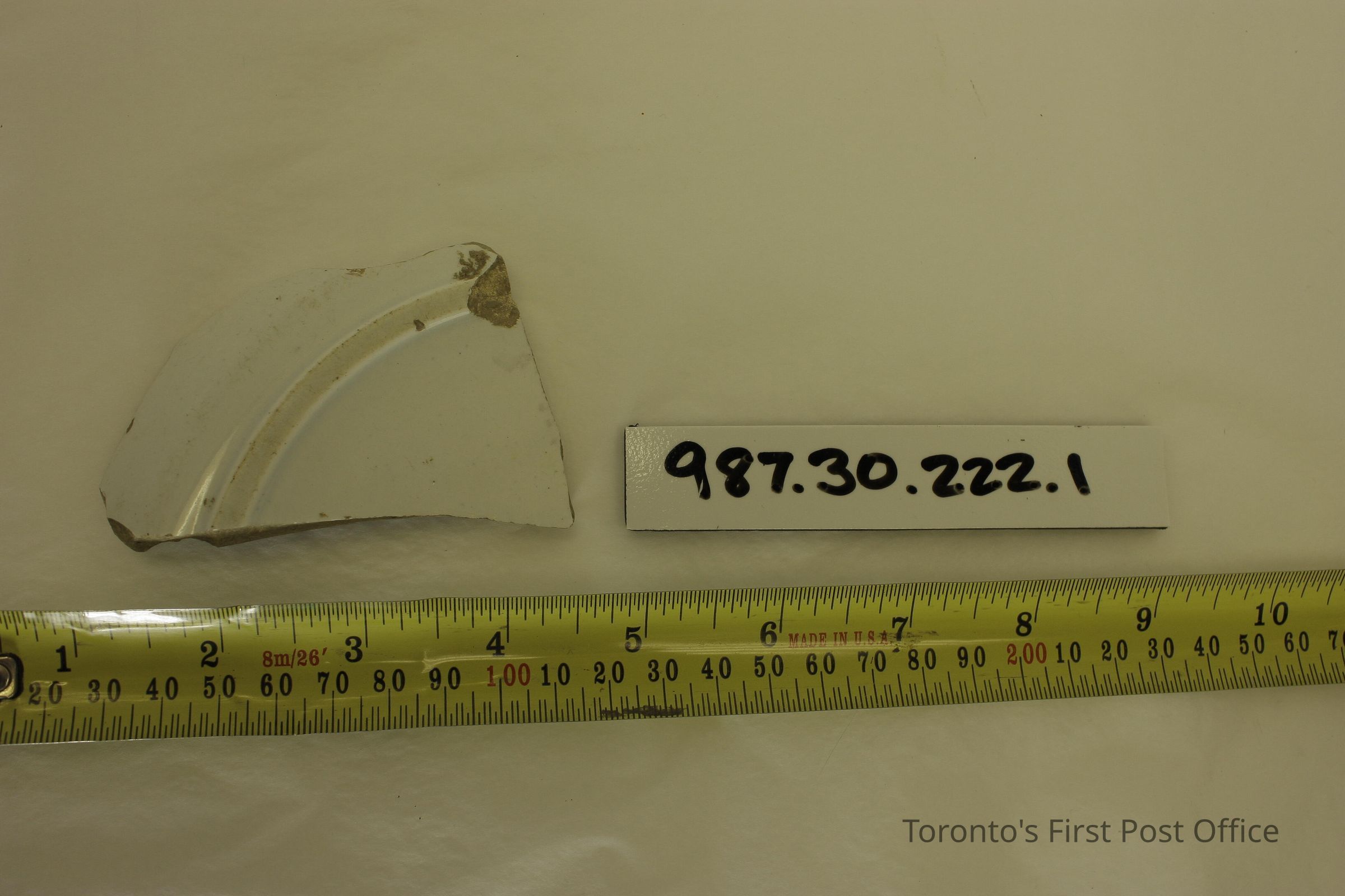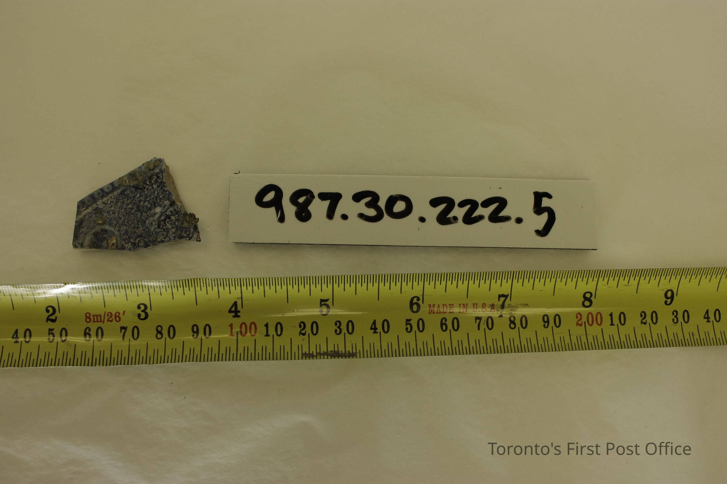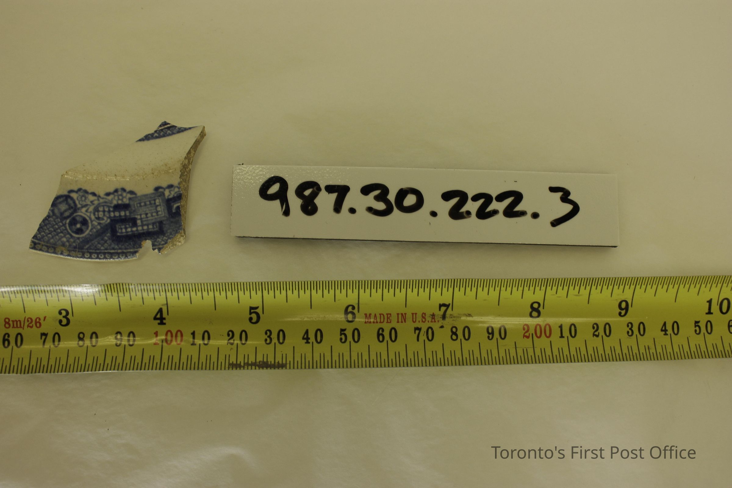 Five shards of pottery; irregularly shaped; blue willow design in one large shard; white and blue glaze; excavated beside north-west corner of Cumberland addition.Dimensions