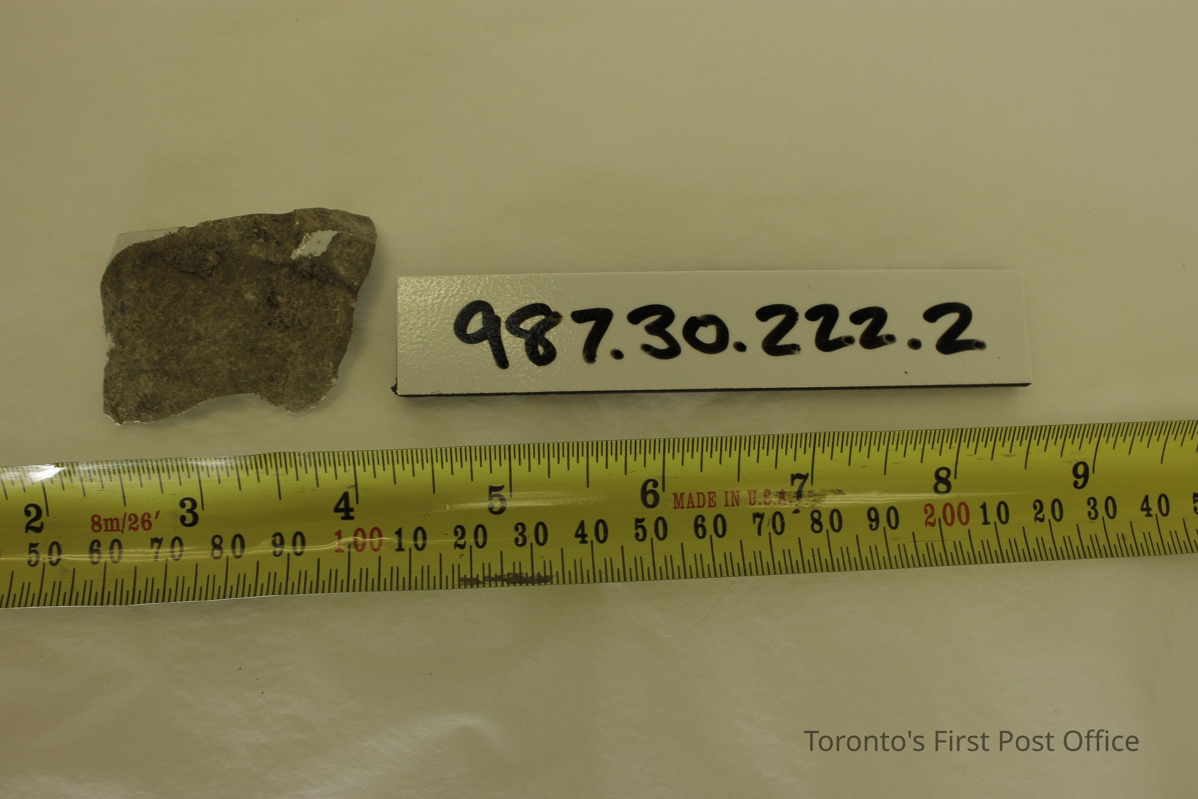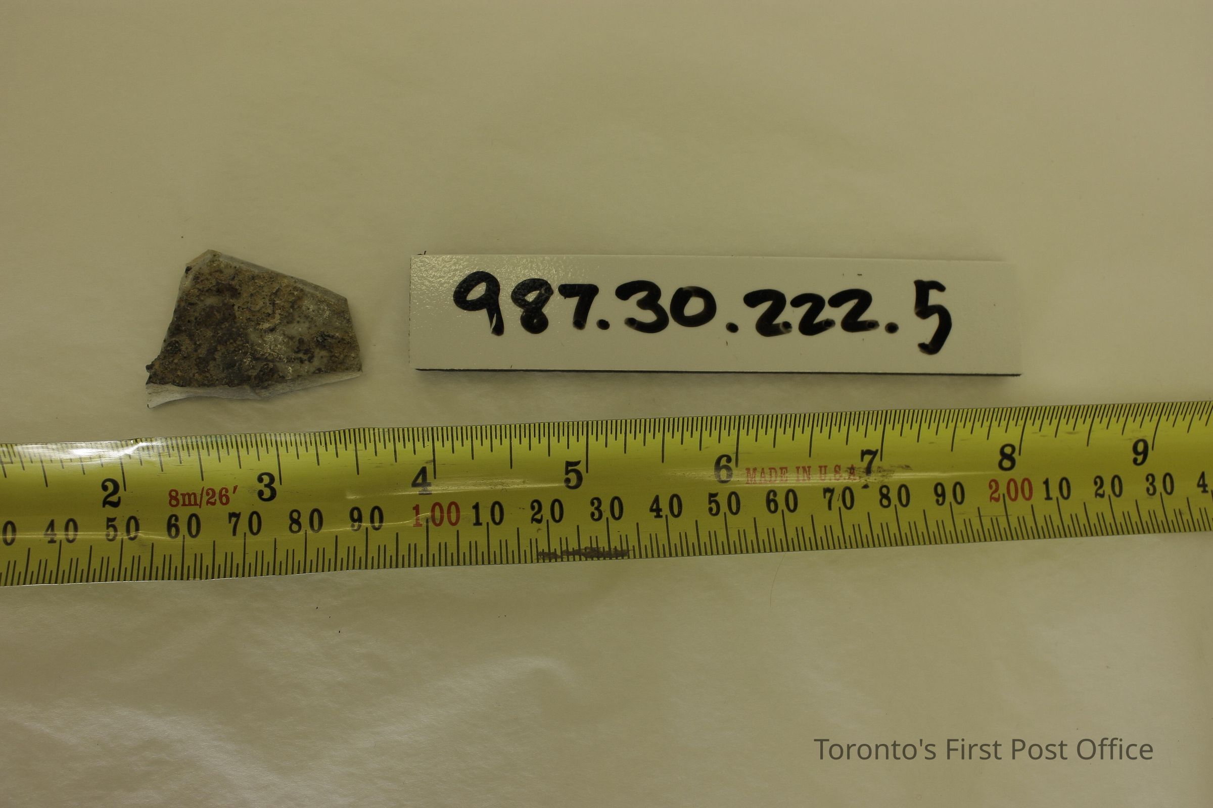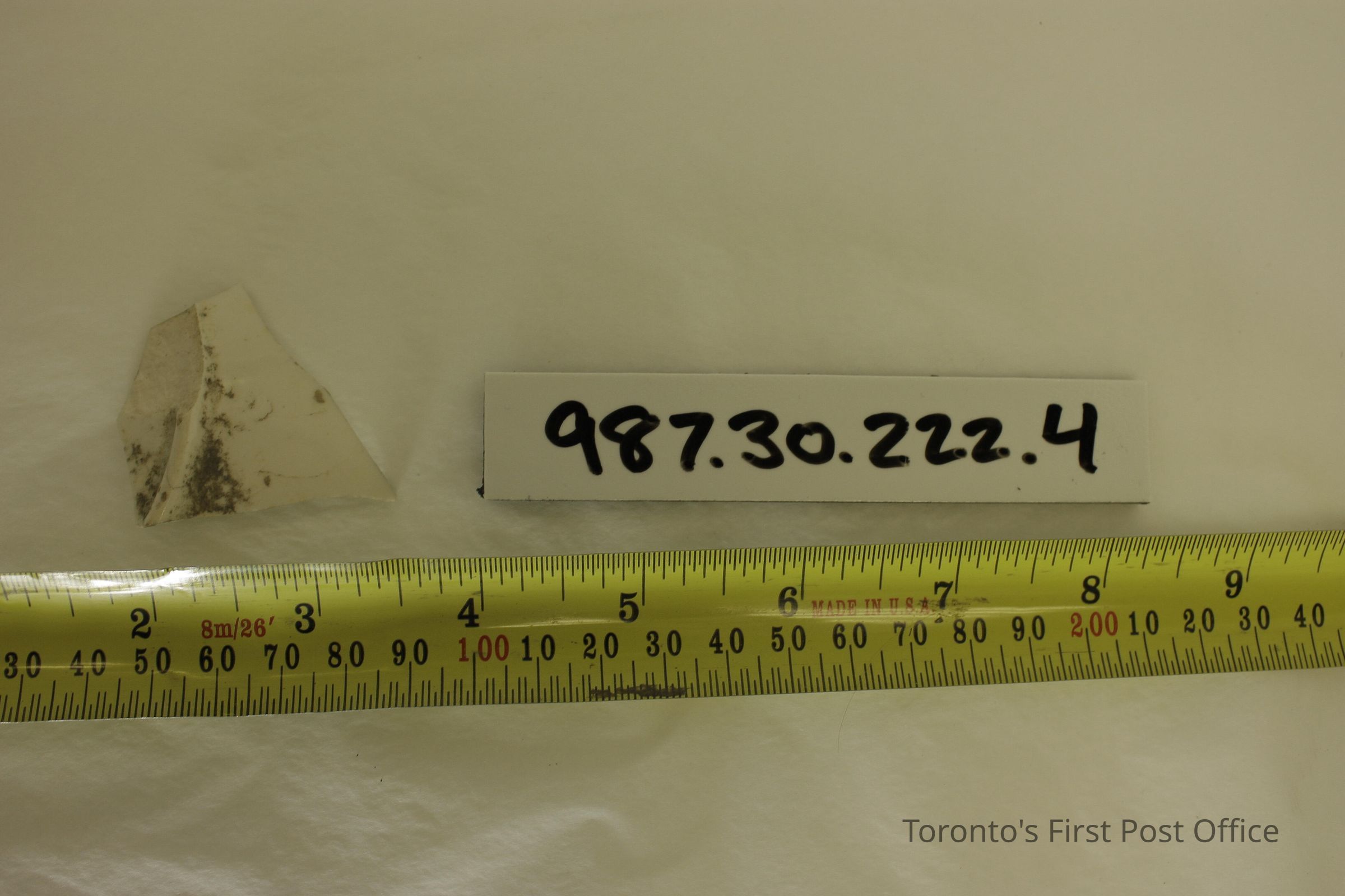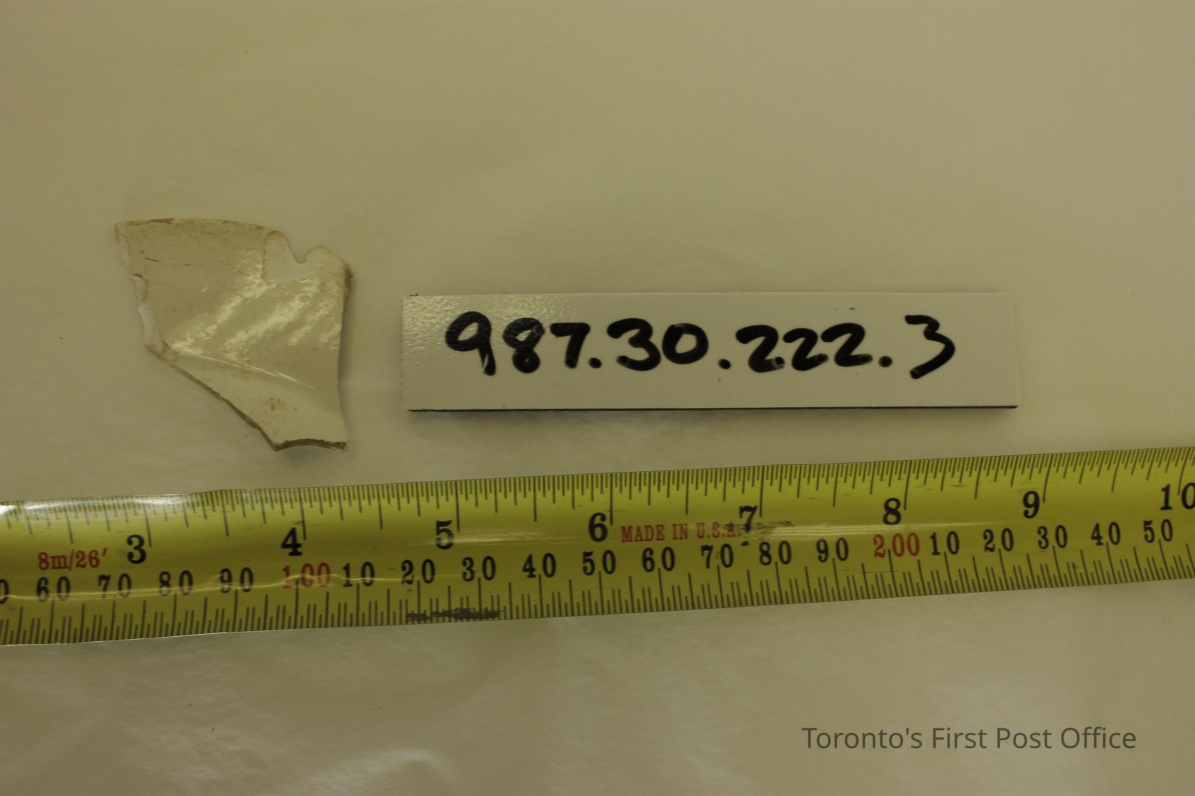 Five shards of pottery; irregularly shaped; blue willow design in one large shard; white and blue glaze; excavated beside north-west corner of Cumberland addition.Dimensions