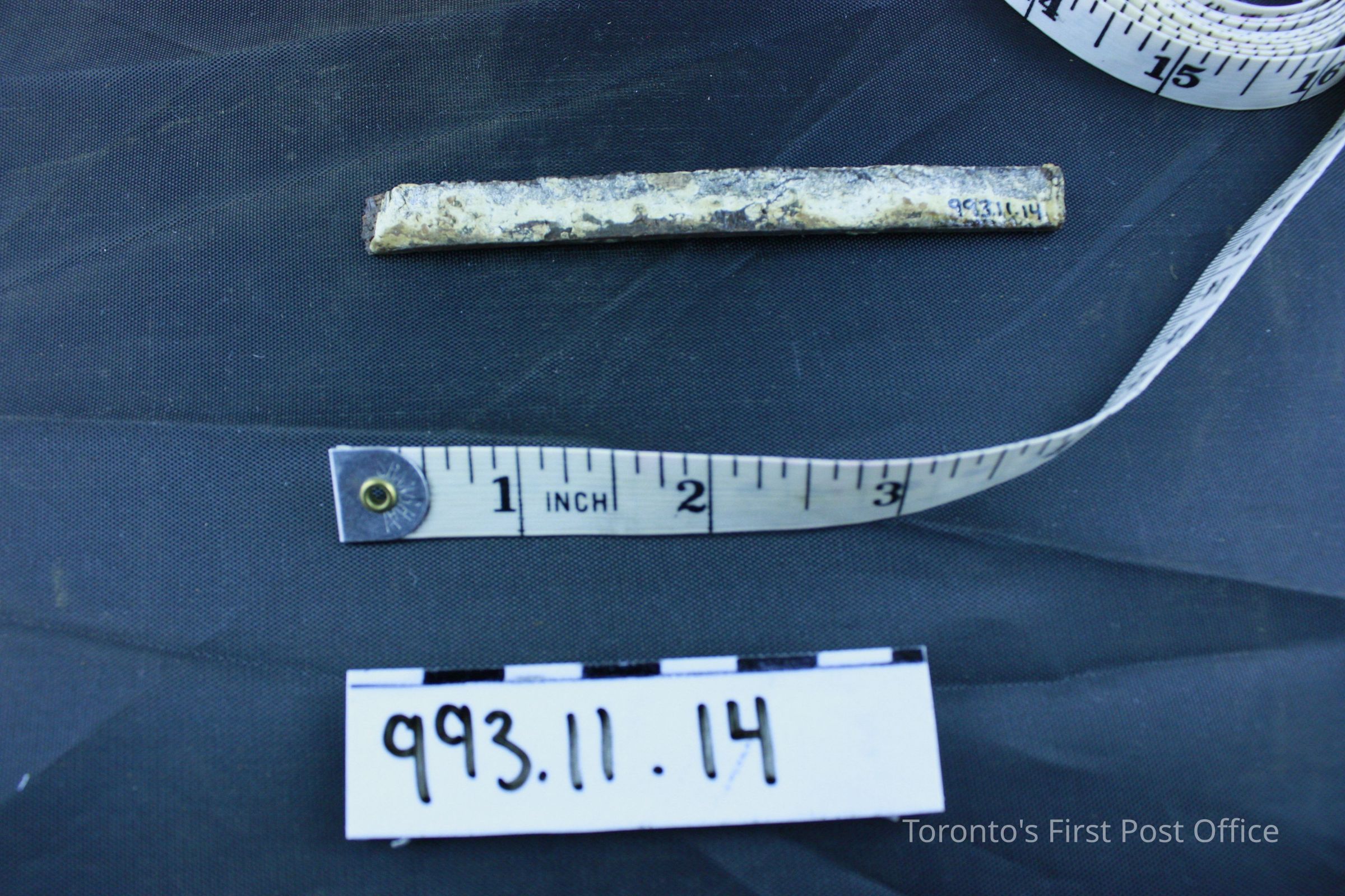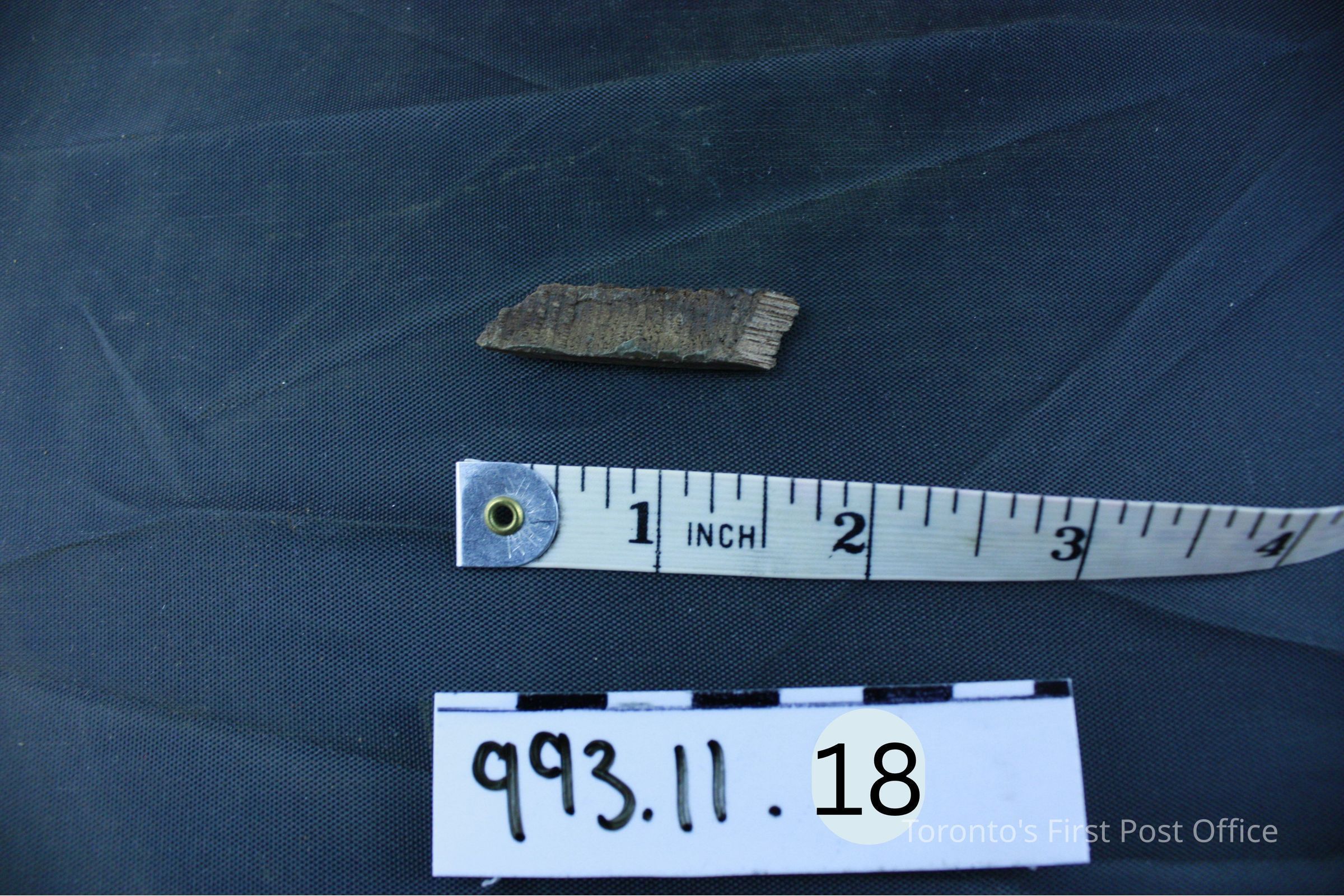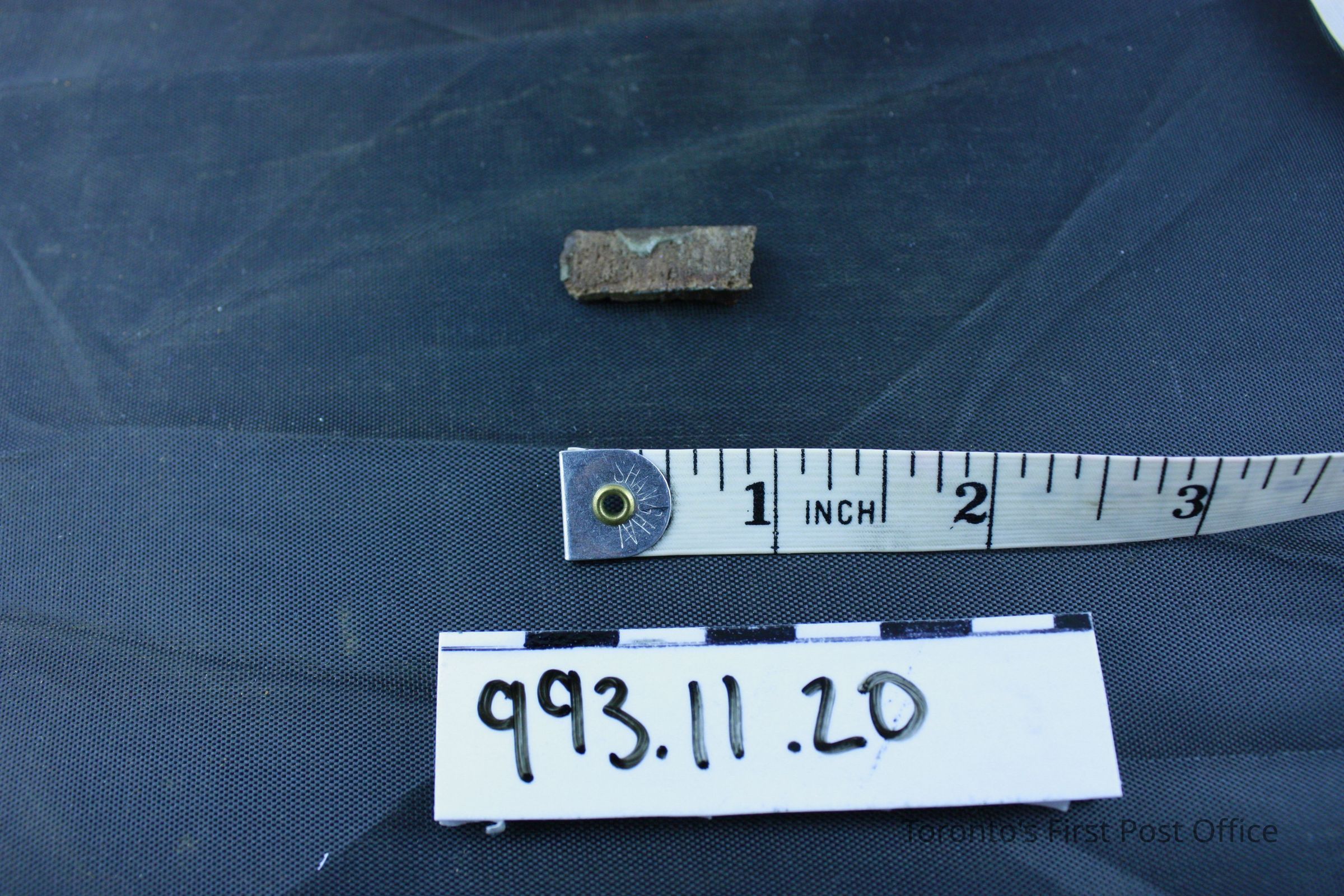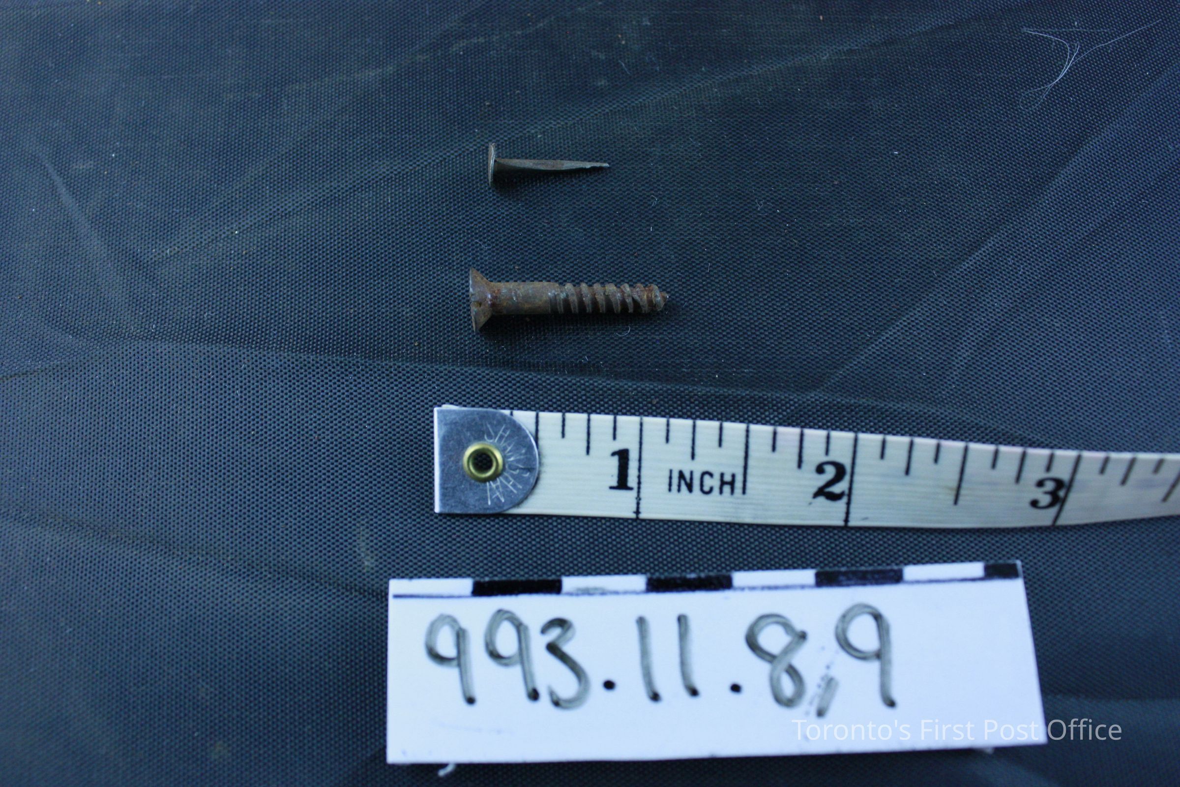 Twenty assorted pieces such as tack, nail, part of metal lock, wood, glass; "found in desk".