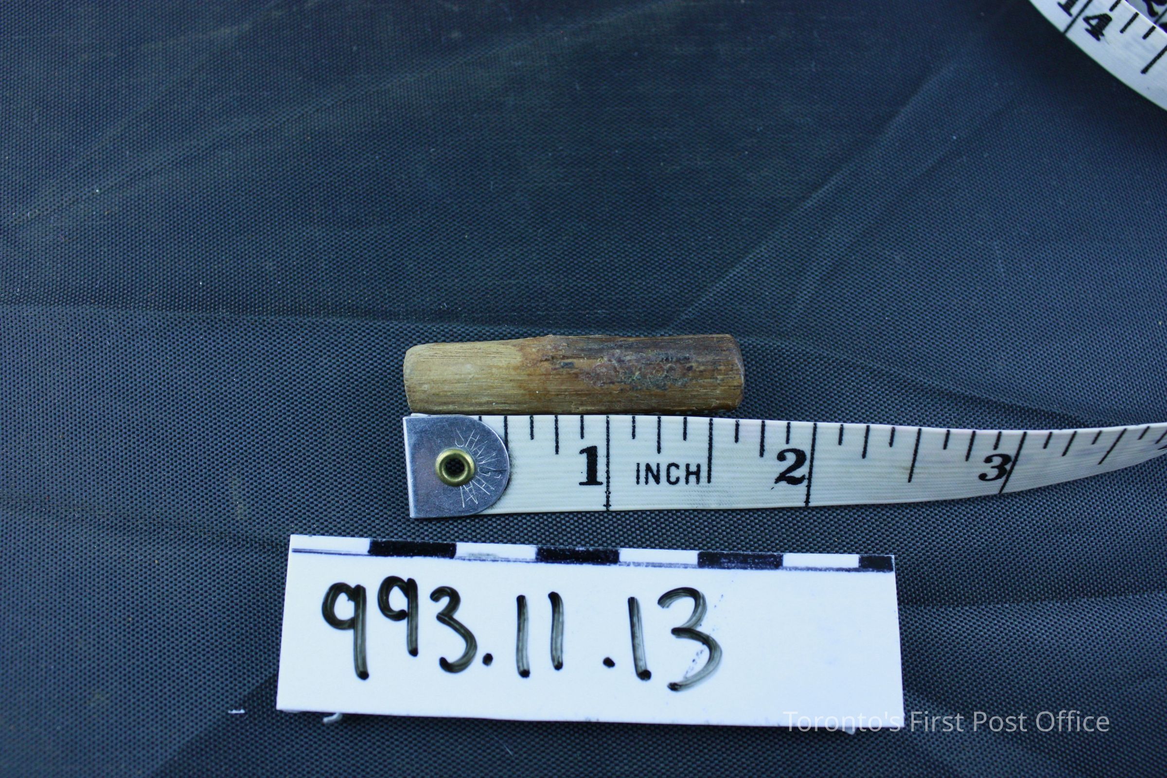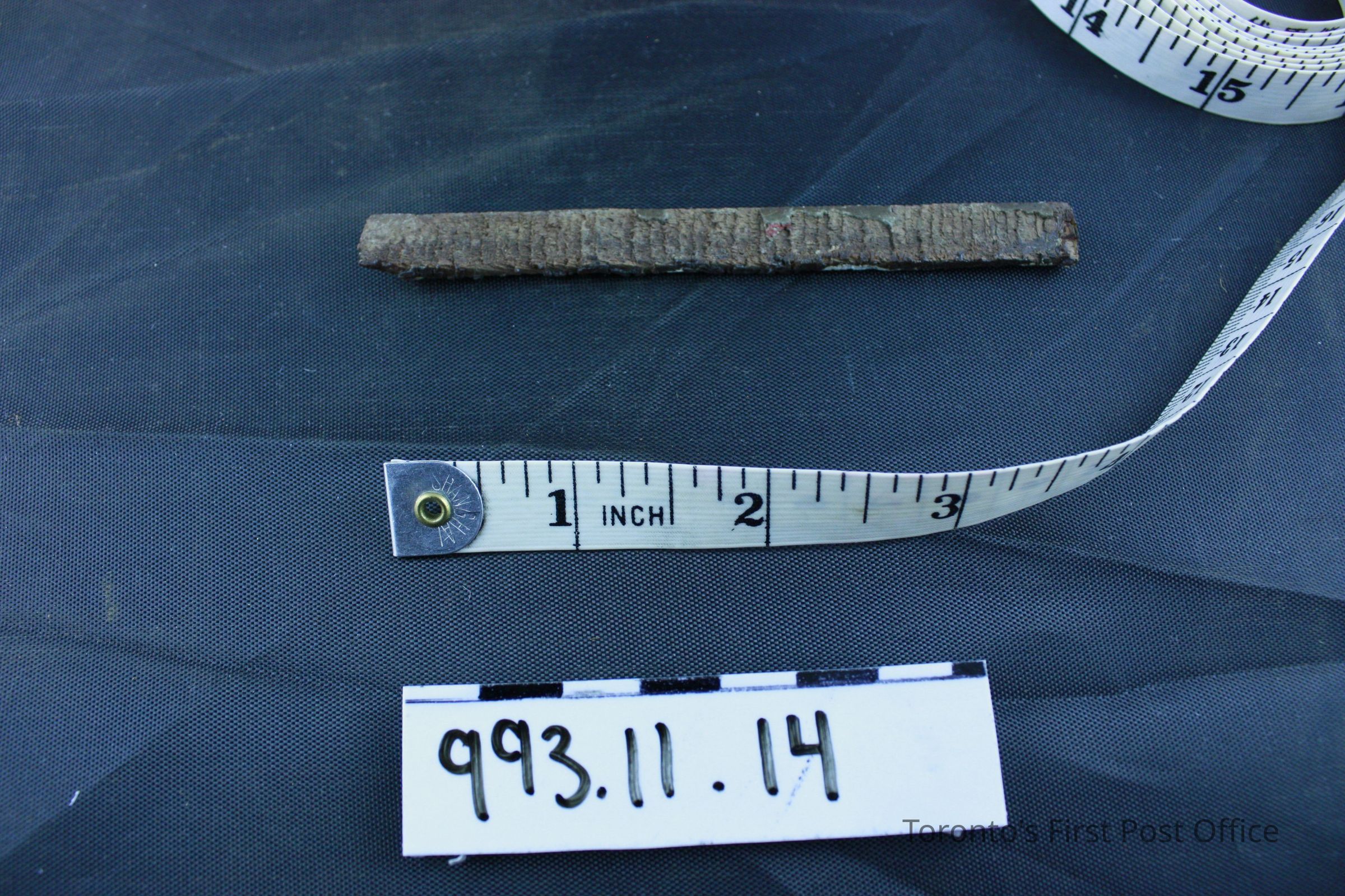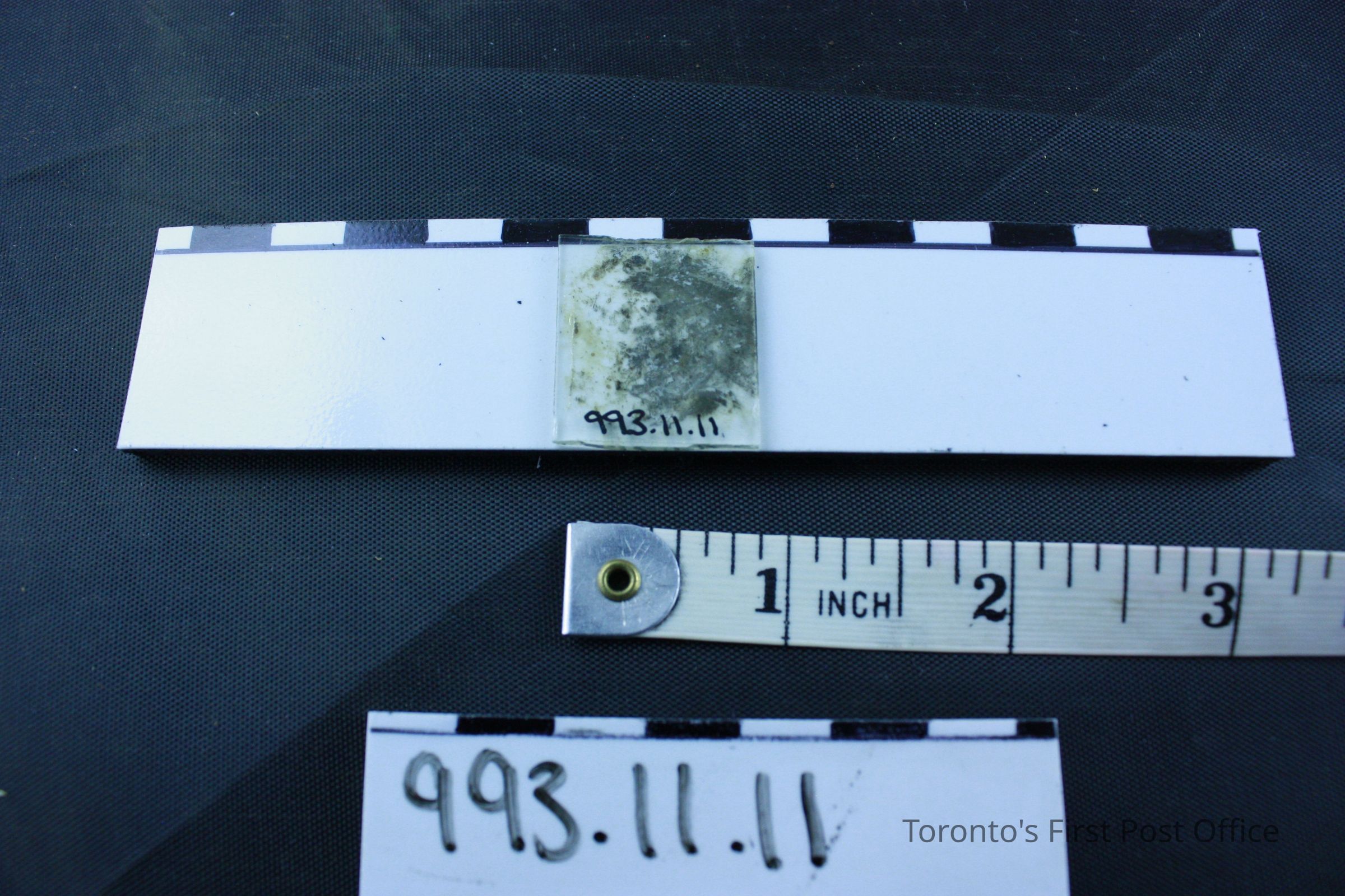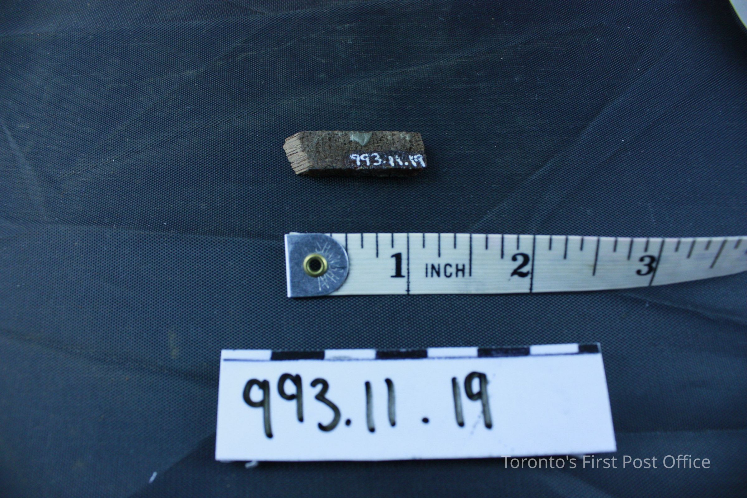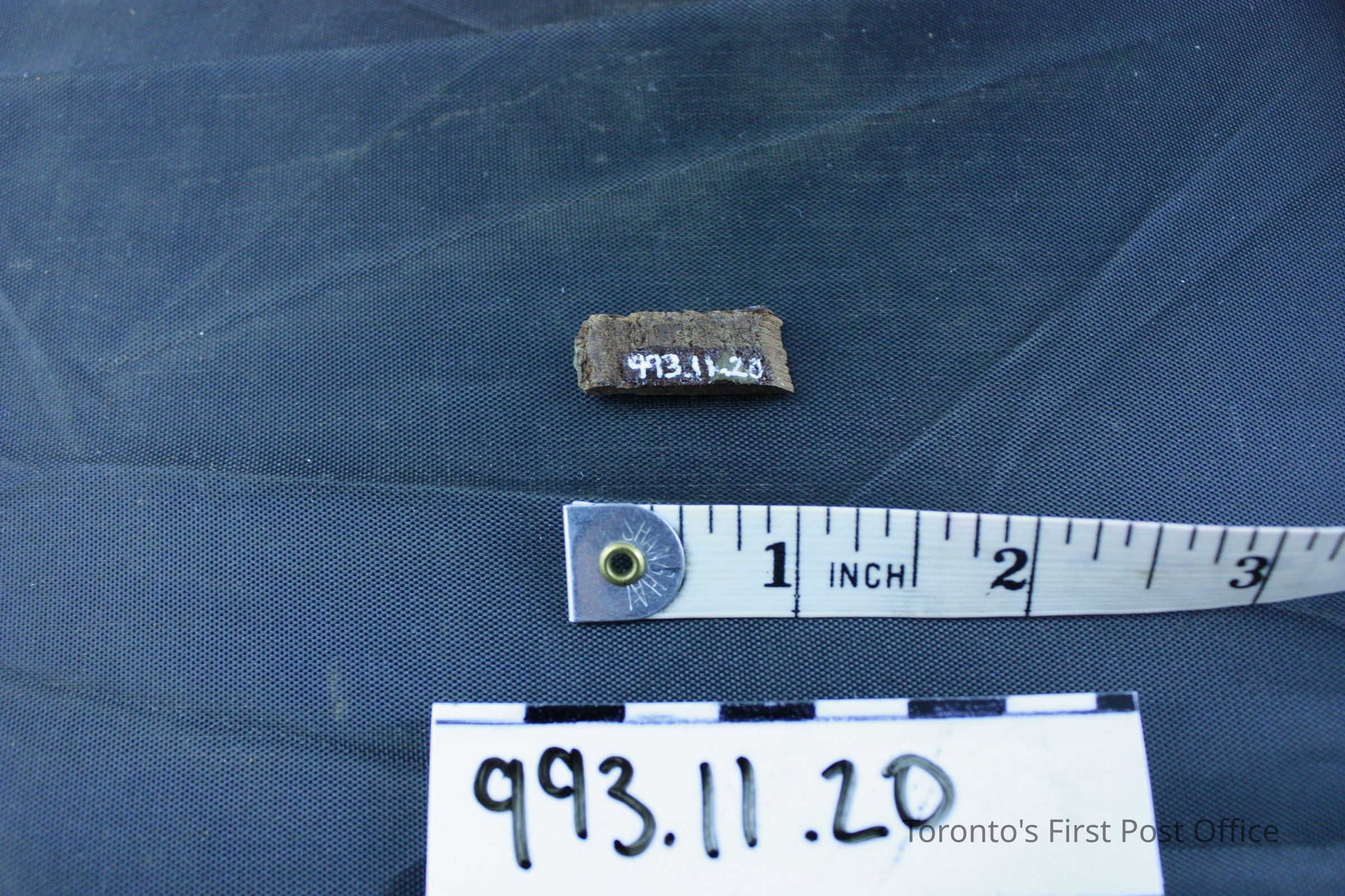 Twenty assorted pieces such as tack, nail, part of metal lock, wood, glass; "found in desk".