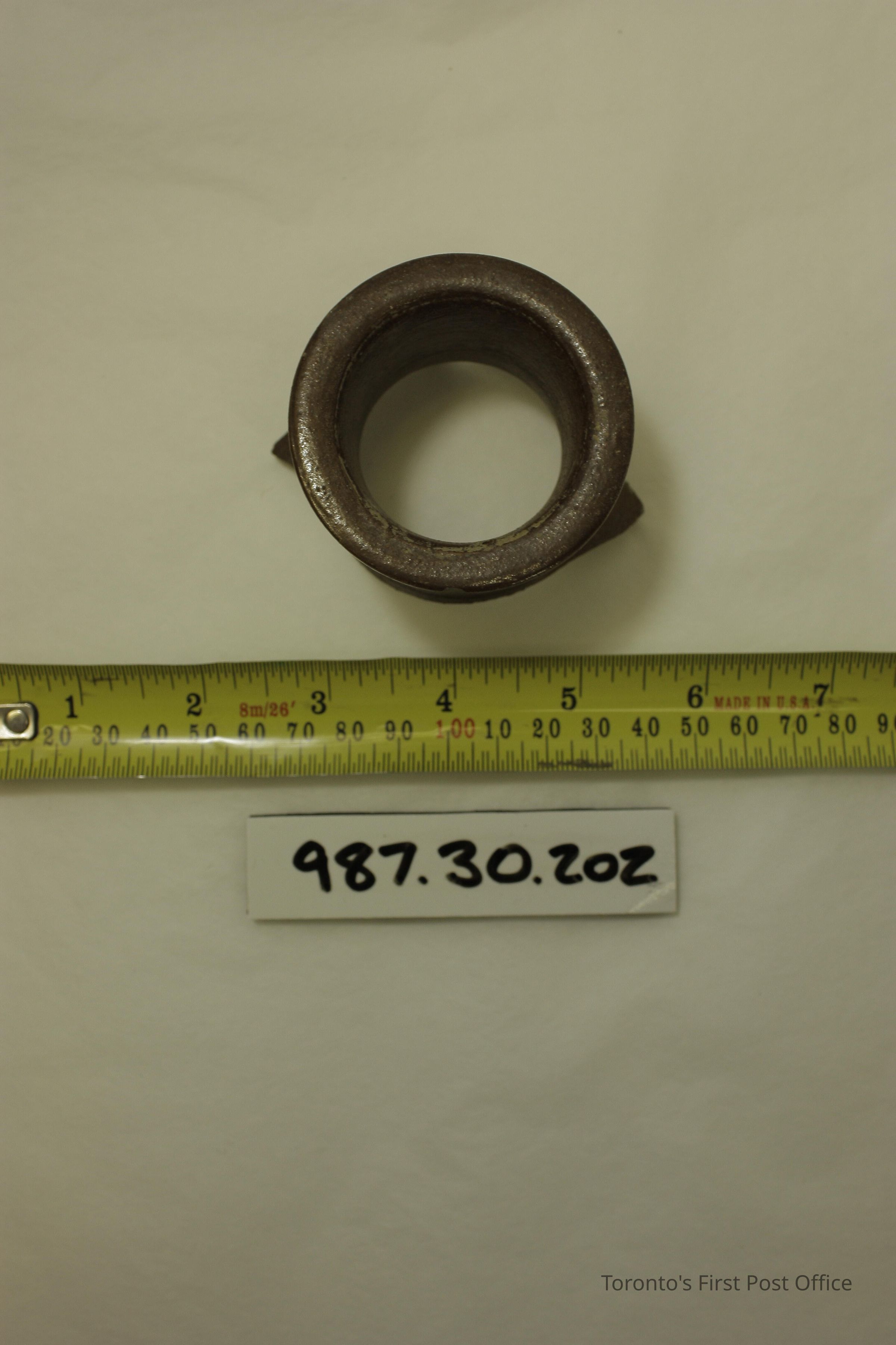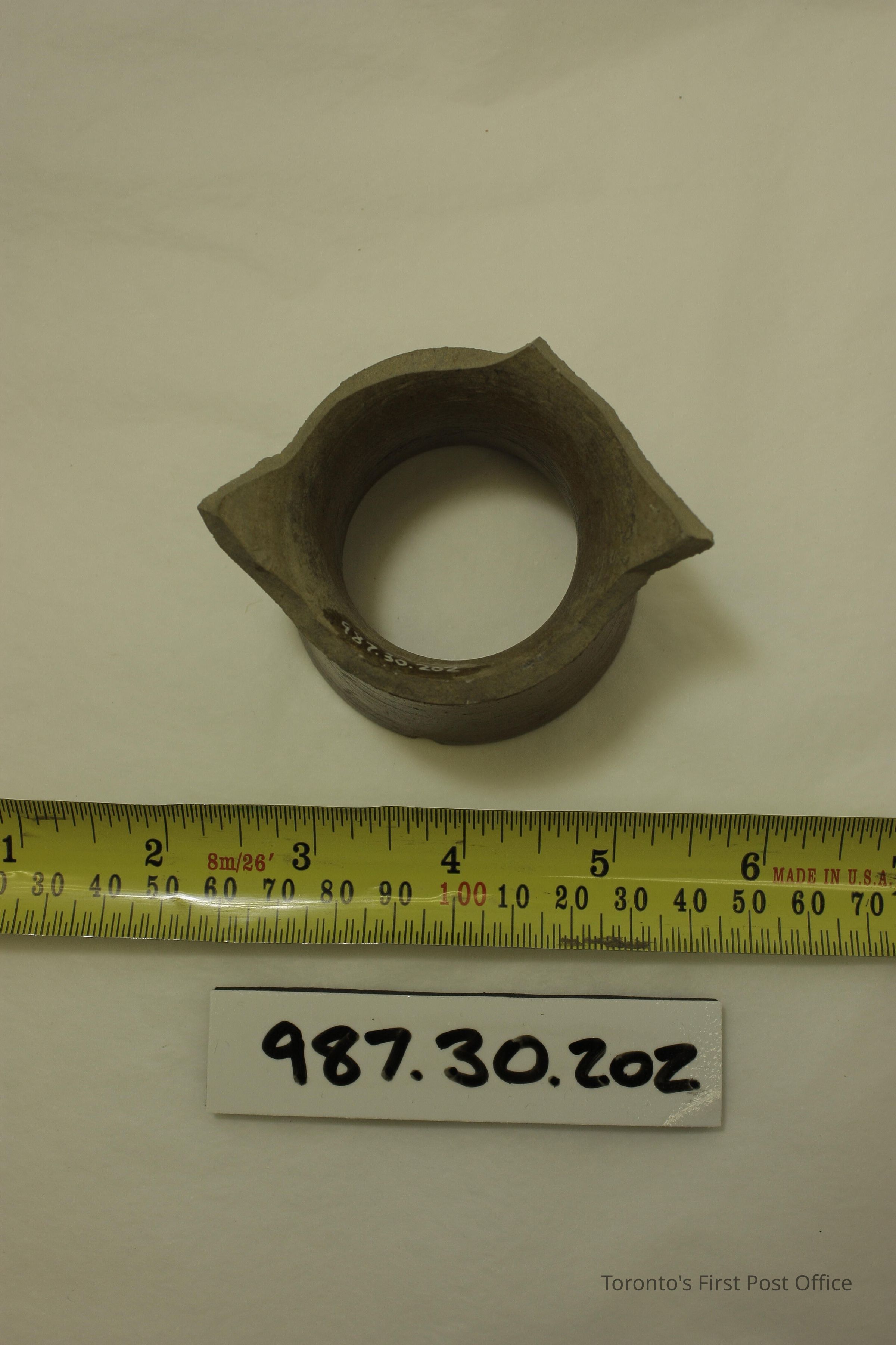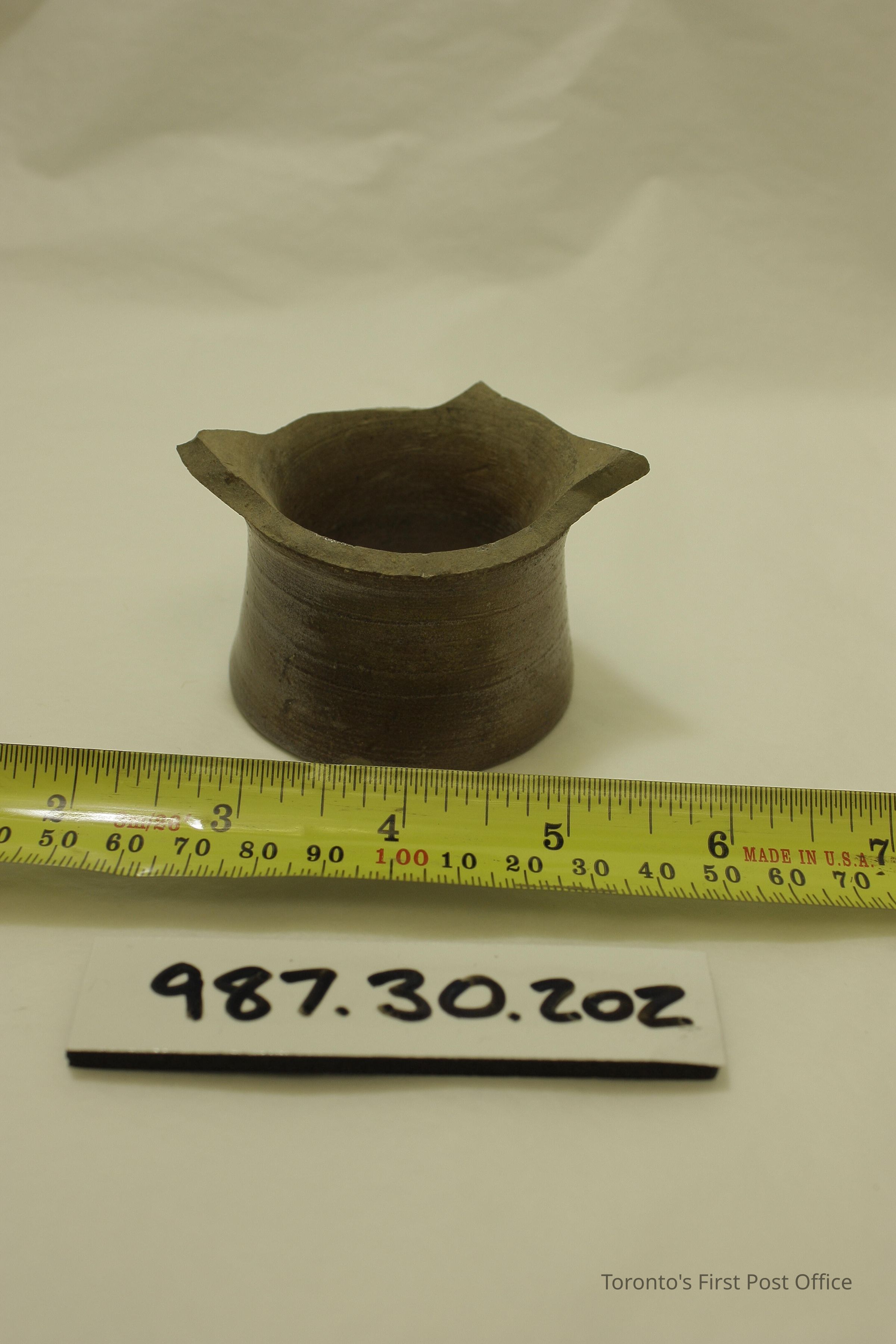 Pottery shard; brown glazed clay; inkwell neck and part of body; circa 1835; excavated from Christian Brothers/De La Salle Institute/Toronto Separate School Board about 1980.Update Date
