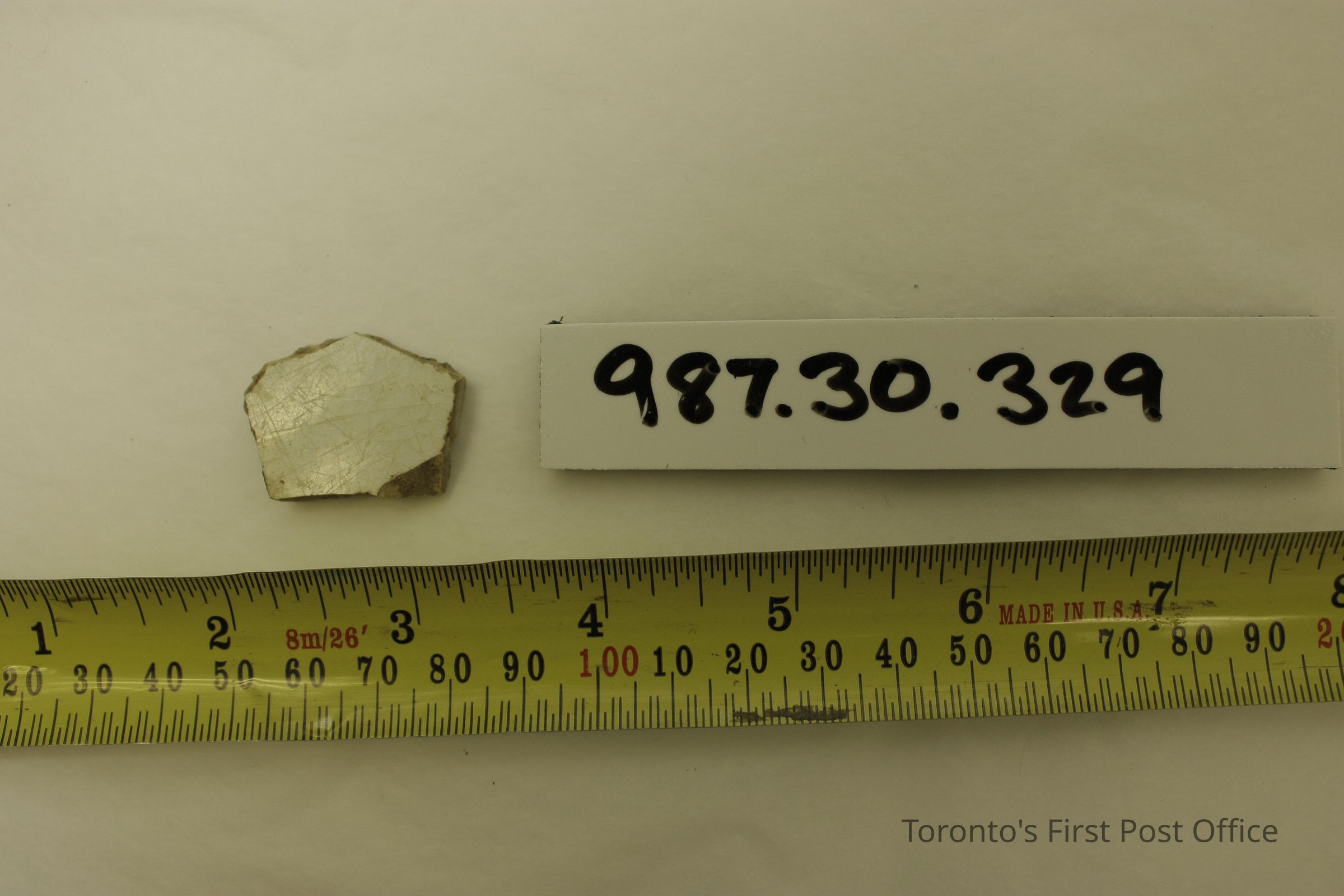 Pottery shard; white high gloss glaze; irregularly shaped; found while excavating East side of Post Office in 1981.Dimensions