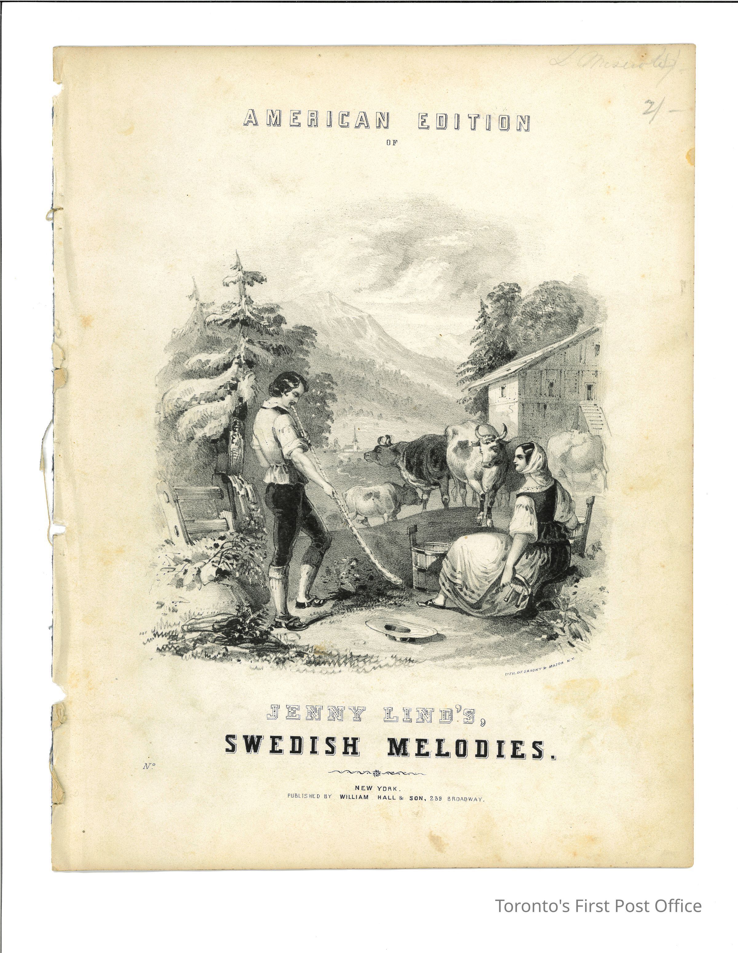Sheet music; titled "AMERICAN EDITION OF JENNY LIND'S SWEDISH MELODIES."; New York: William & Son, 239 Broadway; image on cover of milk maid, cows, man with a horn, wide-brimmed at on ground; background of barn and mountains; song is titled "THE SONG OF SUMMER. (OM SOMMAREN); 4 pp.; pencil signature and "2/-" on top right corner of cover; string-bound.Dimensions