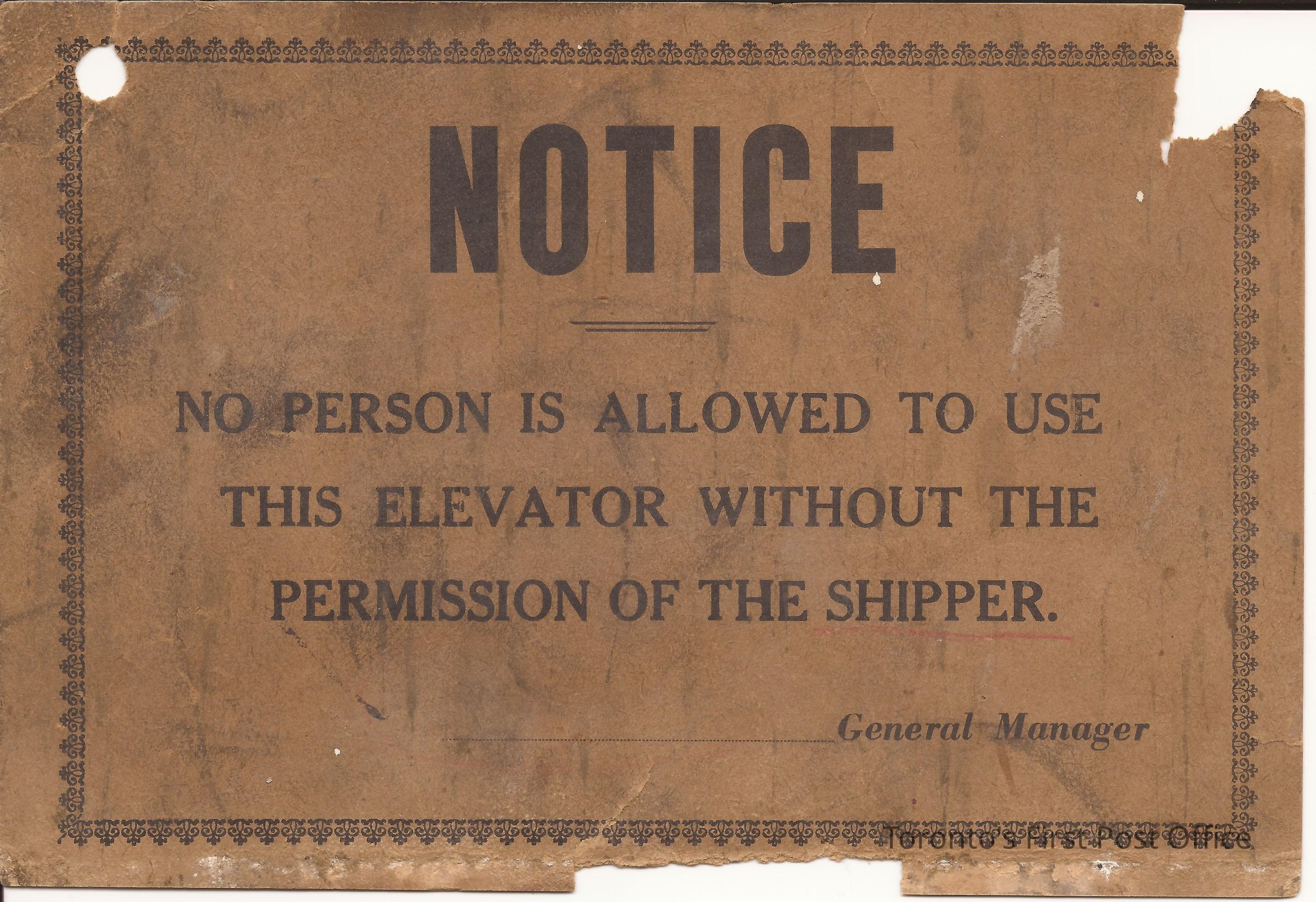 Paper notice; sand-coloured paper with black ink; reads: "NOTICE NO PERSON IS ALLOWED TO USE THIS ELEVATOR WITHOUT THE PERMISSION OF THE SHIPPER… GENERAL MANAGER"; posted on the second floor of the Cumberland addition.Update Date