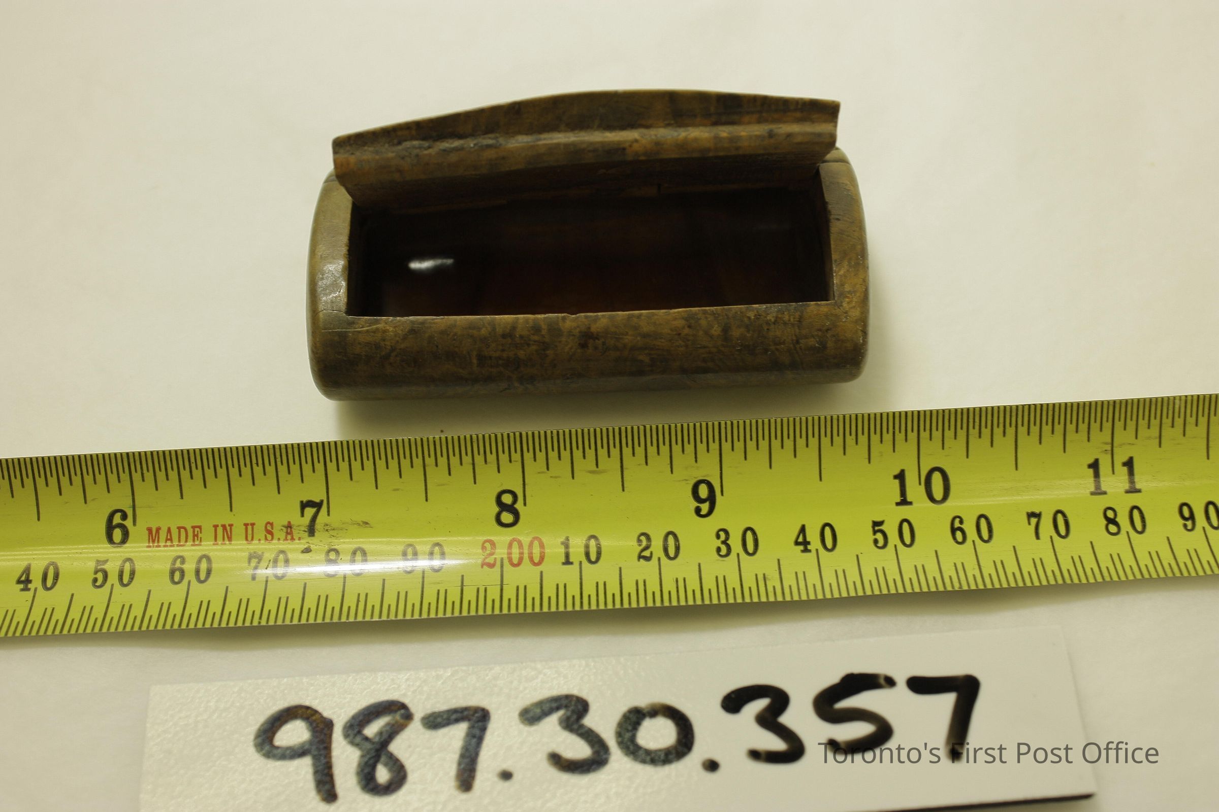 Snuff box; burled walnut; rectangular with rounded corners and rounded top and bottom; yellow and brown wood; black inset on lid; cover slightly raised at opening; circa 1820.Dimensions