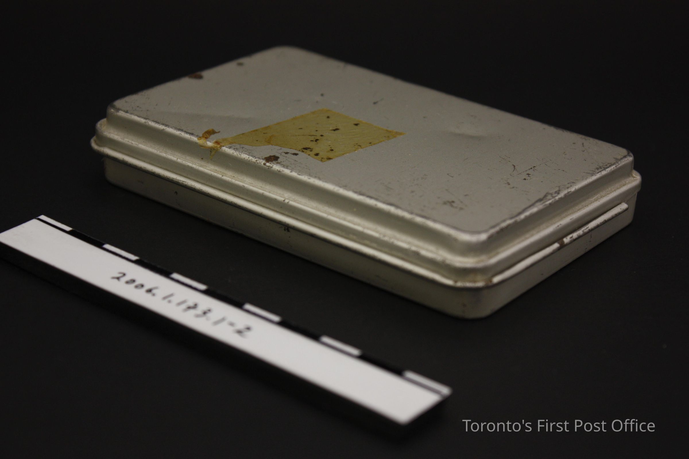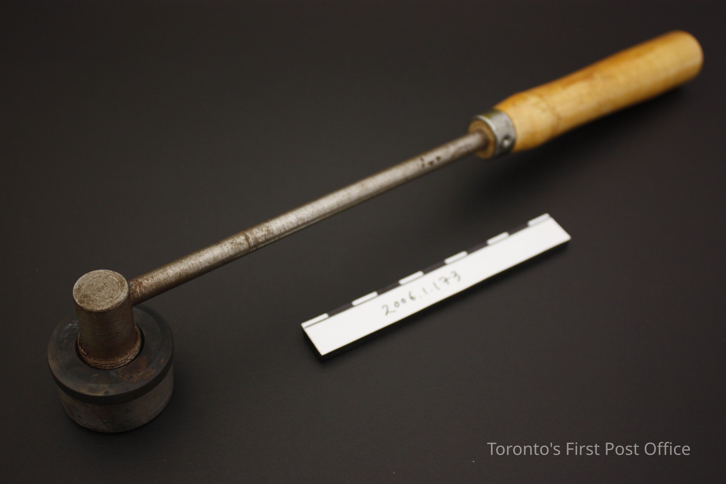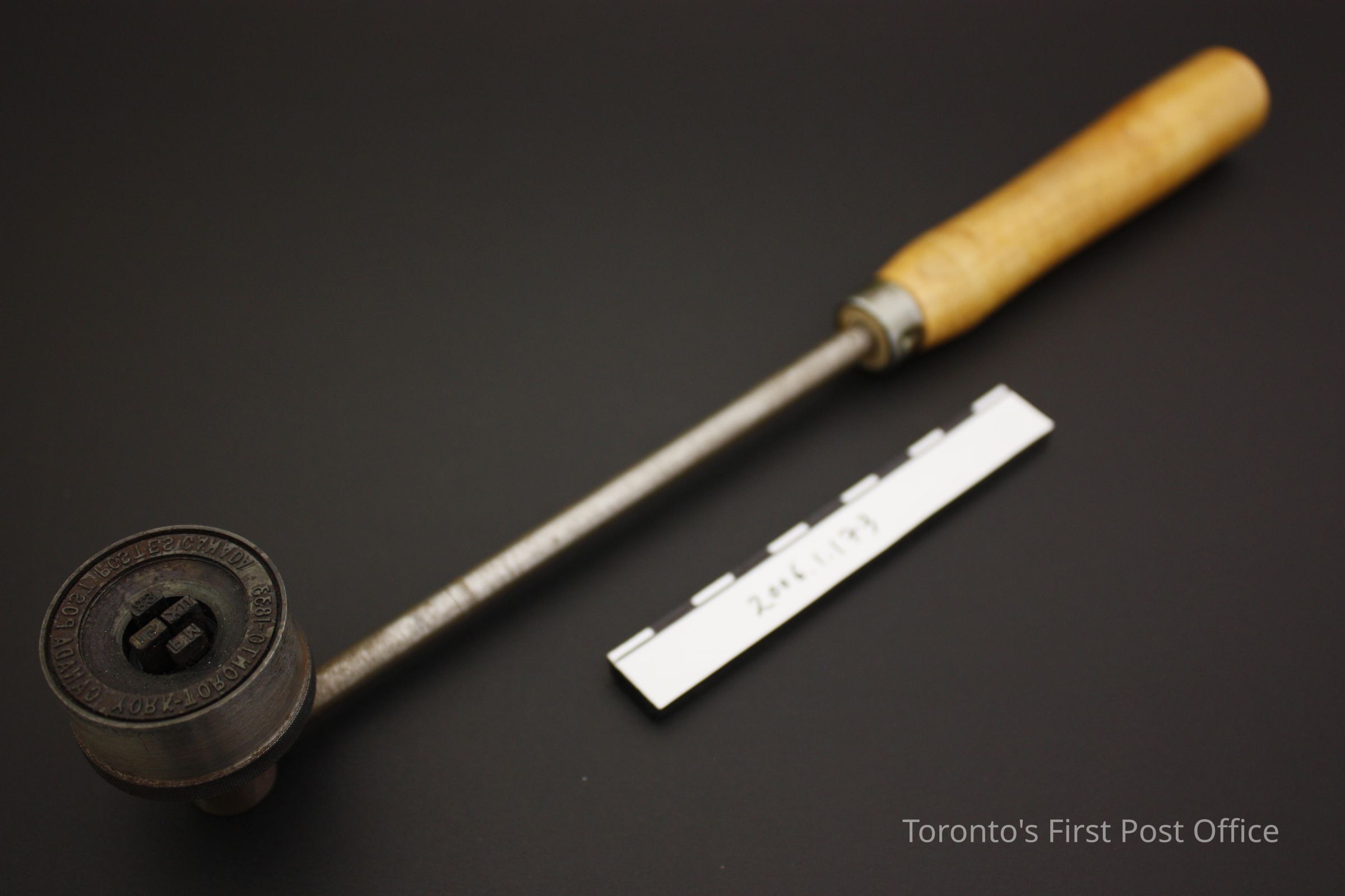 .1: Cancellation hammer with wooden handle; steel arm; screw-on steel marker: "YORK-TORONTO-1833 CANADA POST POSTES CANADA PM 15 XII 83"; circular marker; .2.1: tin box with hinged lid; contains: .2.2: unfinished wooden holder with forty-eight holes to hold type; and 3.1-44: steel type; roman numerals, "AM", and numbers for .1; circa 1984.Dimensions
