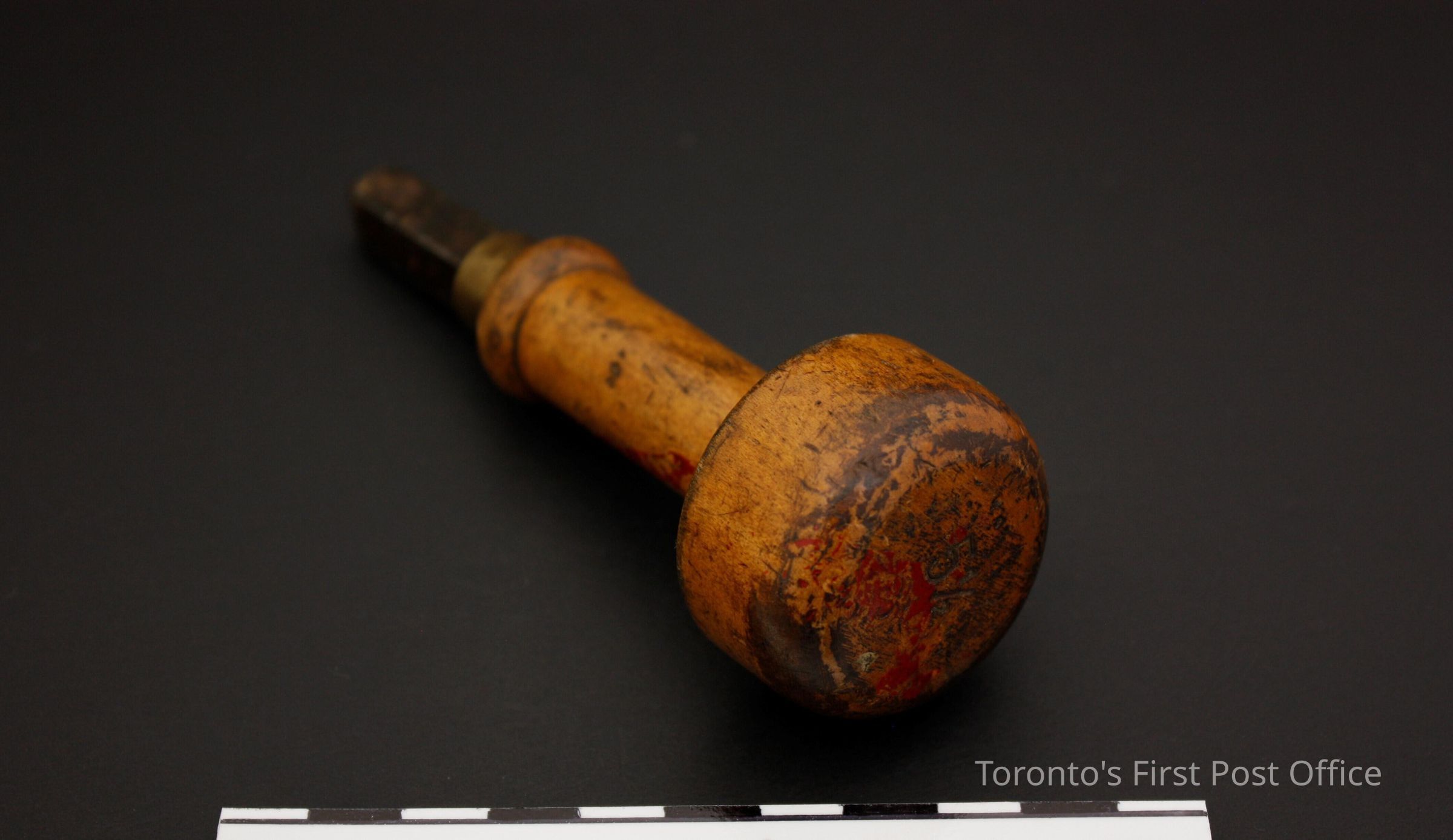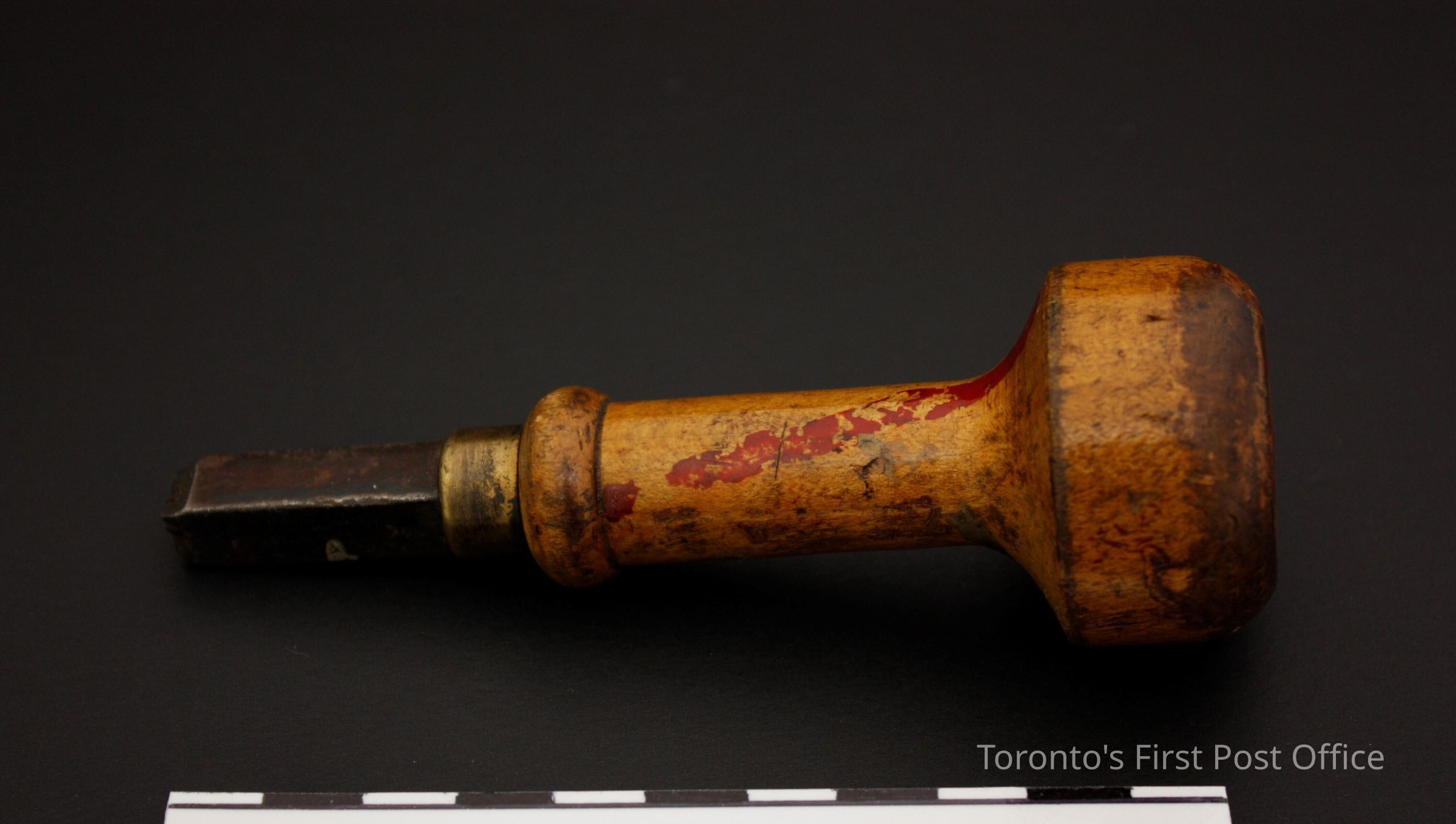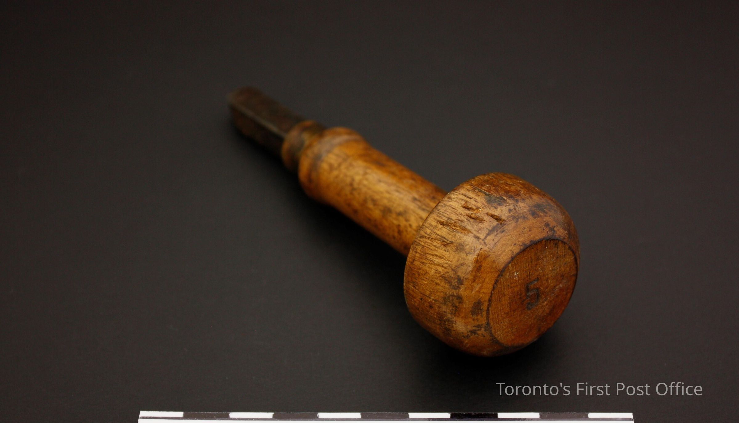 Four hand stamps; all with wooden handles; brass collars; steel markers; each has marker number on top of handle; stamp impressions as follows: .1: "1 1/8"; .2: "5"; also marked "WARRA…" on side of marker; .3: "5 1/2" with red line of paint on handle; .4: "5 1/2".Dimensions