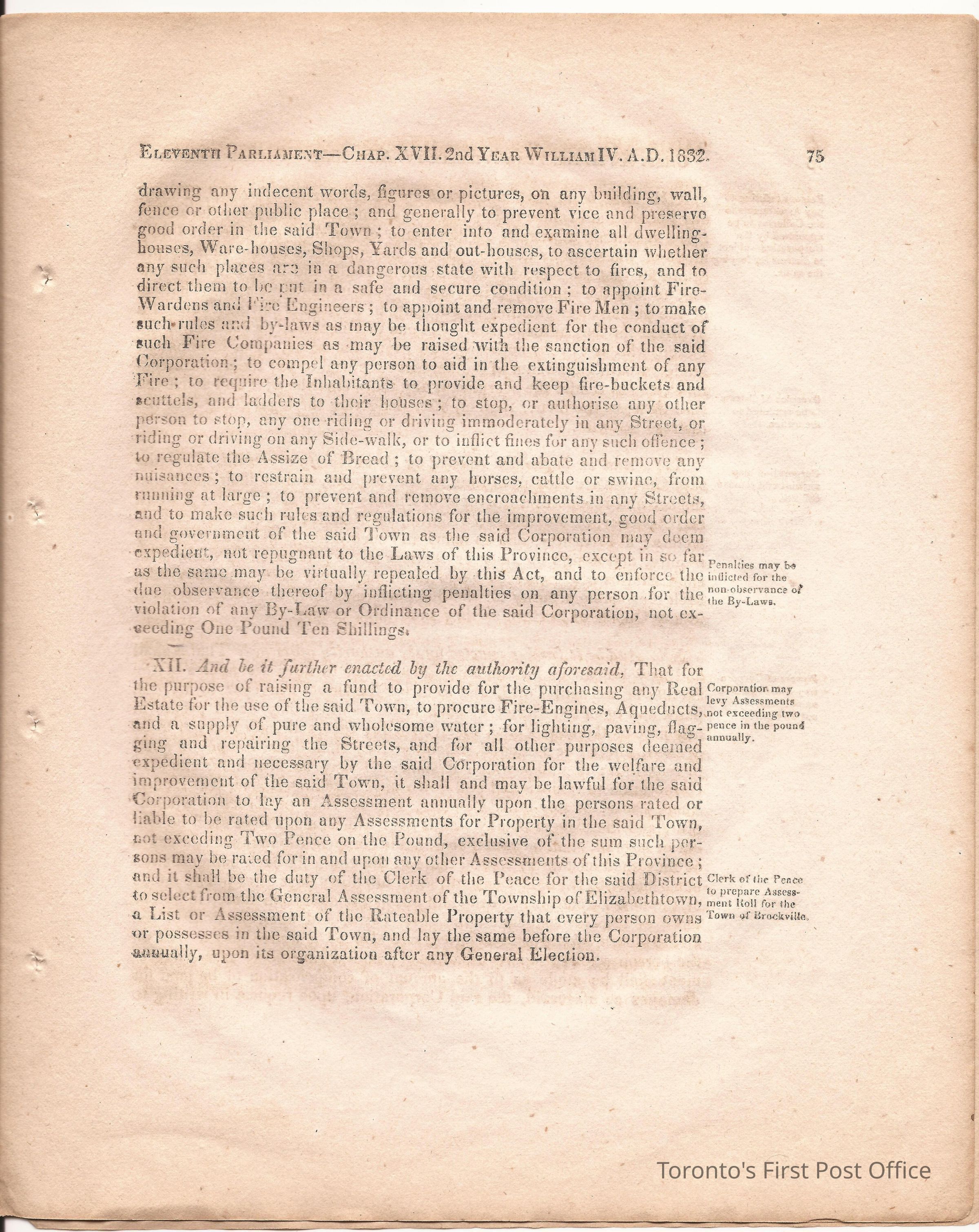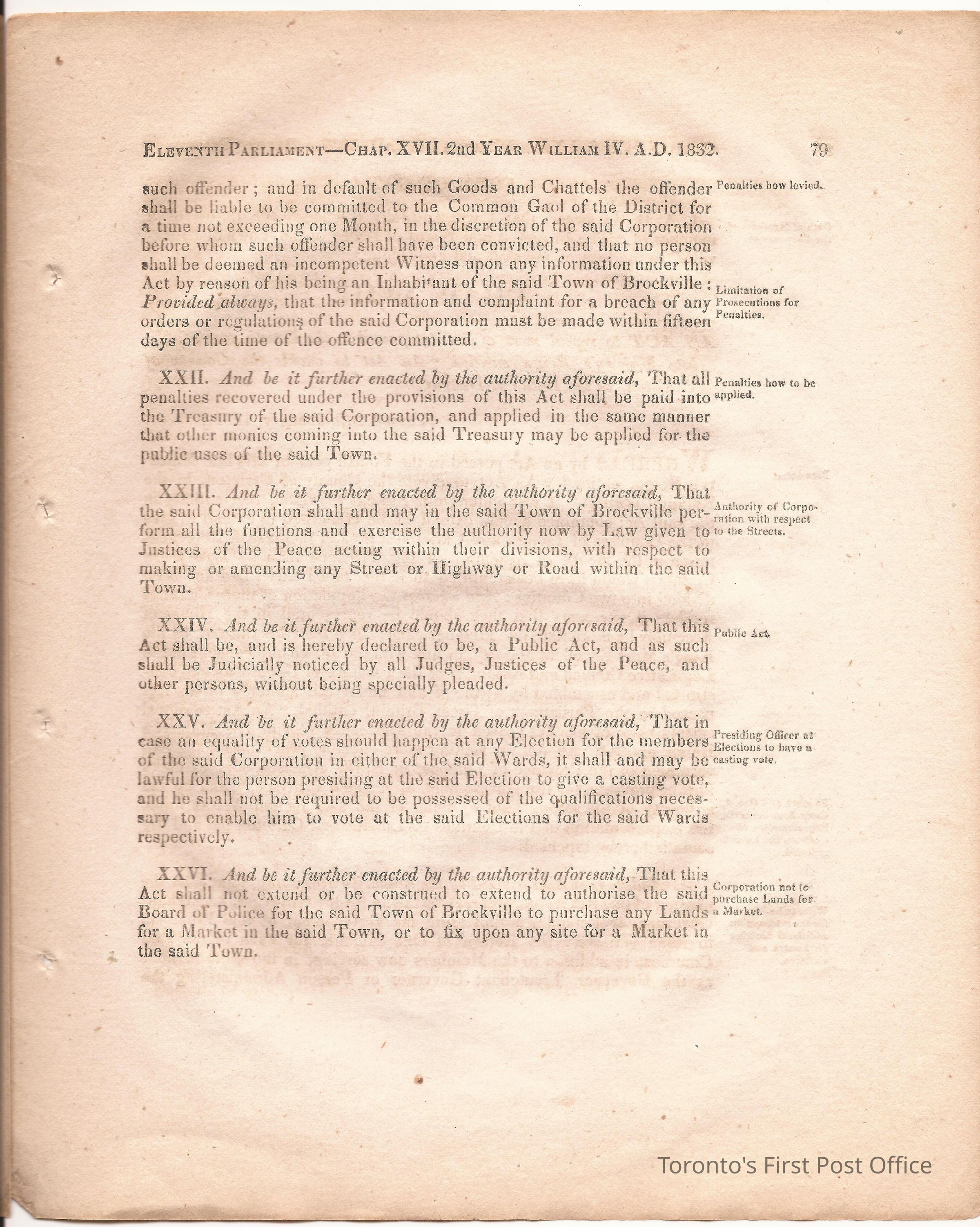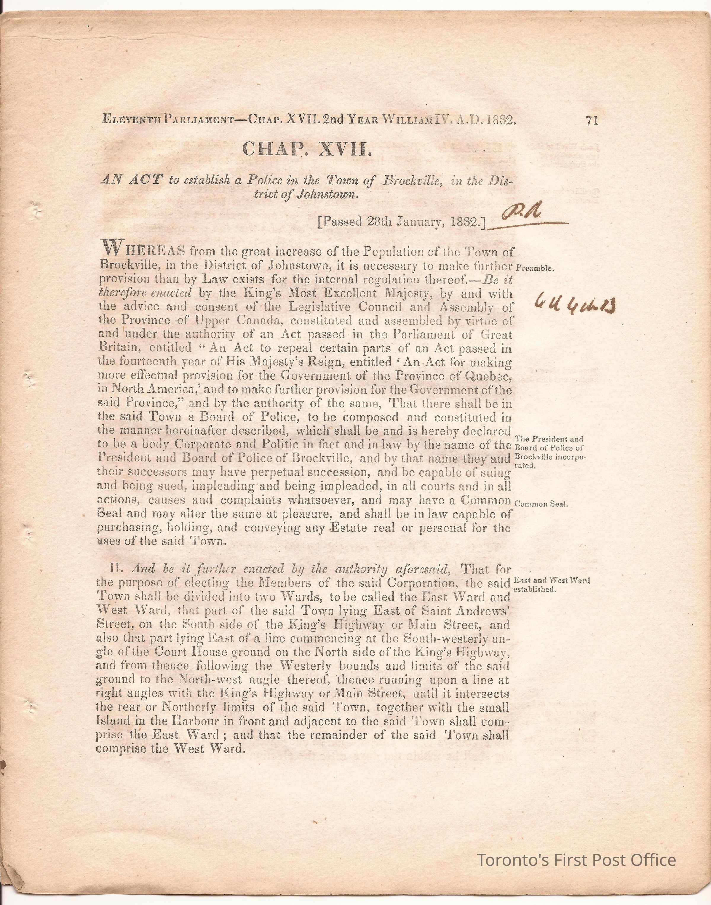 Statute; chapter XVII "An Act to establish a Police in the Town of Brockville in the District of Johnstown"; passed 28 Jan 1832; pages 71-80 (part of larger book); was cotton bound, now loose.Dimensions