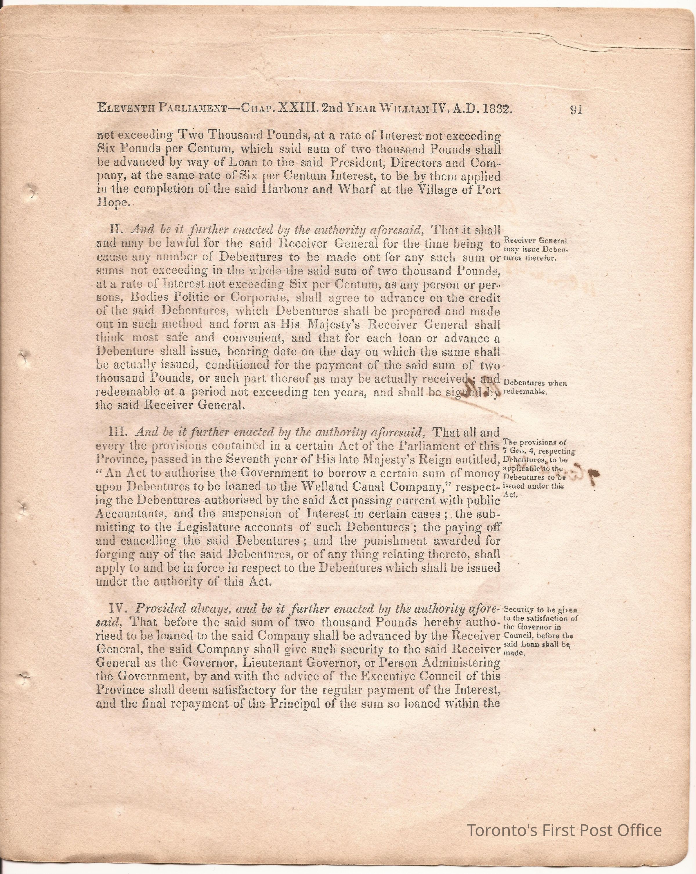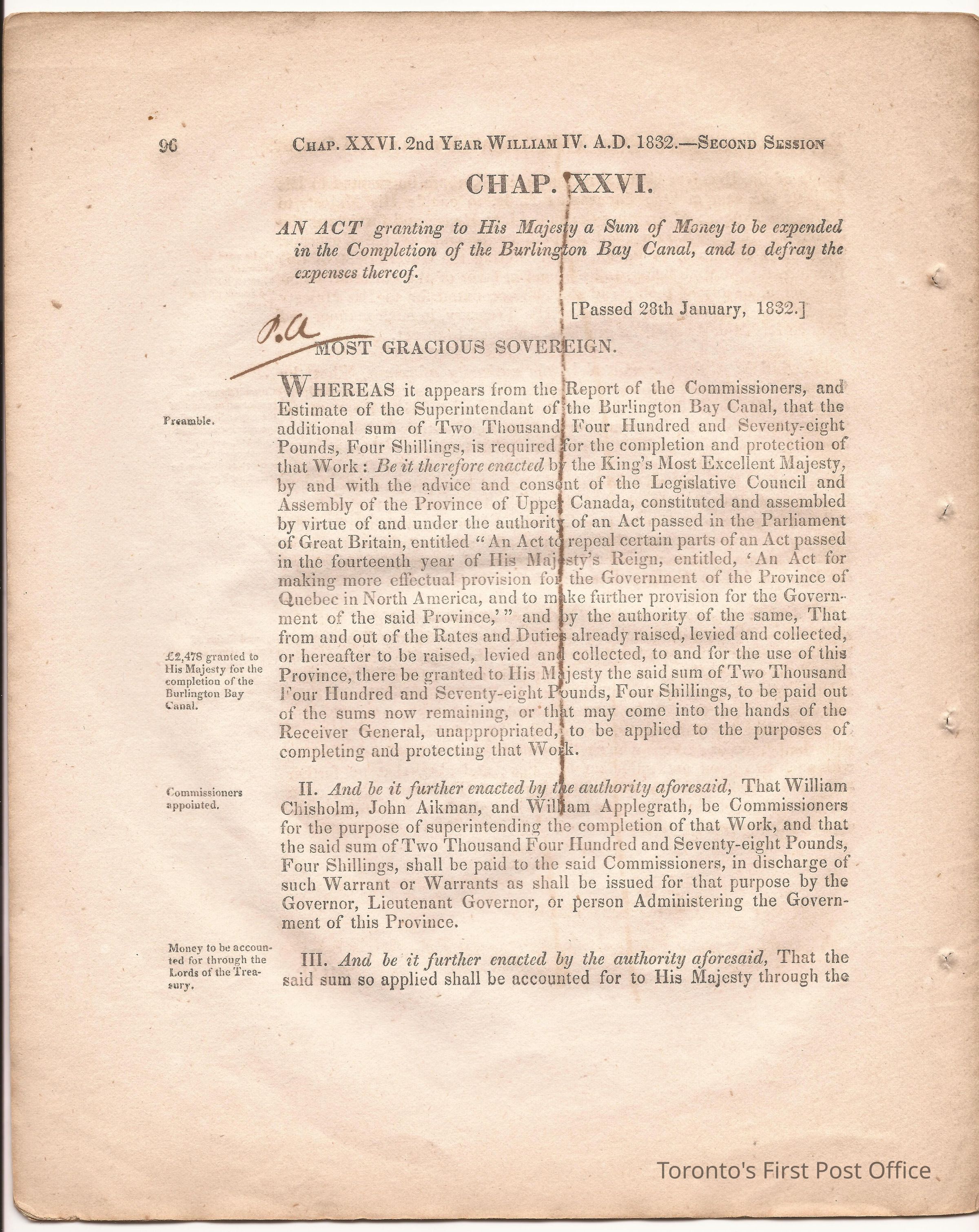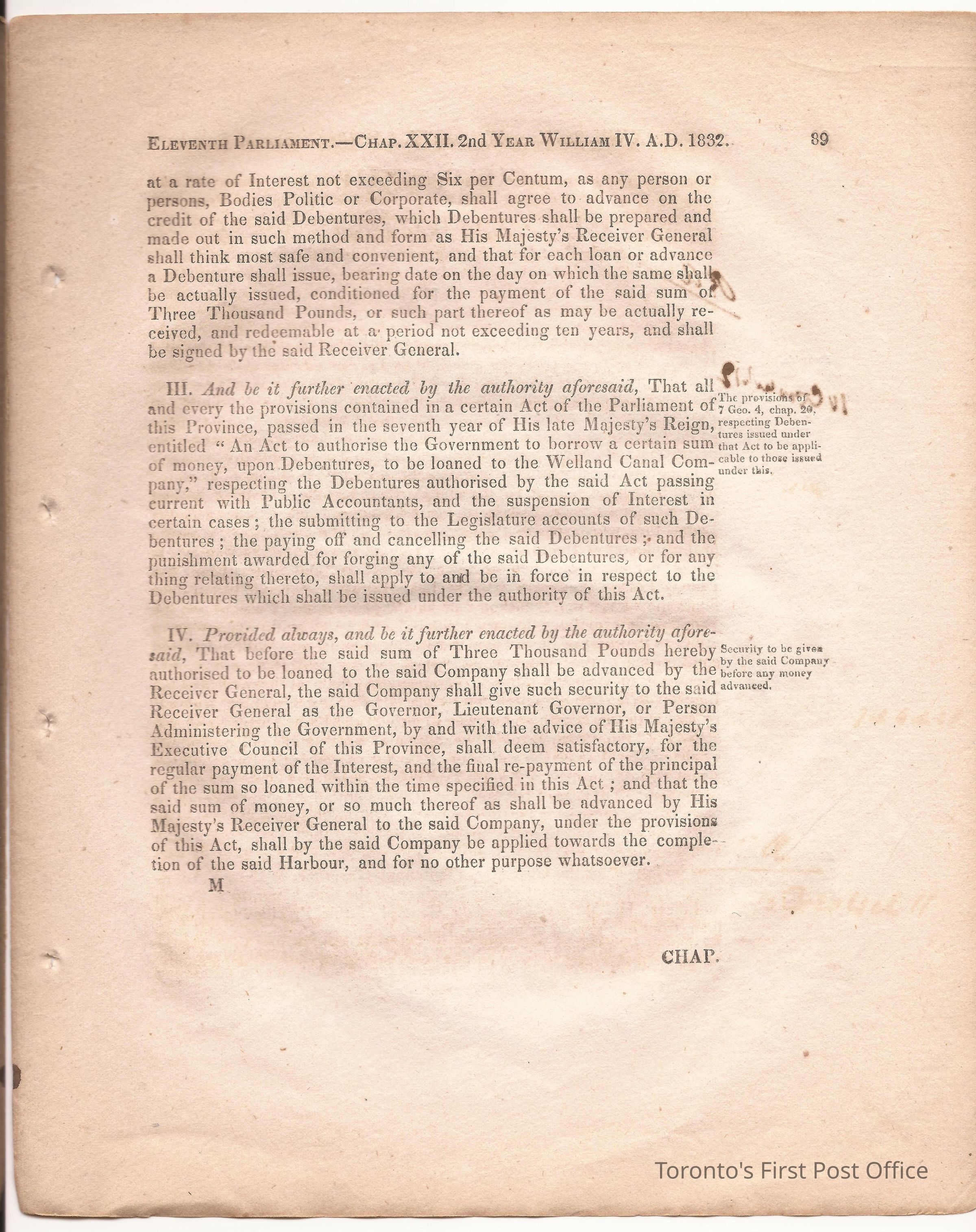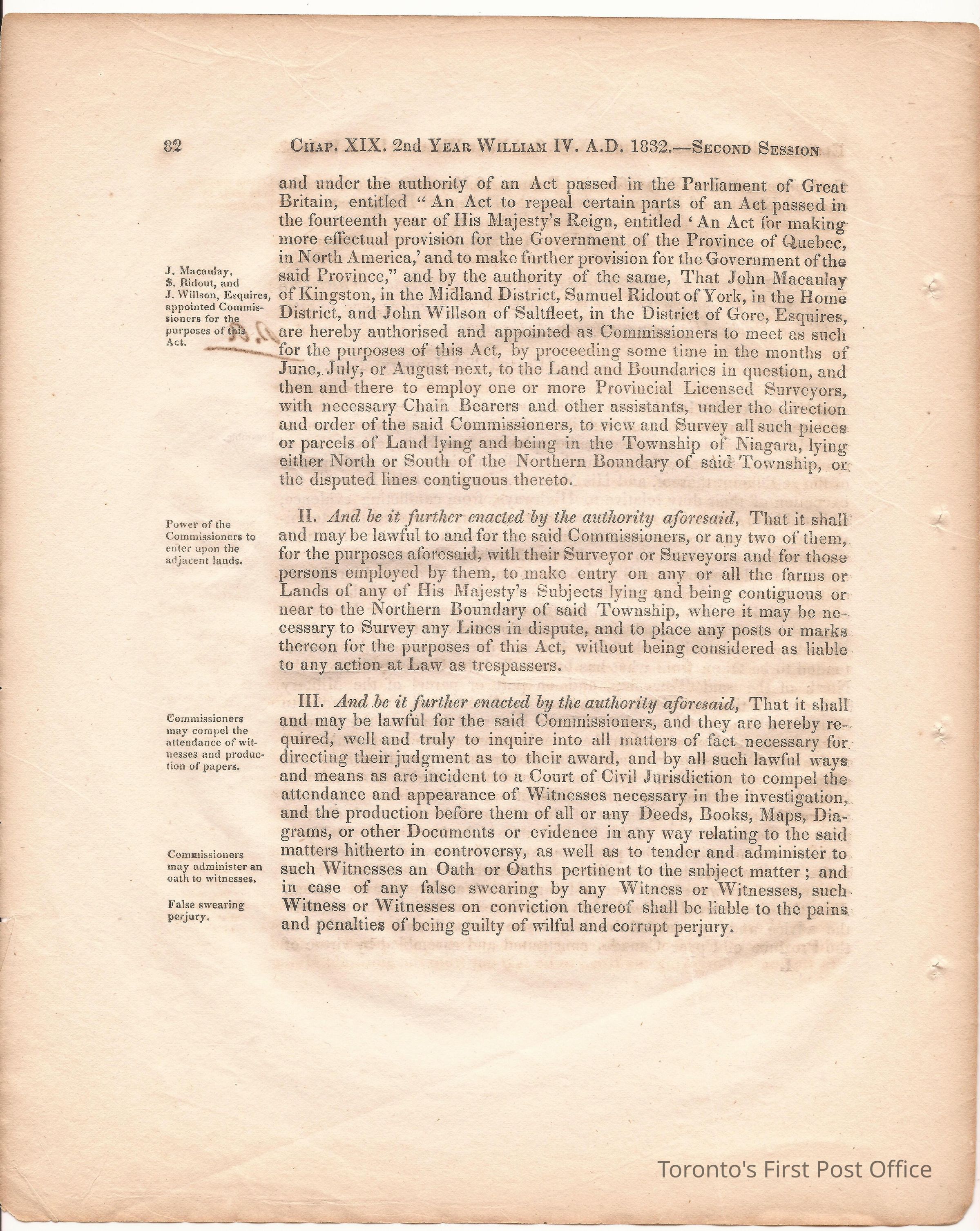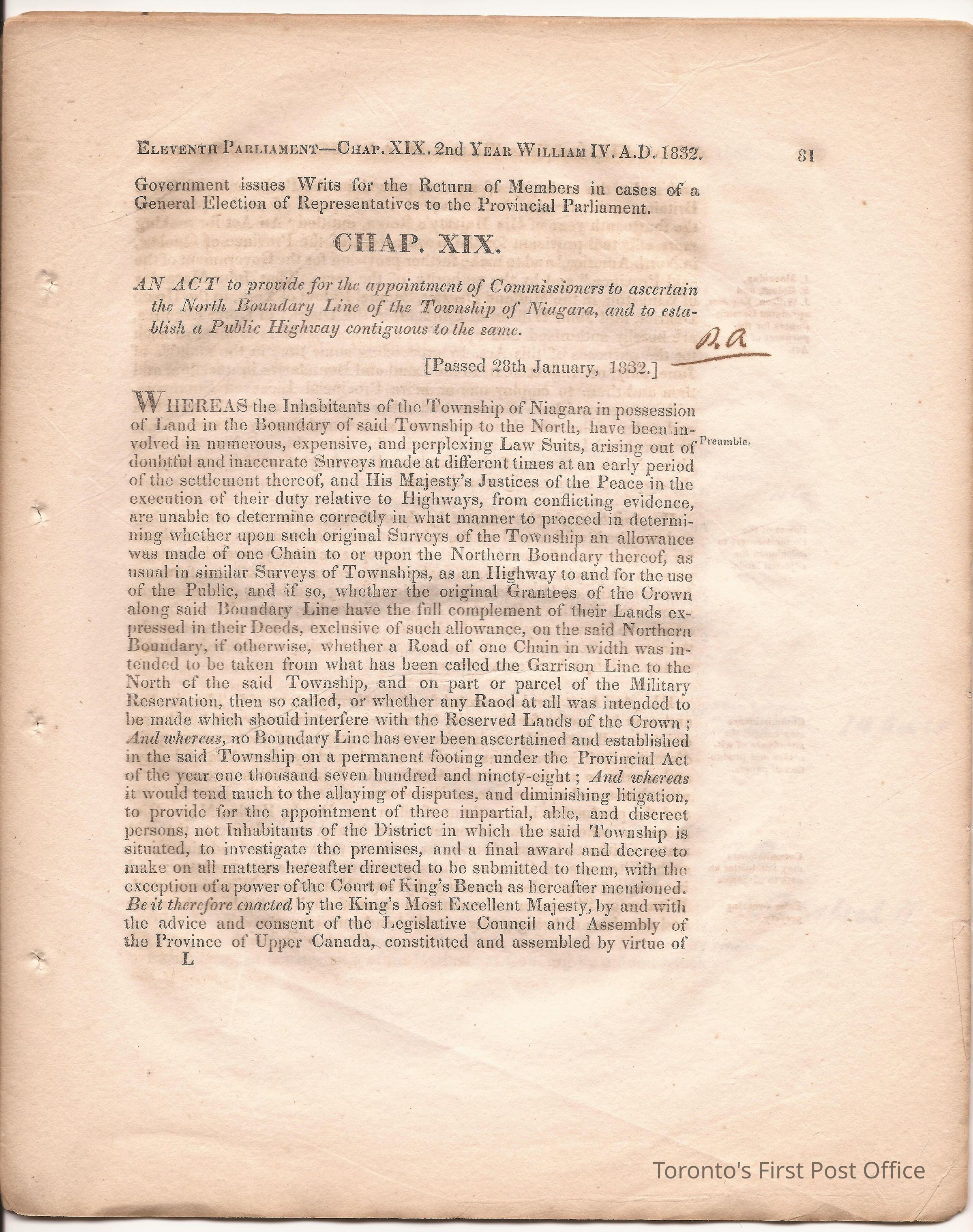 Statute; chapter XIX "… to ascertain the N. Boundary Line of the Township of Niagara and to establish a Public Highway…"; pages 81-106 (part of larger book); was cotton bound, now loose; some inked notations and marks.Dimensions