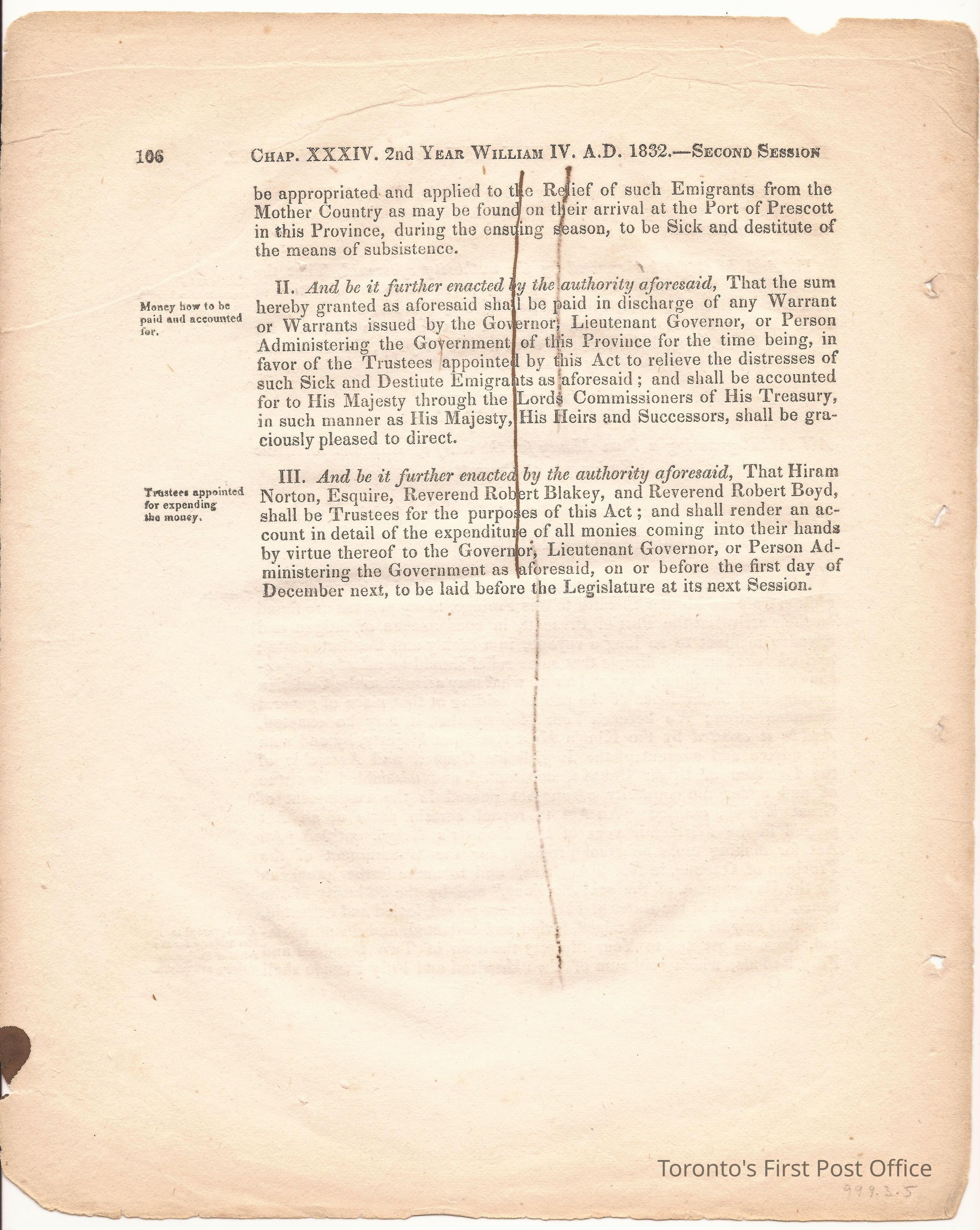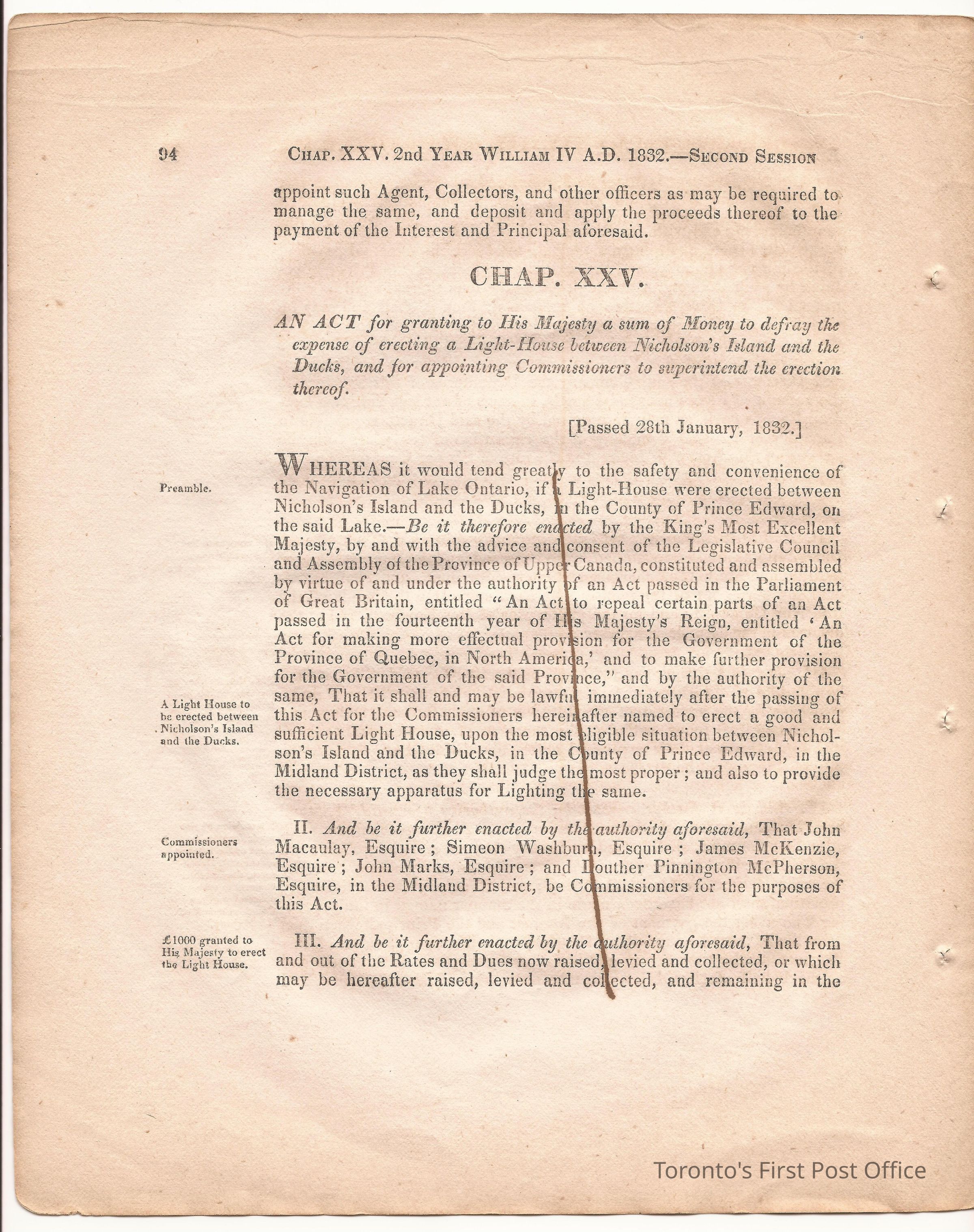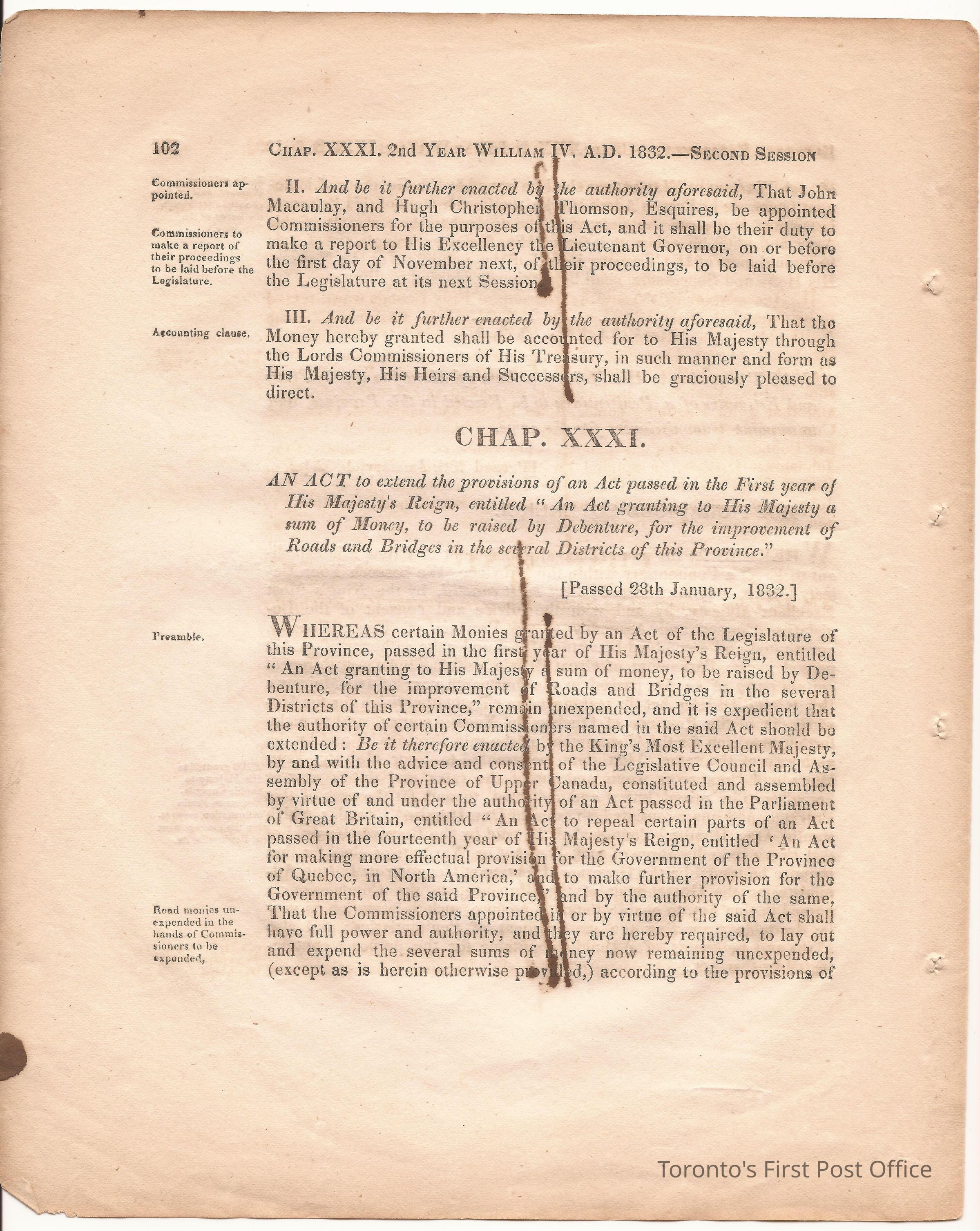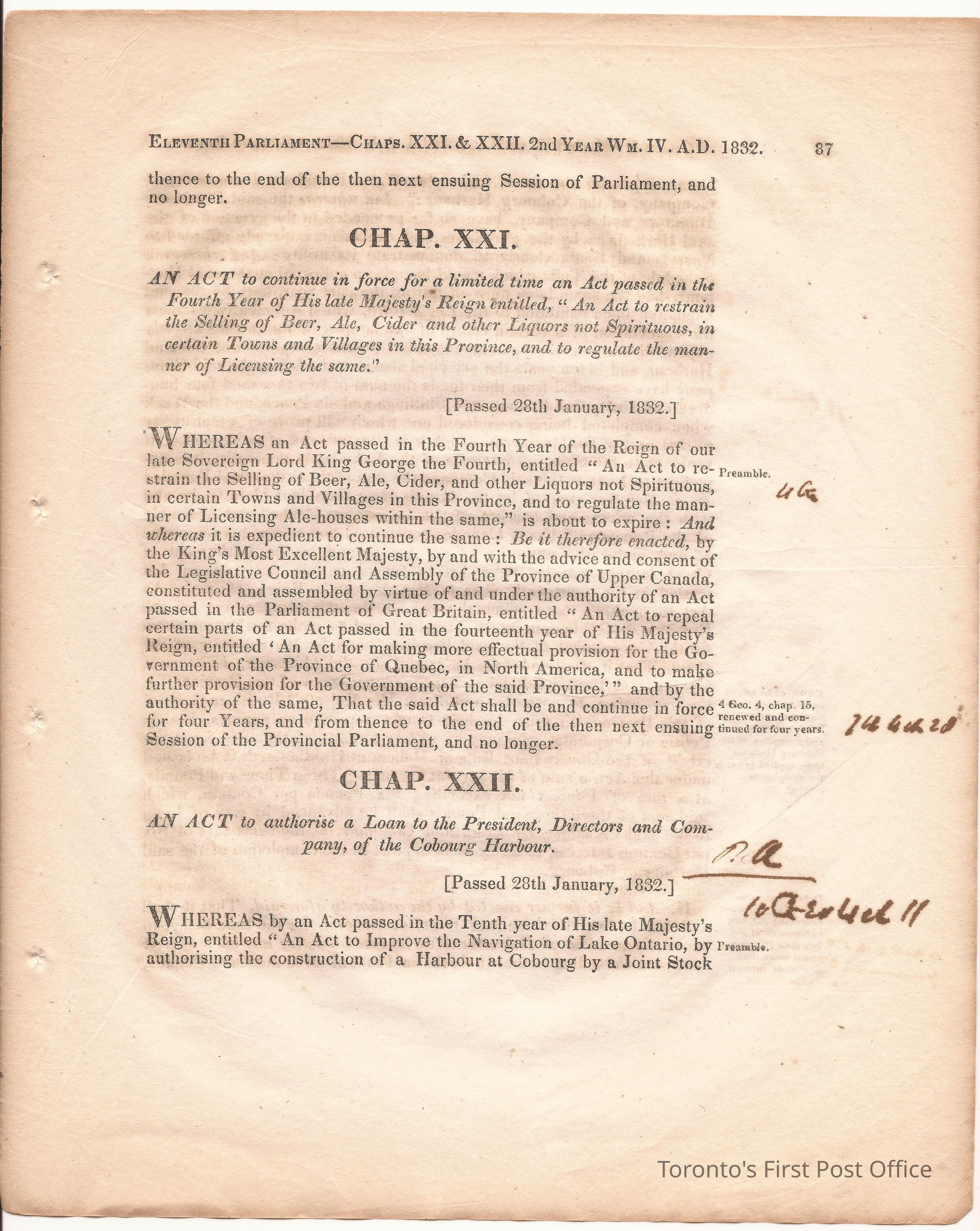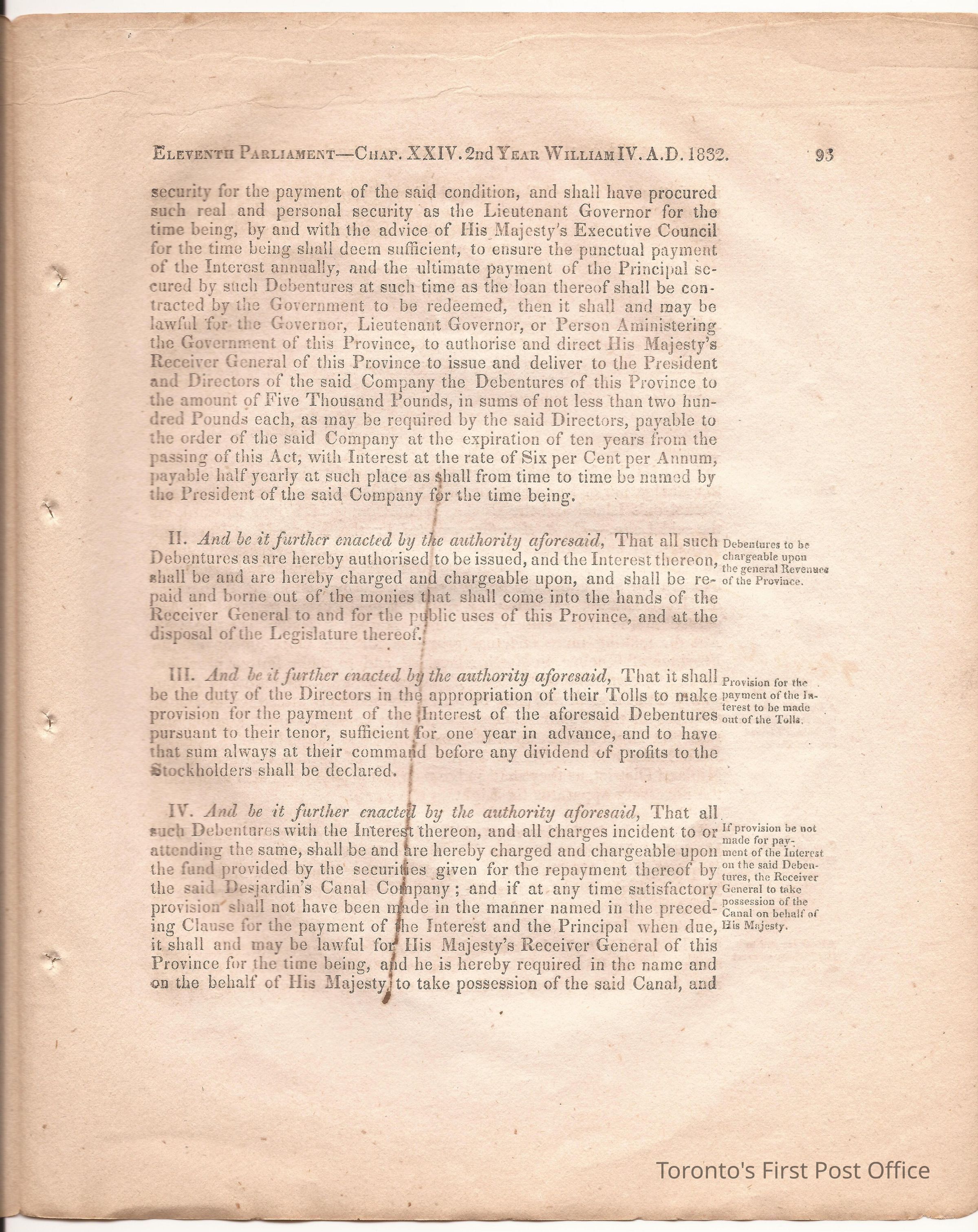 Statute; chapter XIX "… to ascertain the N. Boundary Line of the Township of Niagara and to establish a Public Highway…"; pages 81-106 (part of larger book); was cotton bound, now loose; some inked notations and marks.Dimensions