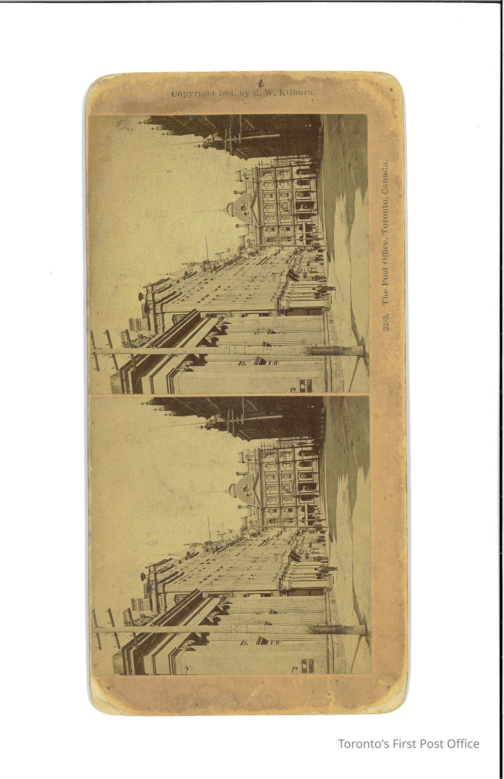 Two sepia photographic images taken at two slightly different perspectives; labelled "9385, The Post Office, Toronto, Canada." and "Copyright 1894, by B.W. Kilburn"; labelled "Photographed and Published by B.W. Kilburn, = Littleton, N.H." on reverse; all printing in black; photographs are of post office and street with few pedestrians.Update Date